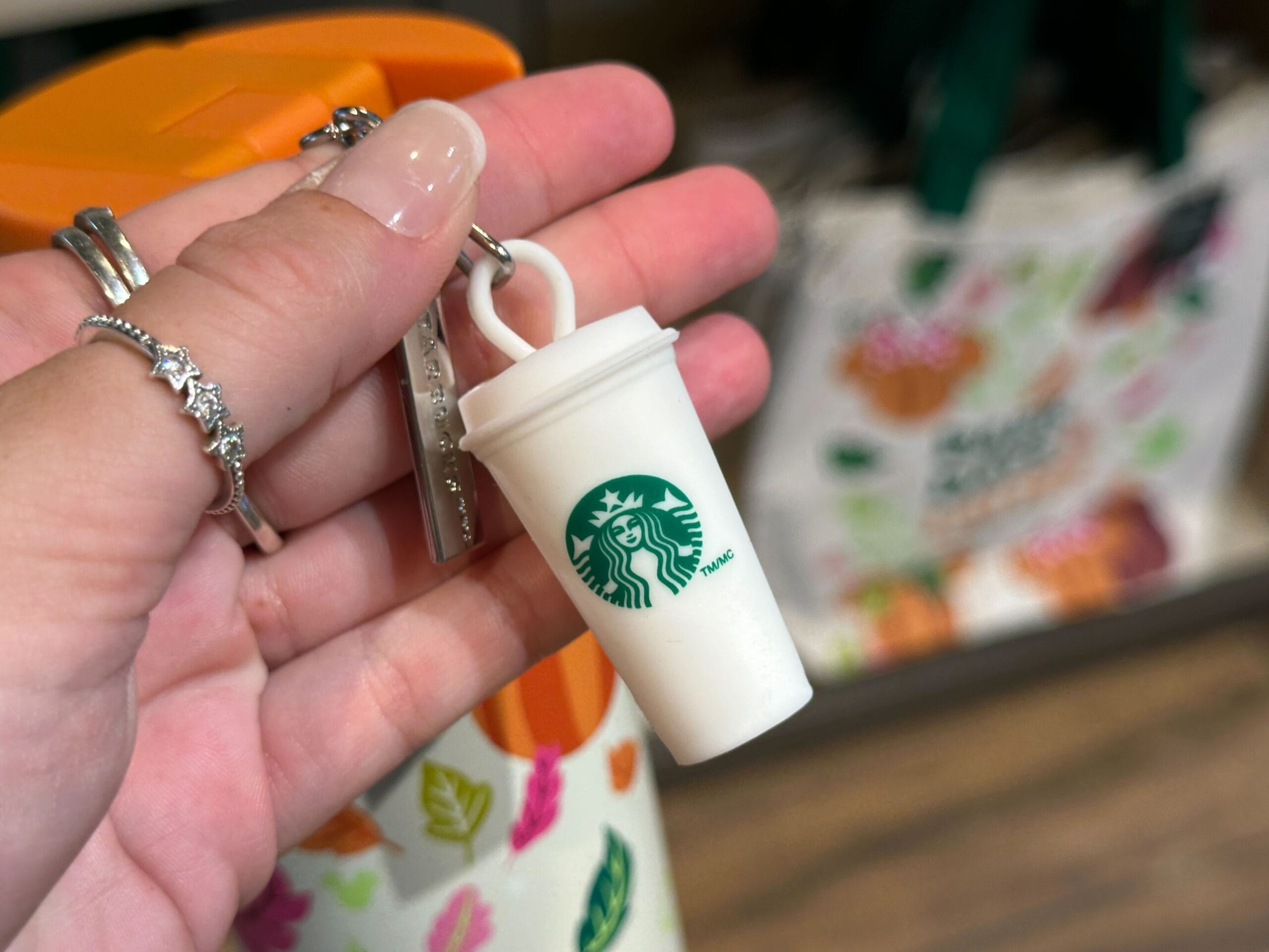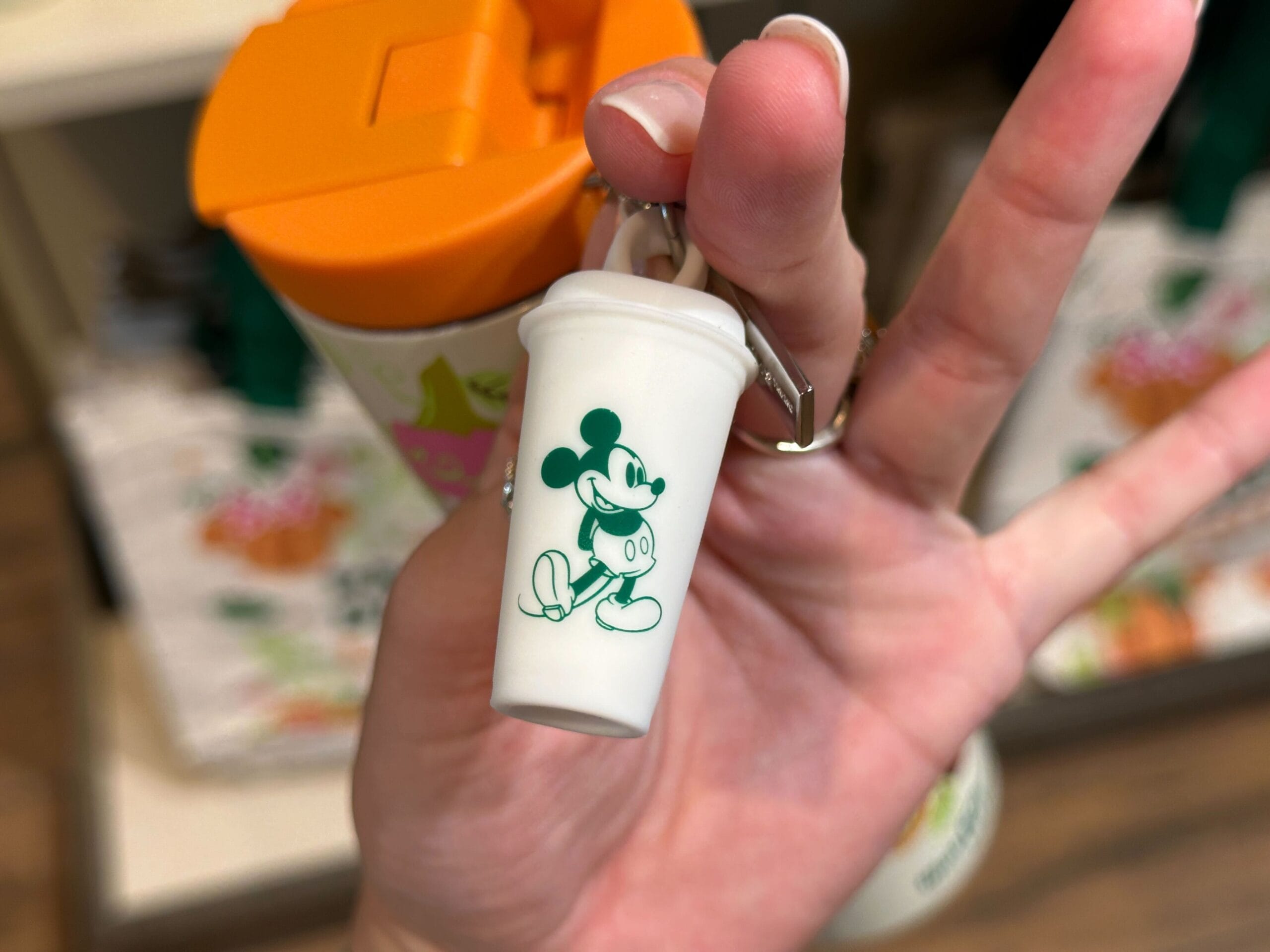 The lid for this tumbler is orange, and it comes with a Starbucks cup charm with the Starbucks mermaid icon on one side and Mickey Mouse on the other.