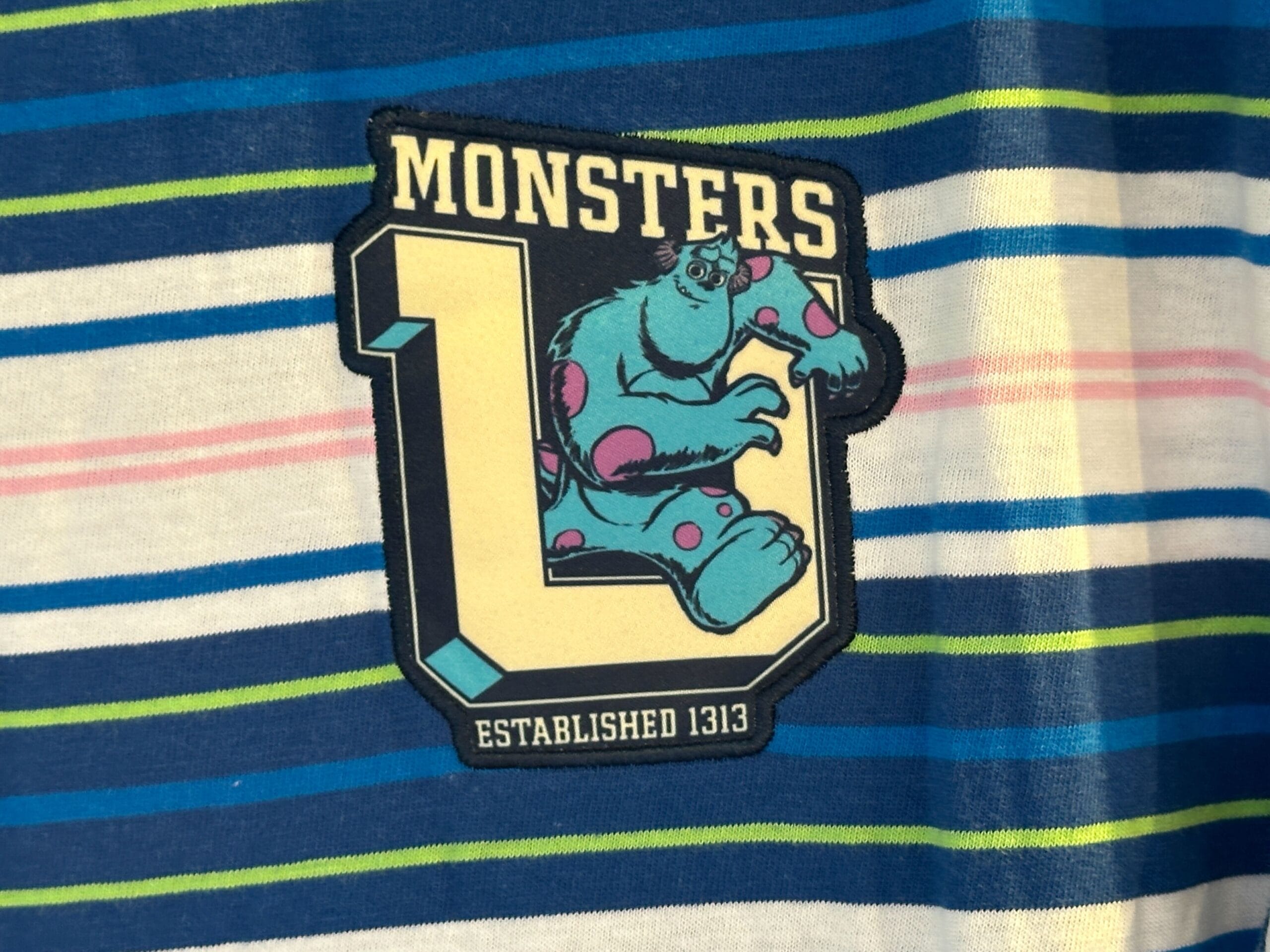 This shirt has white, blue, green, and pink horizontal stripes of various sizes. A Monsters University patch on the left chest features Sulley jumping through the “U.” It indicates the school was established in 1313. The crew neck has dark blue trim.