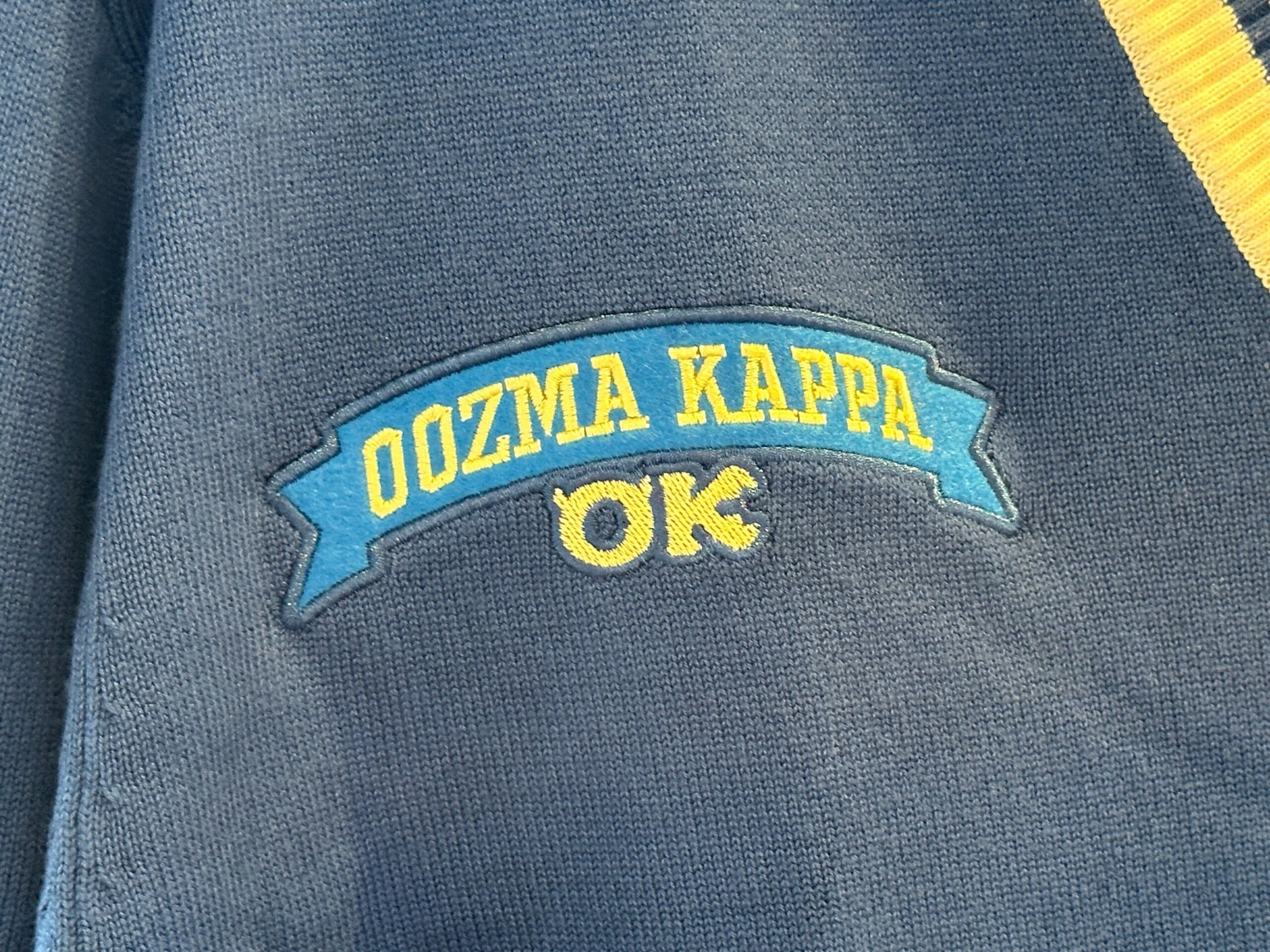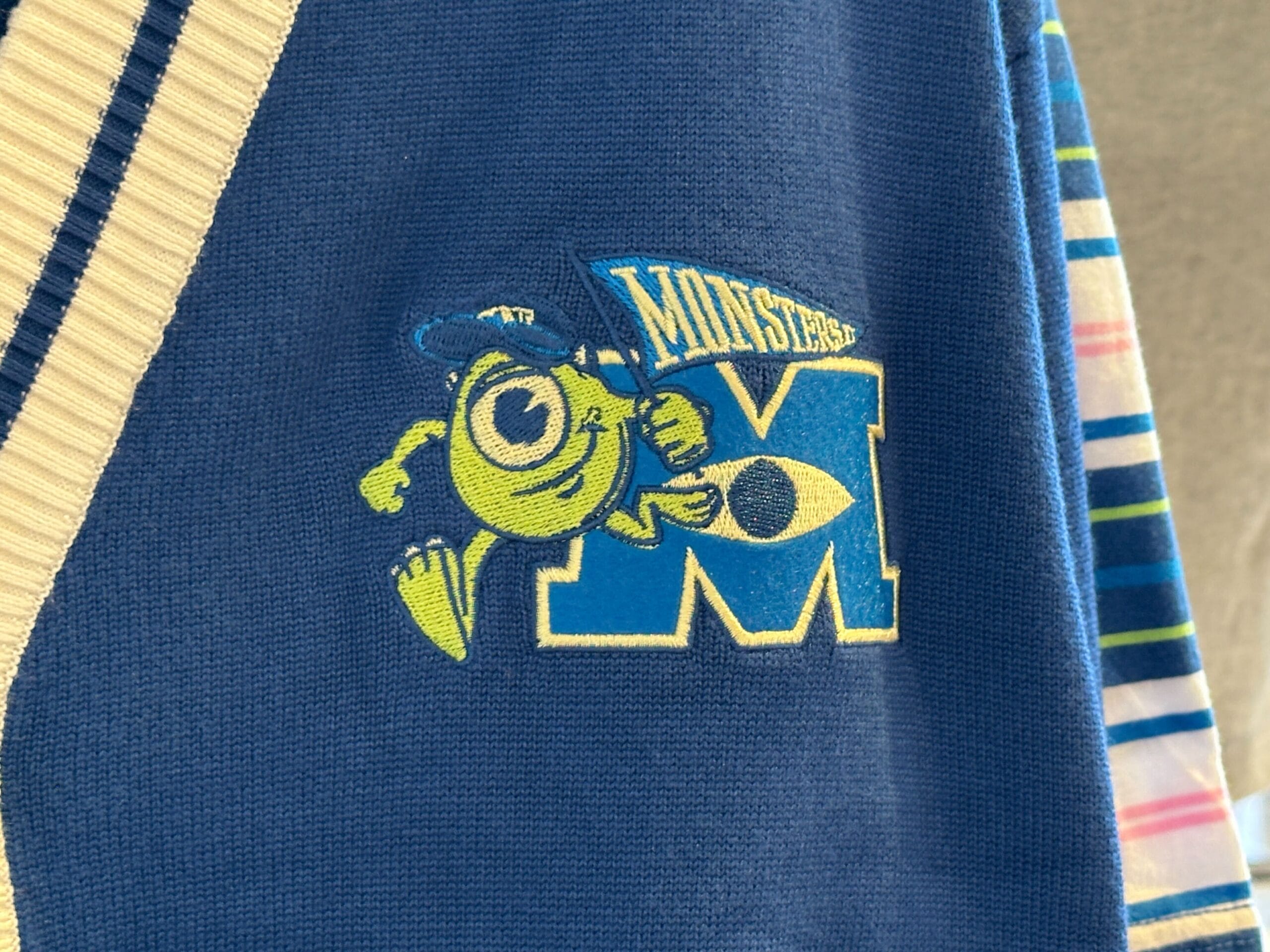 Oozma Kappa OK embroidery is on the right chest. Mike is pictured on the left chest with a “Monsters U” pennant and the Monsters, Inc. logo.