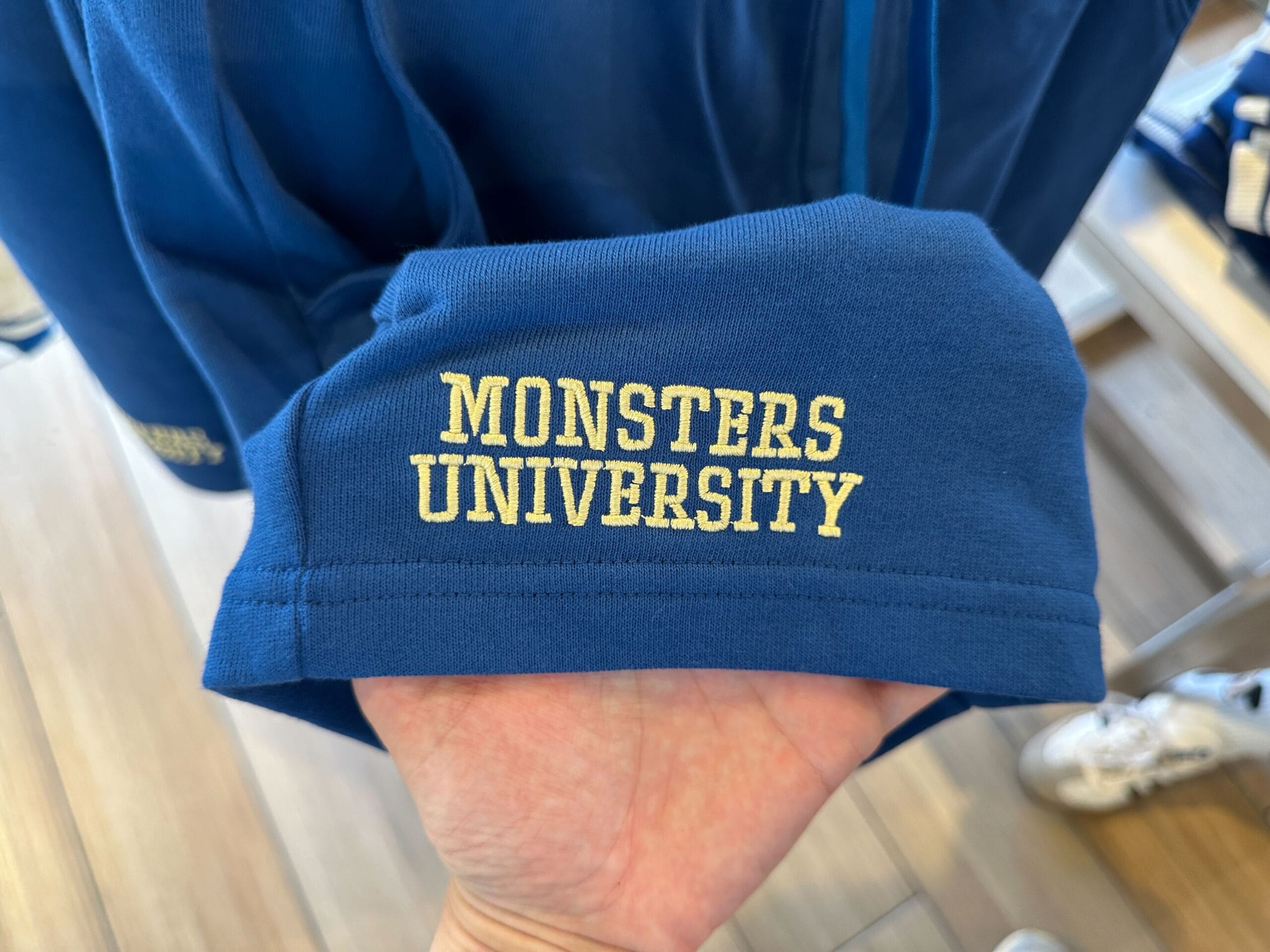 The right leg has “Monsters University” embroidered in white at the hem. The left leg features the artwork of Mike and the Monsters, Inc. logo.