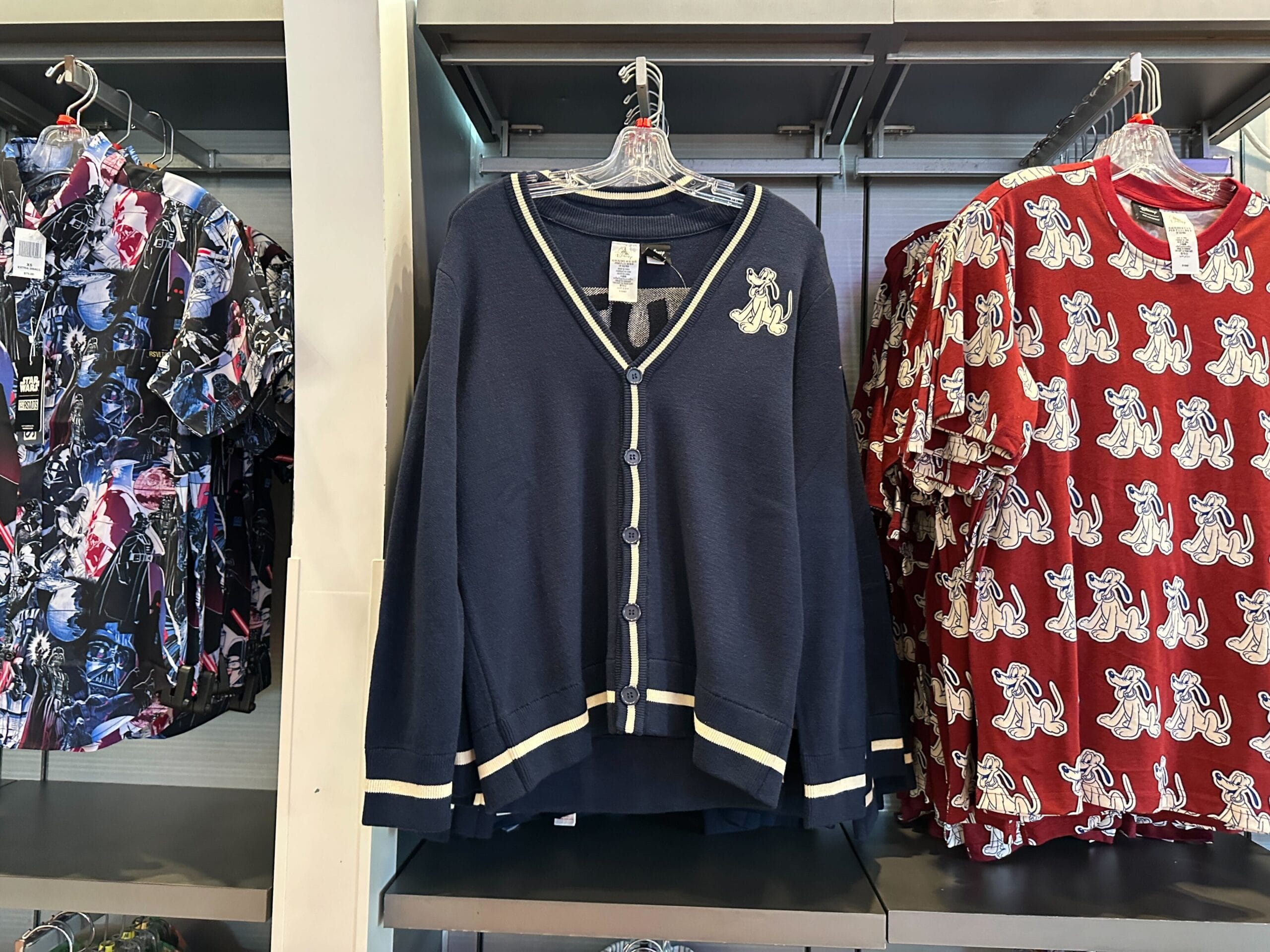 This dark blue cardigan features white trim around the V-neck, hem, and cuffs. Blue buttons are down the chest. A white Pluto appliqué is on the left chest.