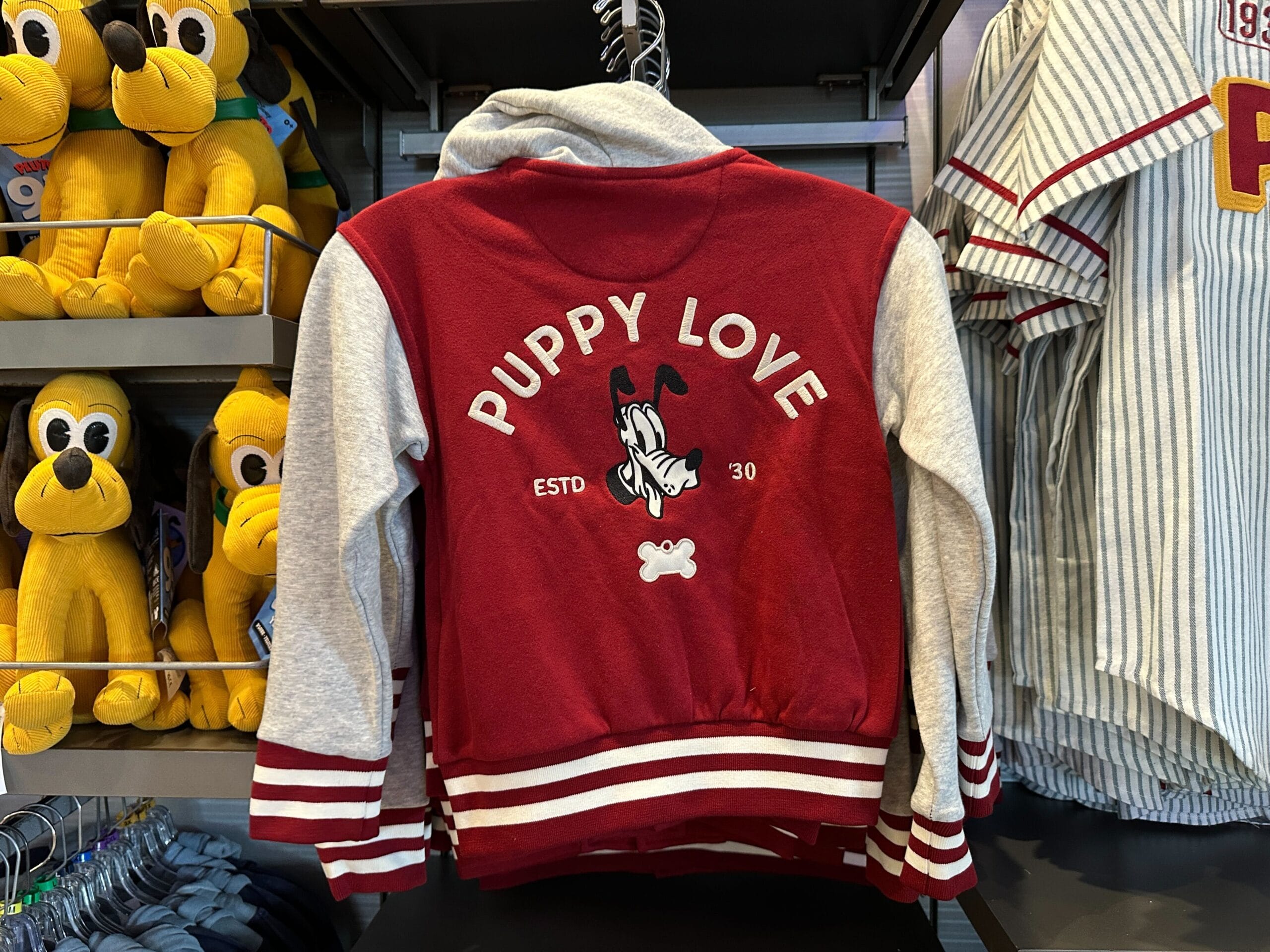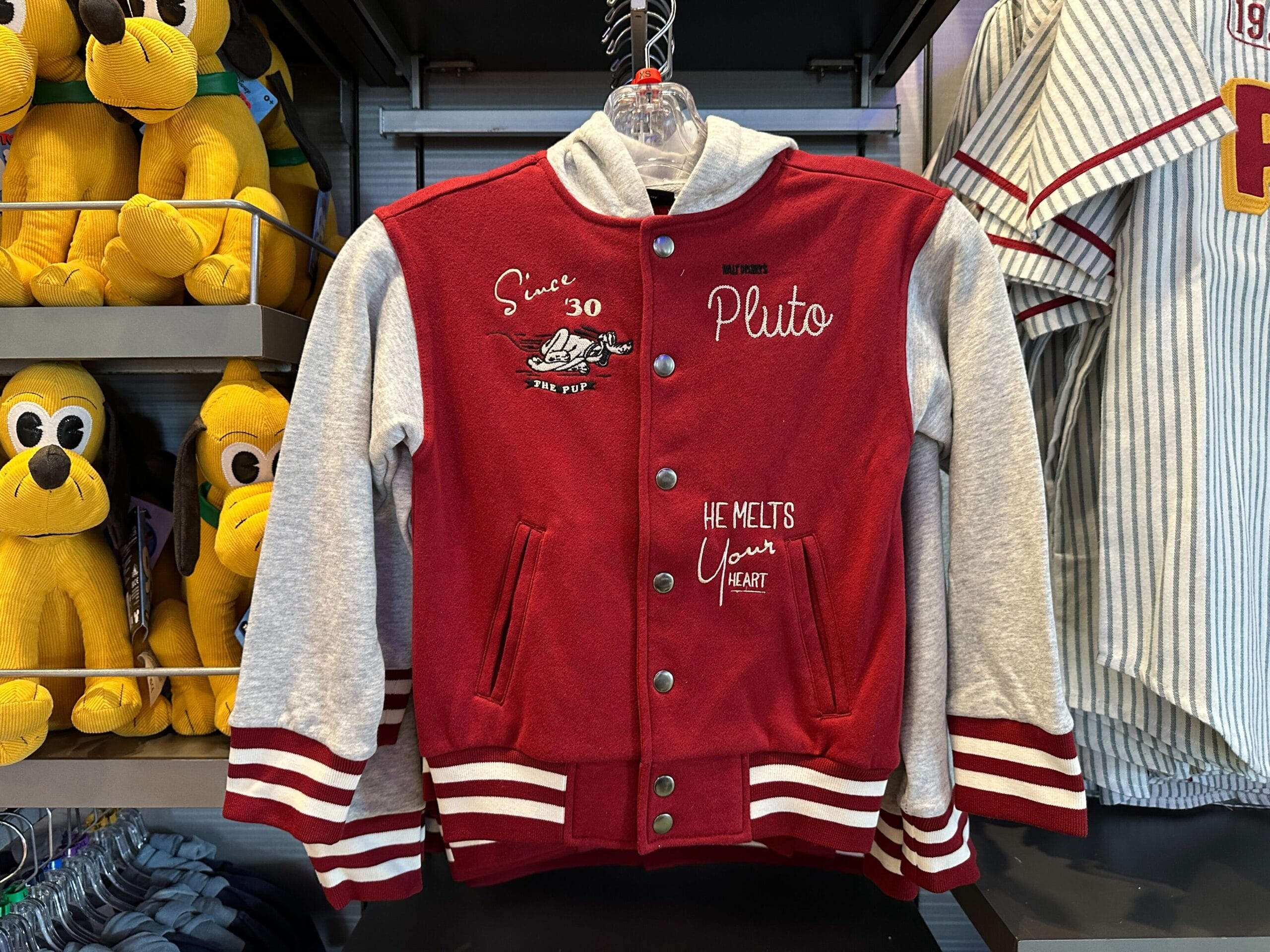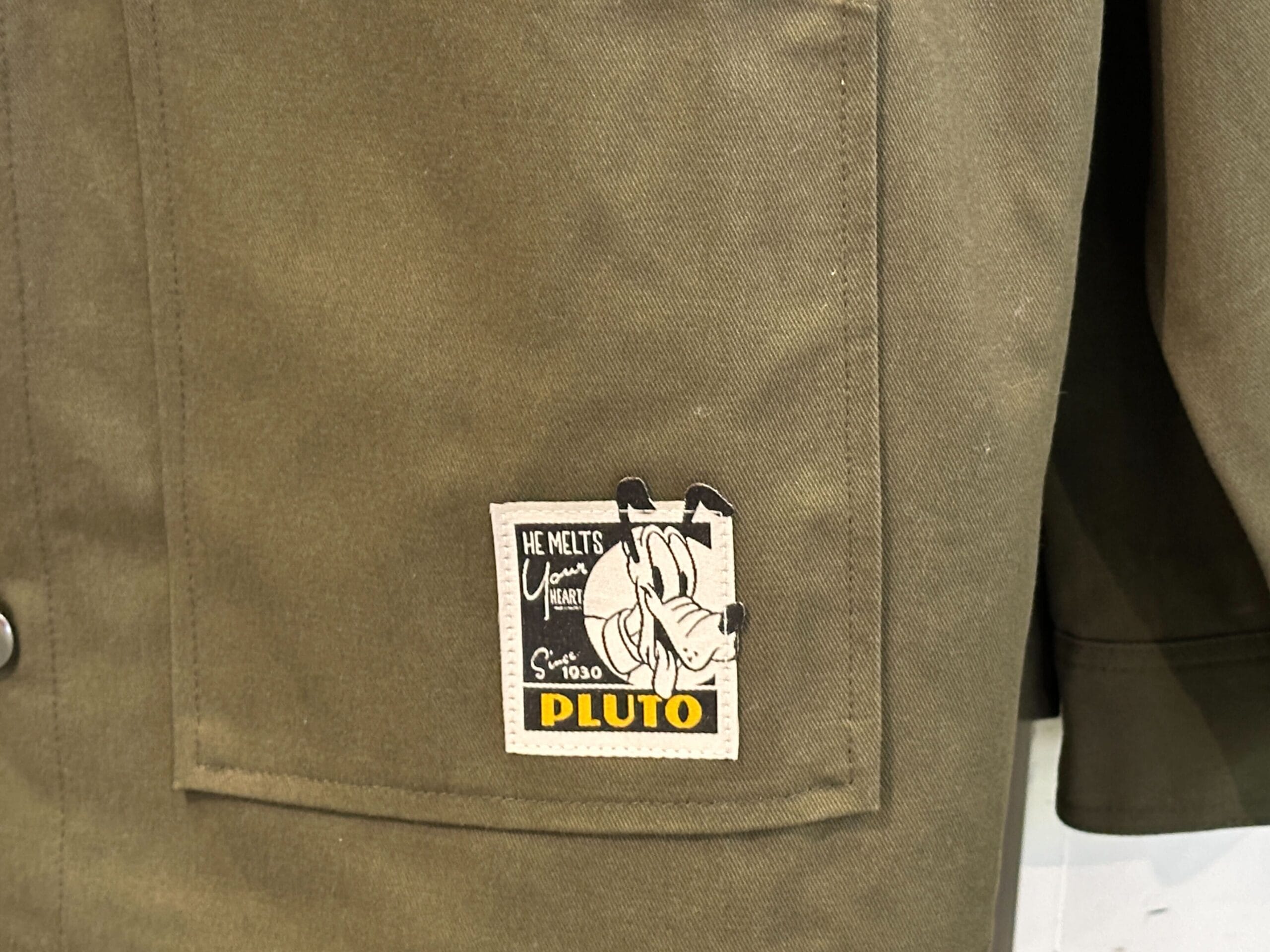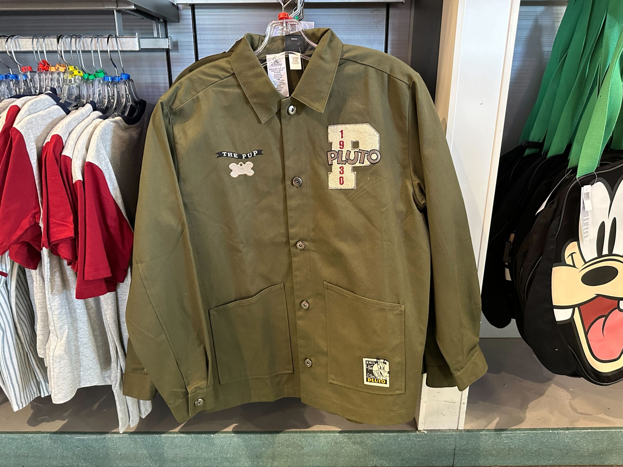 On the chest, white embroidery reads, “He melts your heart,” “Since ’30,” “The Pup,” and “Pluto.” An appliqué of Pluto running is on the right chest. The buttons are silver and there are two pockets.