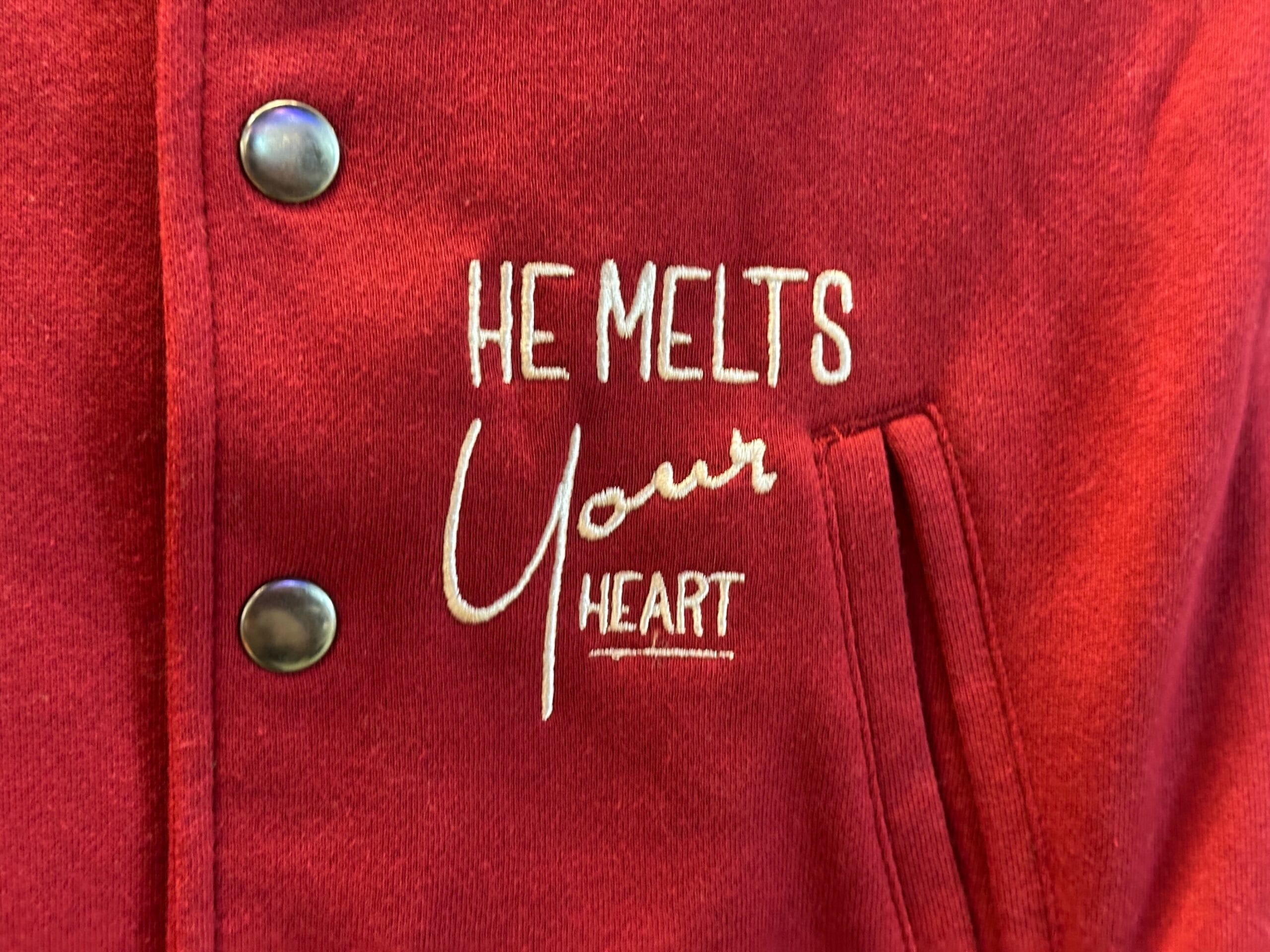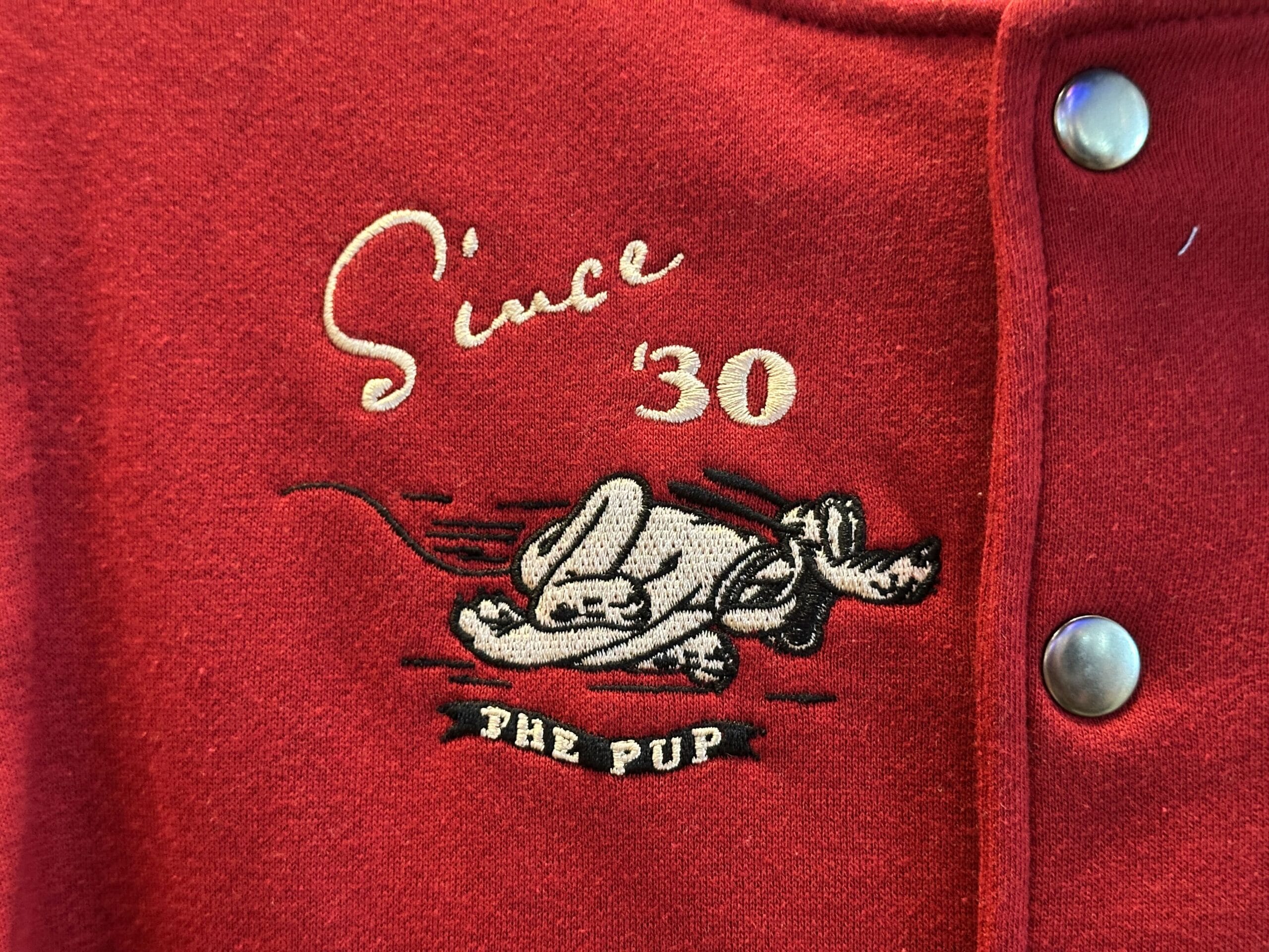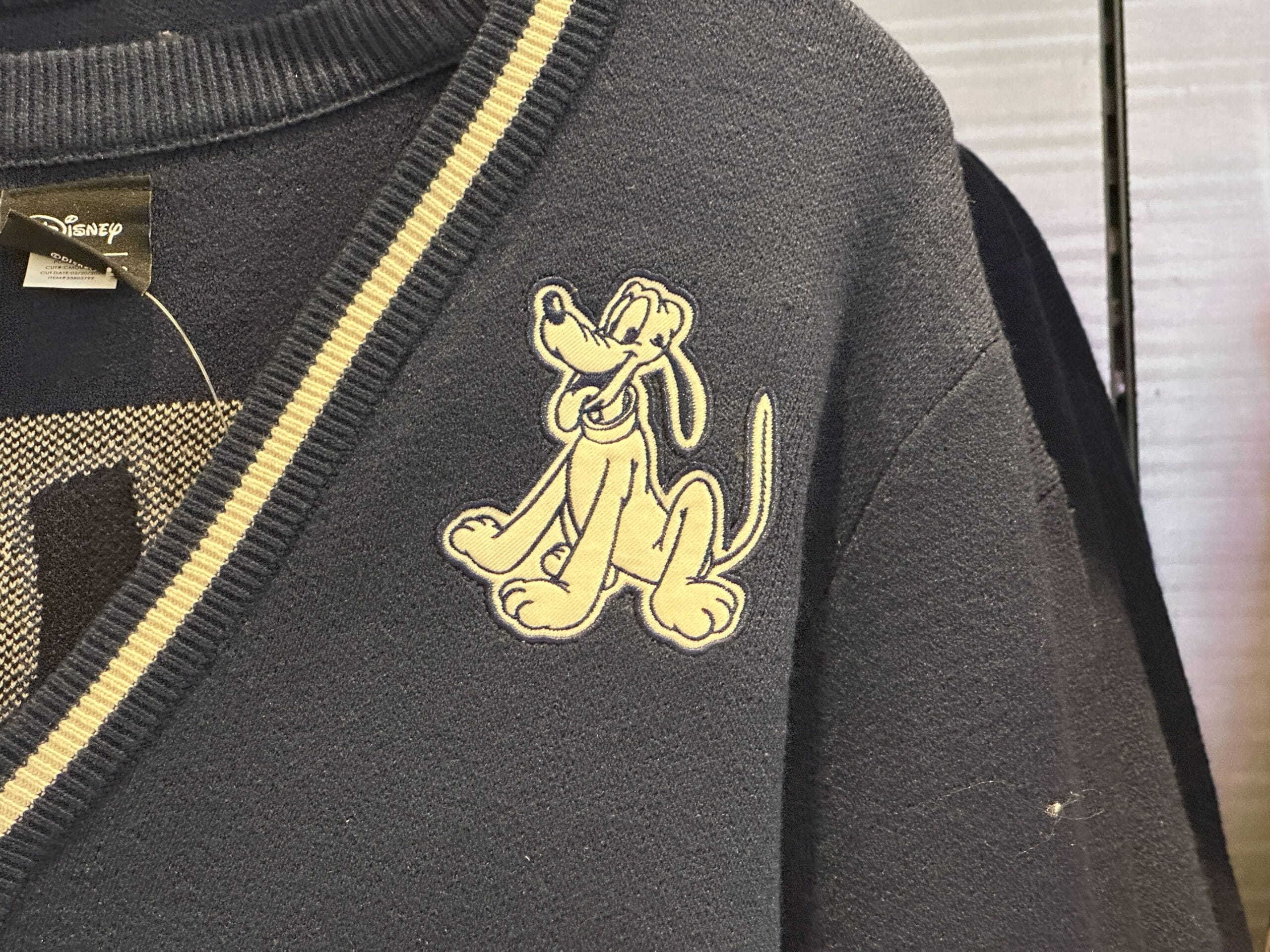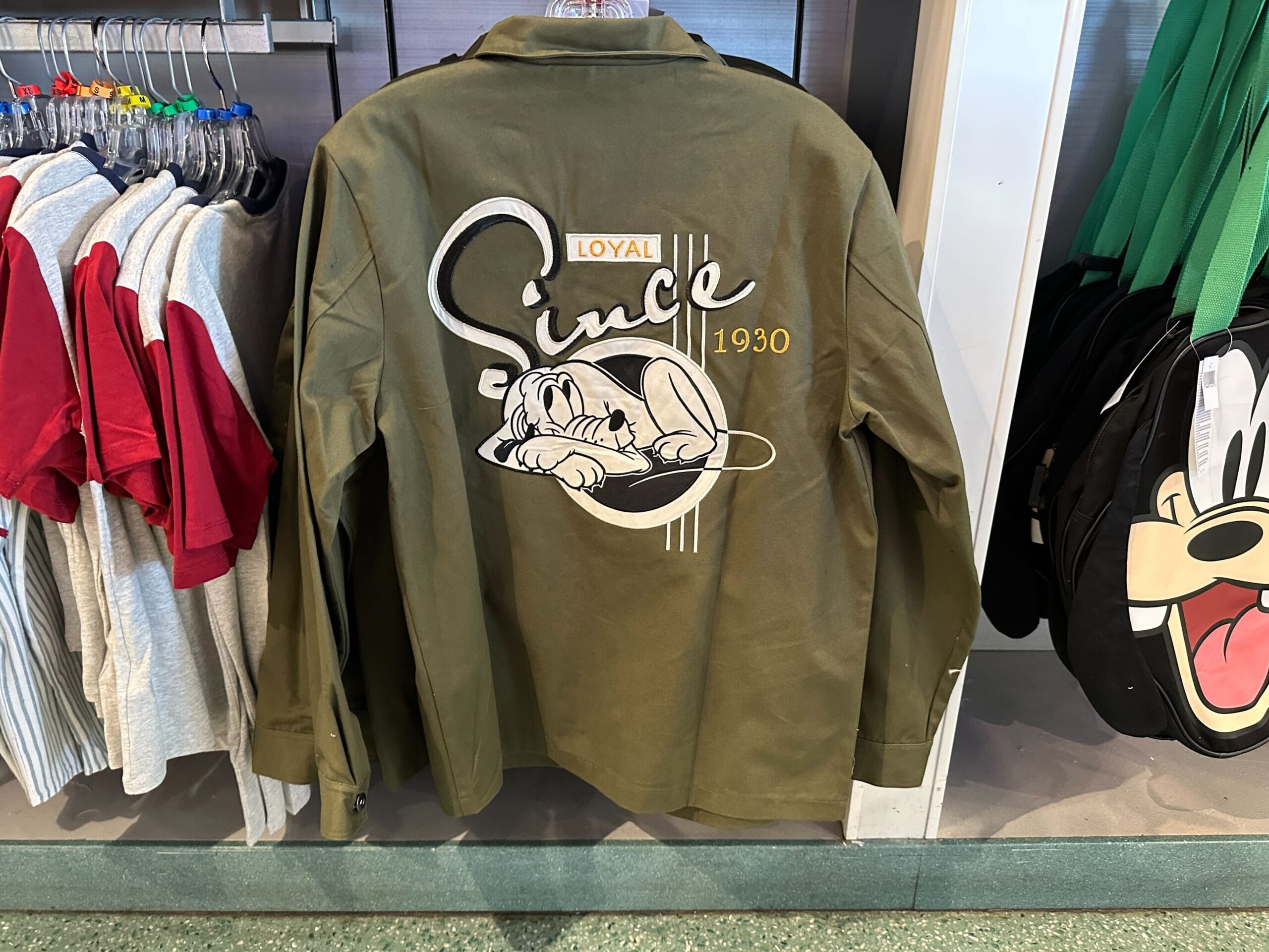 On the chest, white embroidery reads, “He melts your heart,” “Since ’30,” “The Pup,” and “Pluto.” An appliqué of Pluto running is on the right chest. The buttons are silver and there are two pockets.