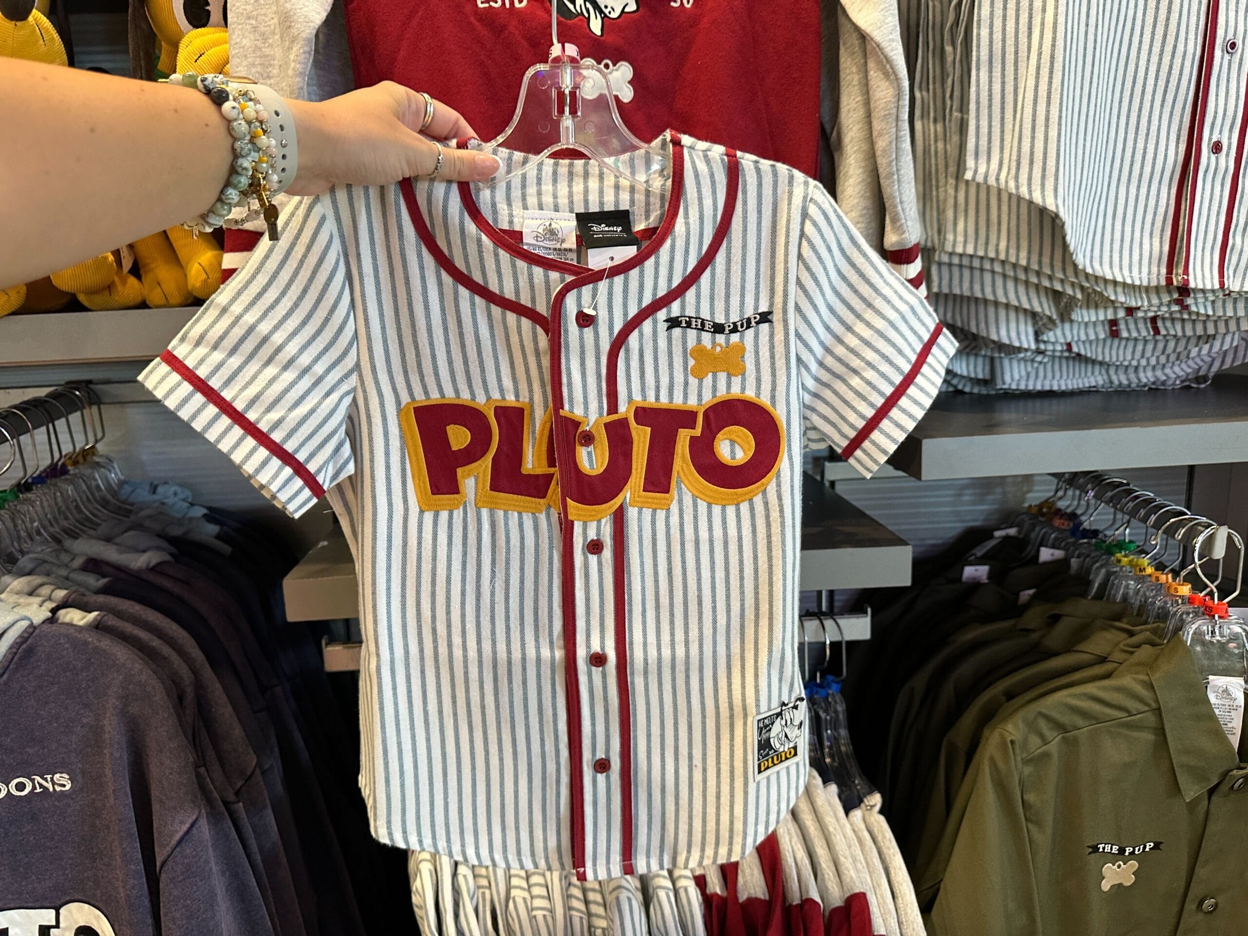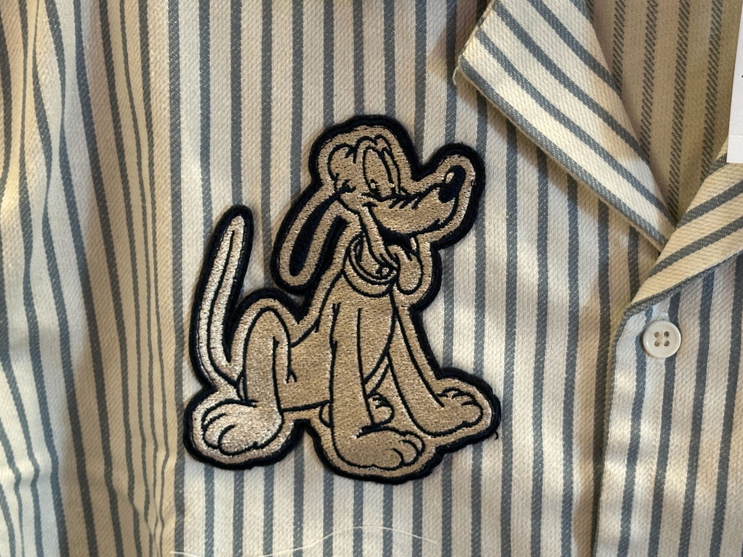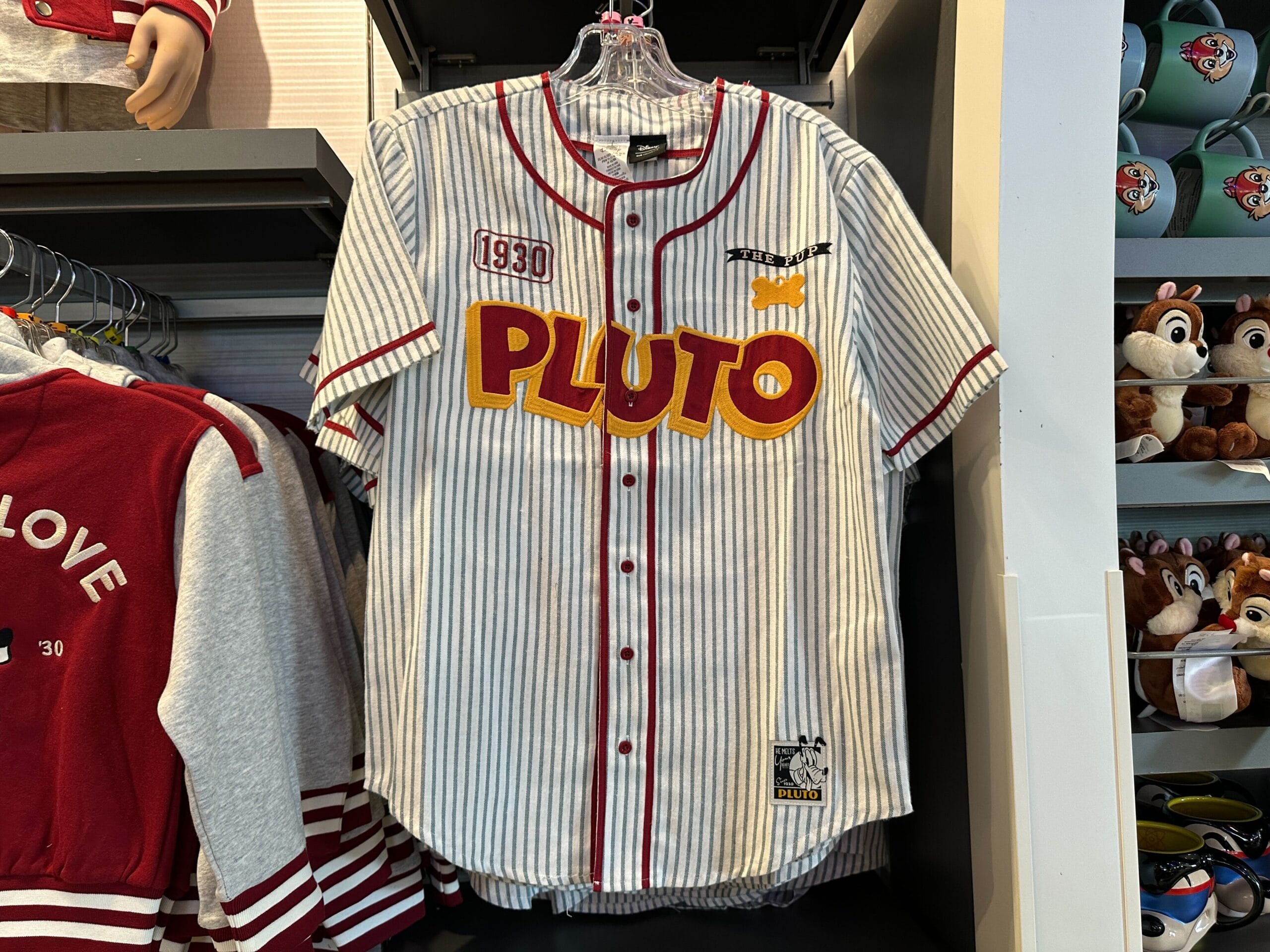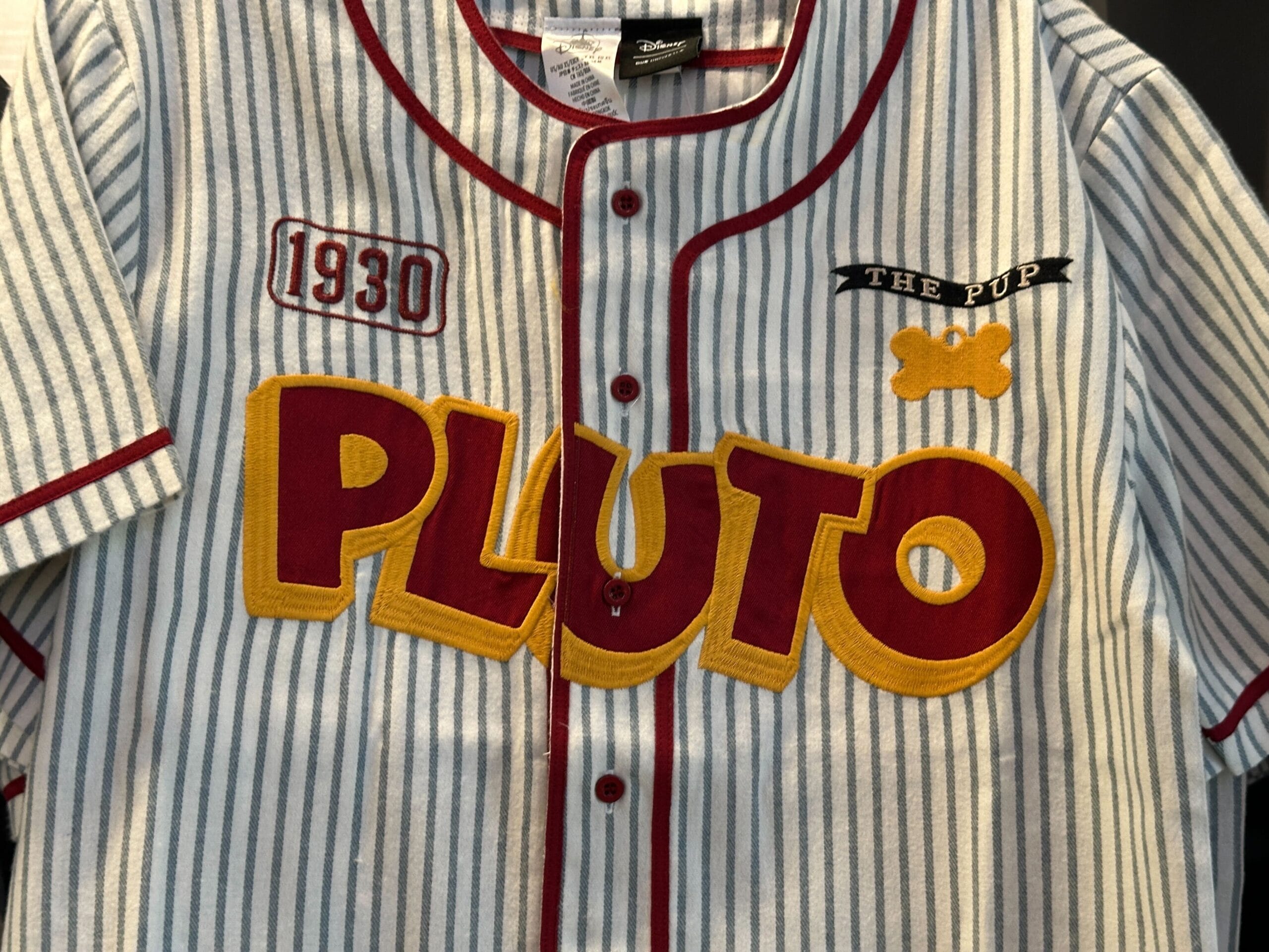 Like the regular button-up, the jersey is white with gray pin-striping. It has red piping around the neck, sleeves, and buttons. “Pluto” is across the chest in red and yellow letters. “1930” is embroidered on the right chest. “The Pup” and a yellow dog tag are on the opposite side. A Pluto label is near the hem.