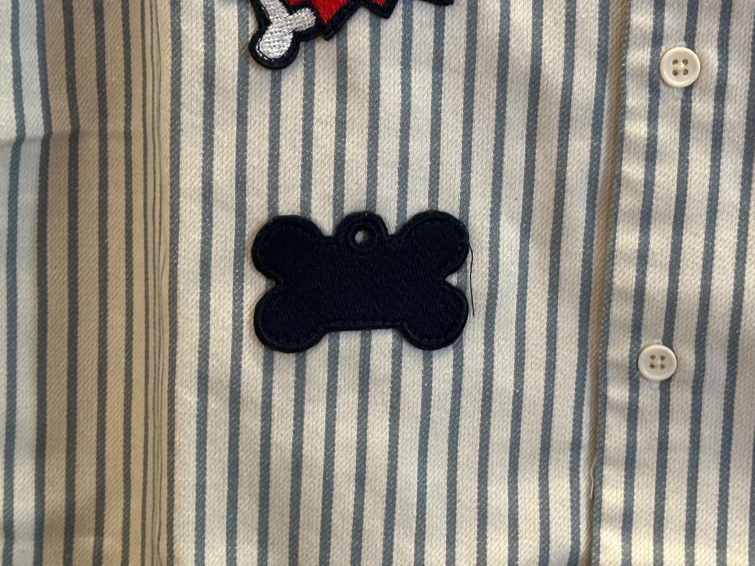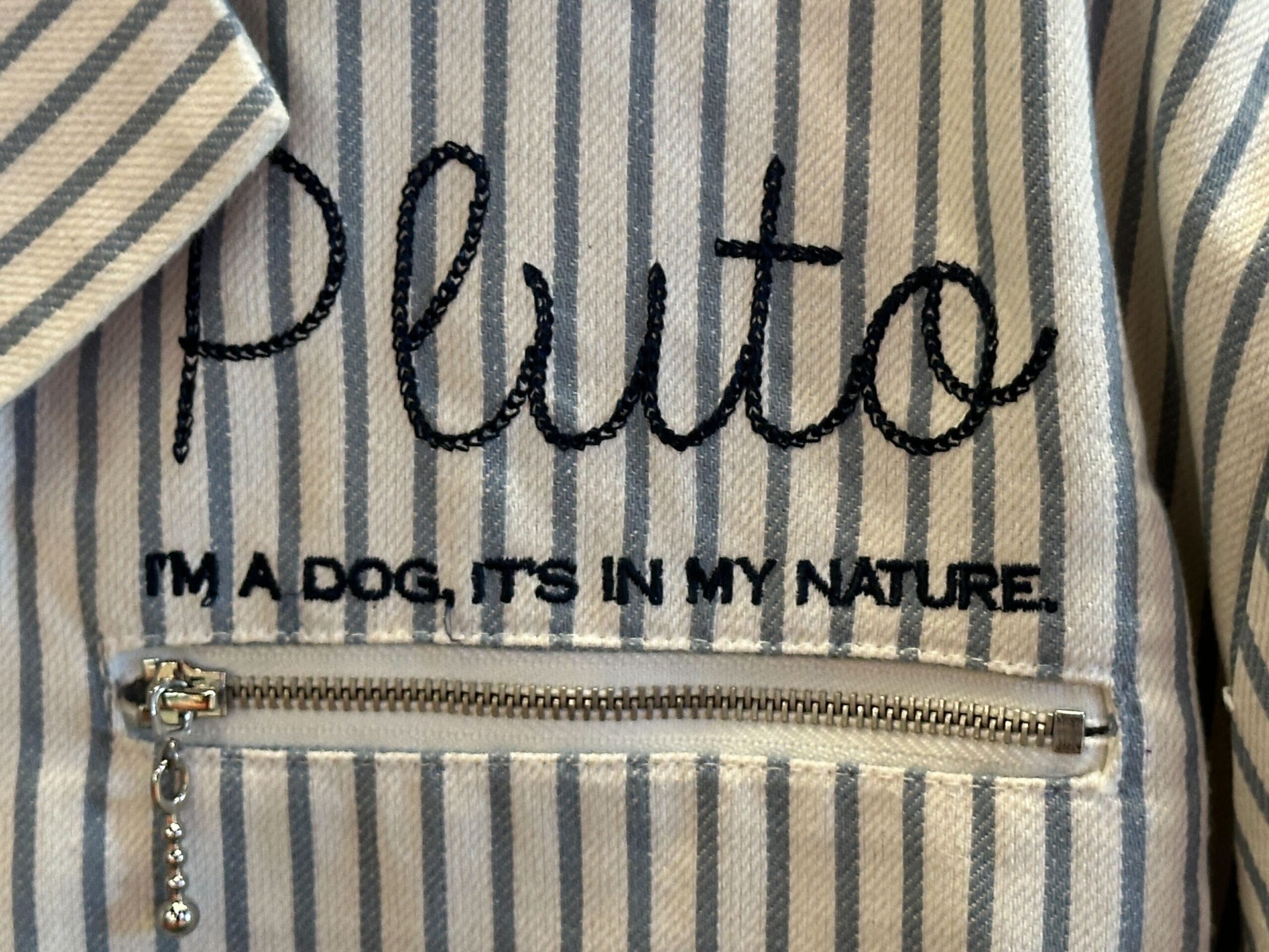 There’s a white Pluto patch, a red “My Bone!” patch with an image of a bone, and a black bone-shaped dog tag patch. “I’m a dog, it’s in my nature” is also above the pocket with Pluto’s name.