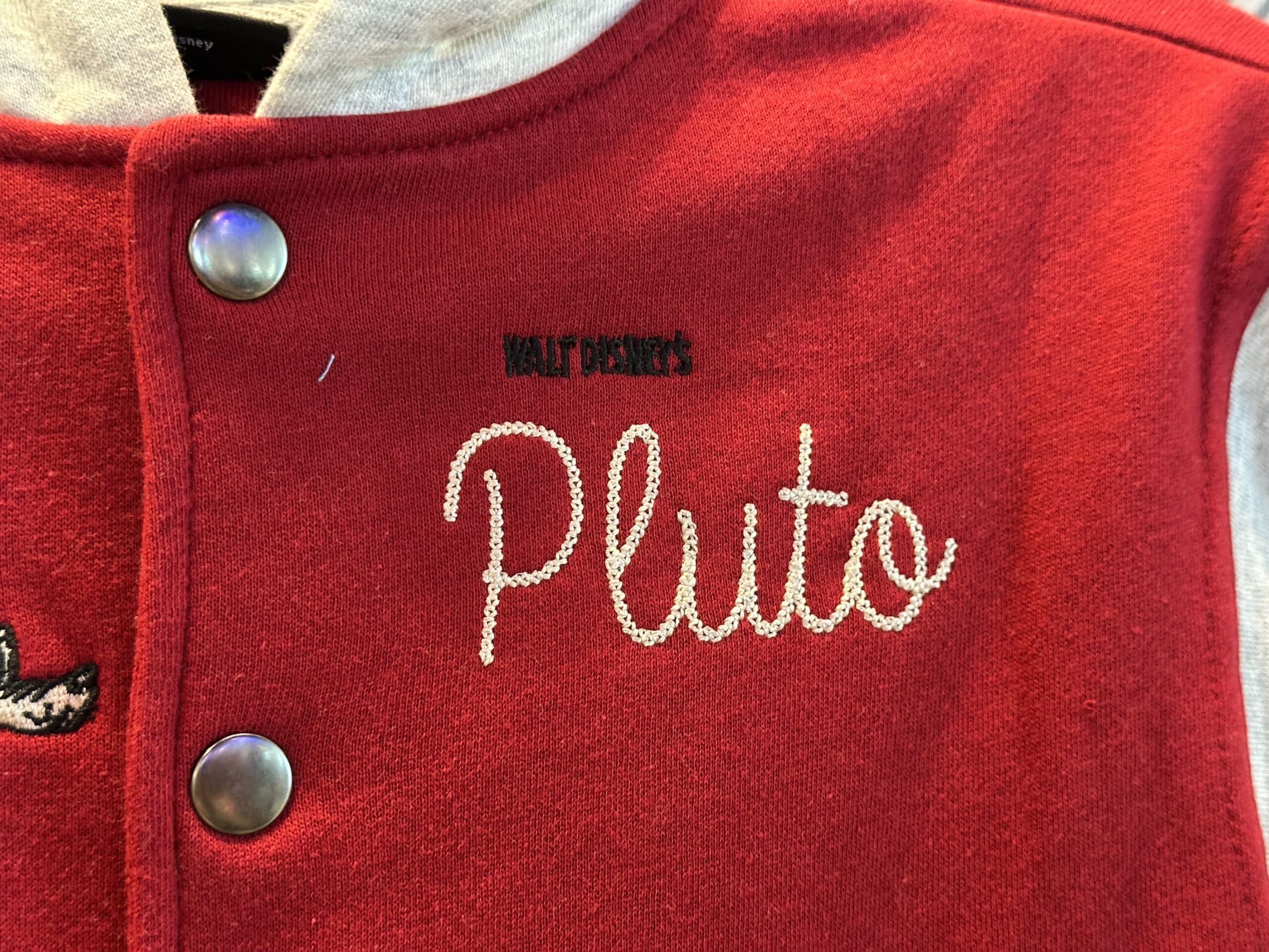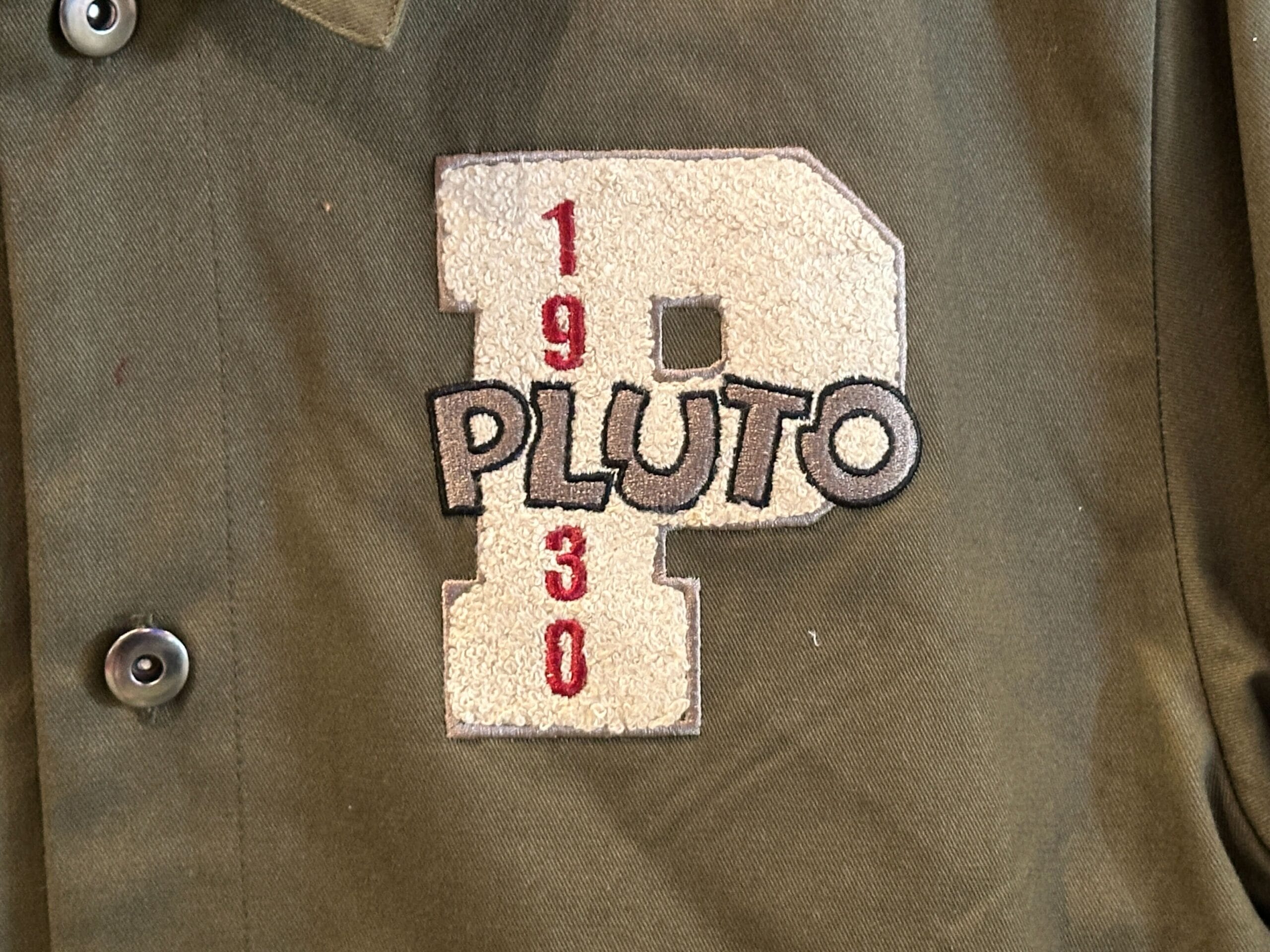 On the left chest is a large fuzzy white “P” with “Pluto” and “1930” crossing over it. A Pluto label is on one of the pockets.