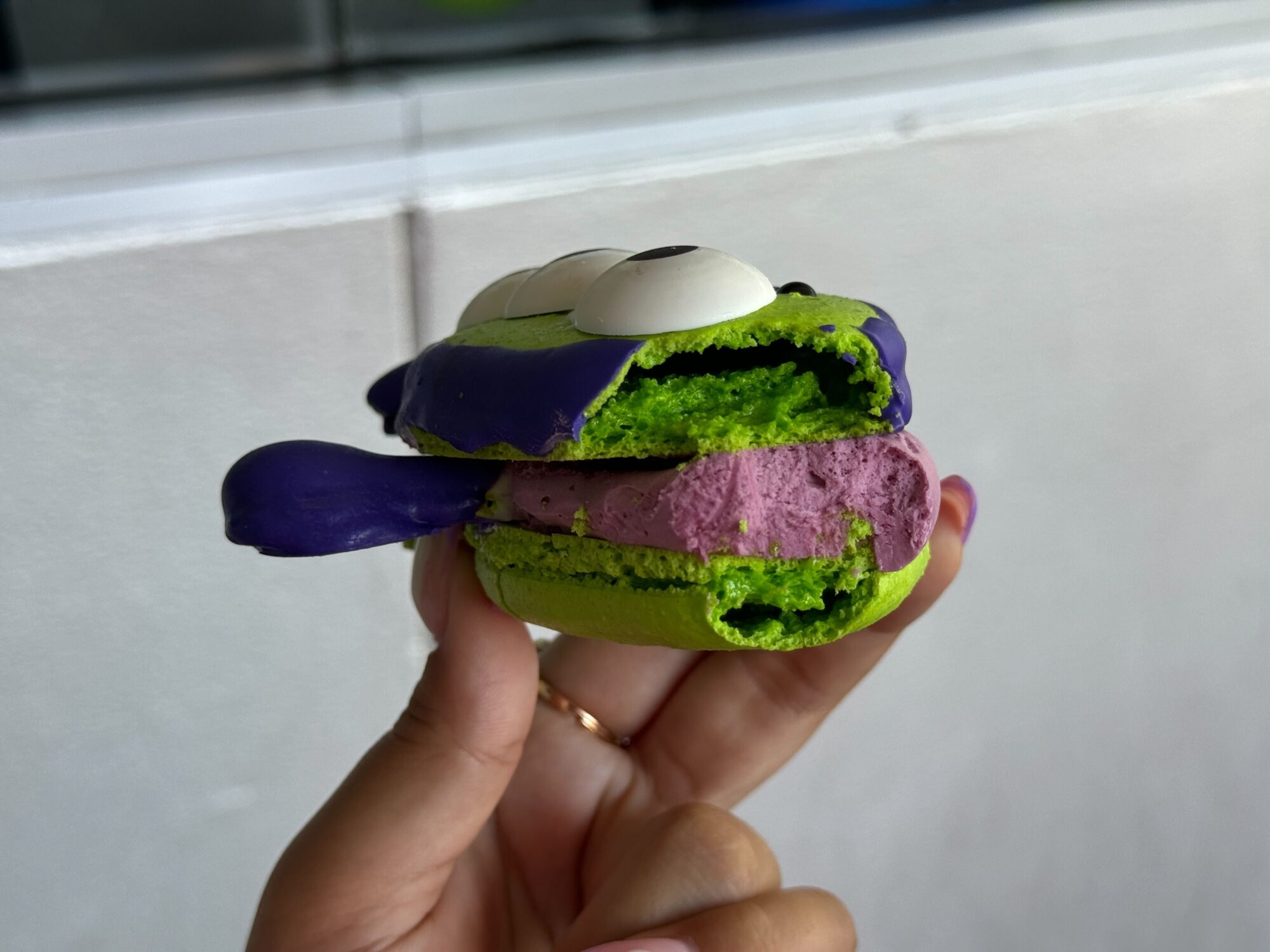 The macaron is cooked well, with a nice crunch to the shell of the cookie. The filling is a nice balance of sweet and sour, and the little Green Man in his Buzz Lightyear costume makes a great photo.