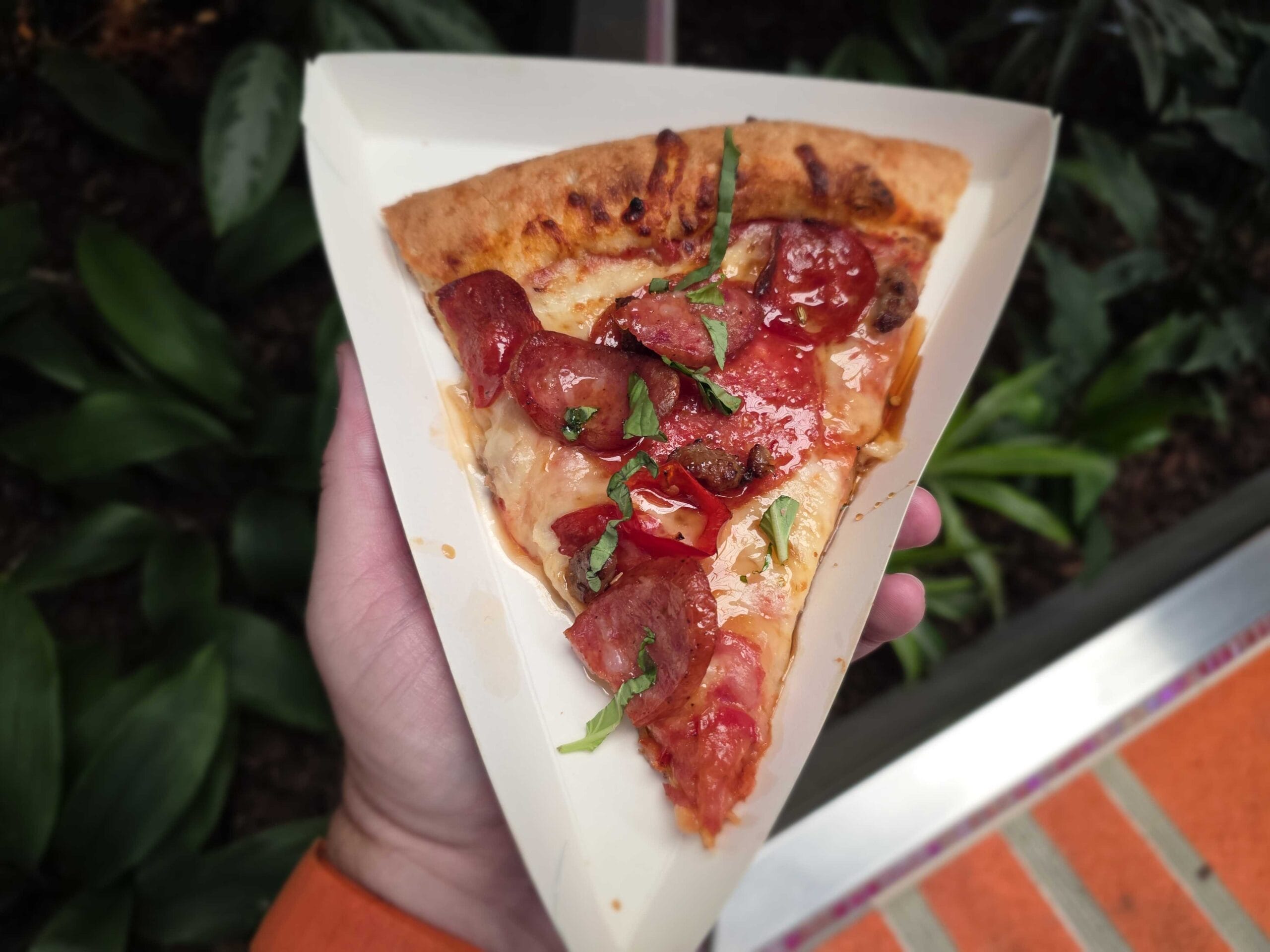 This pizza has a sturdy, thick crust. There’s an undercurrent of spice from the chiles and hot honey. You can avoid the chiles if you want but the hot honey is all over this slice. It’s good for theme park pizza although expensive at $9.49.