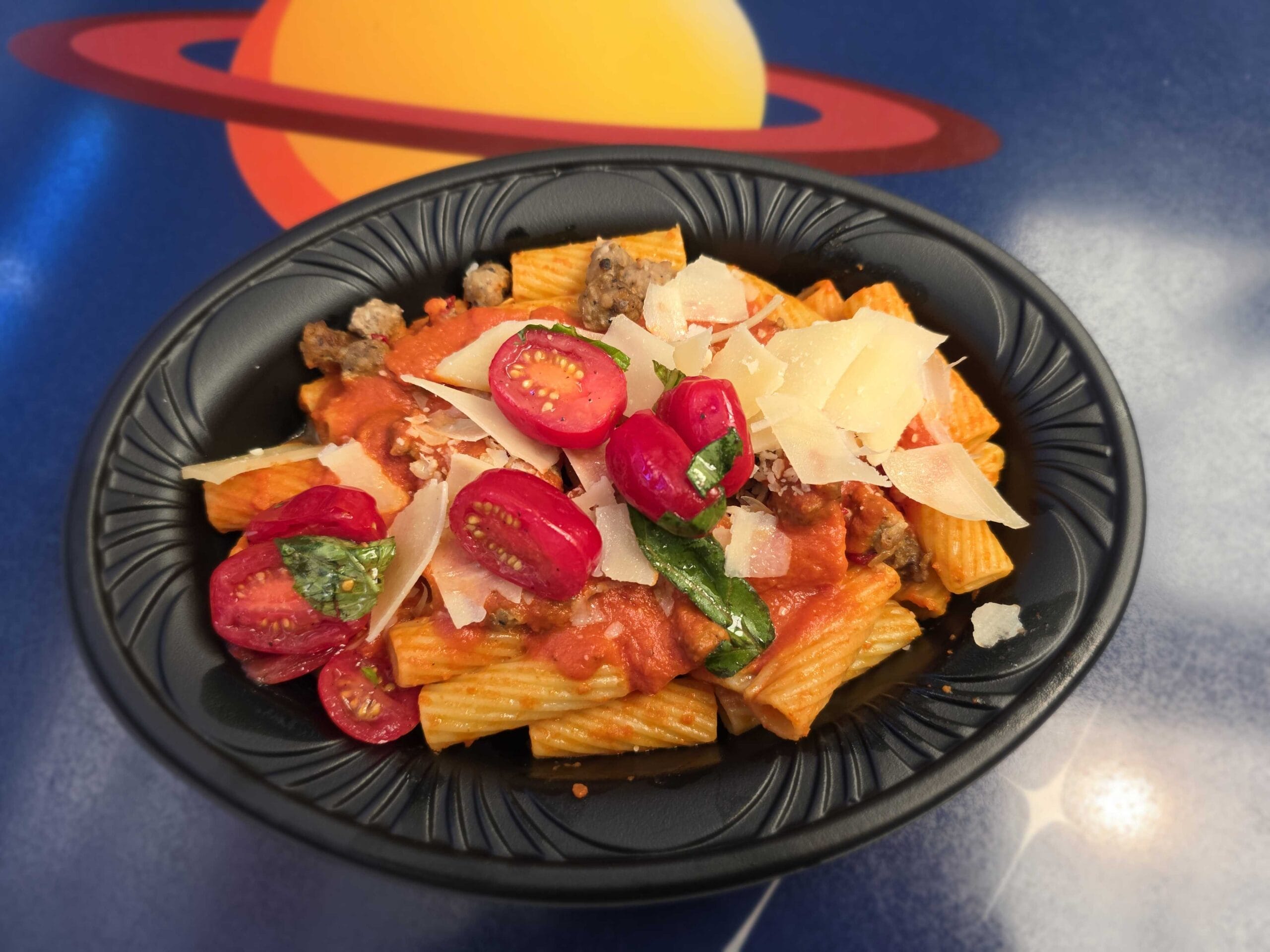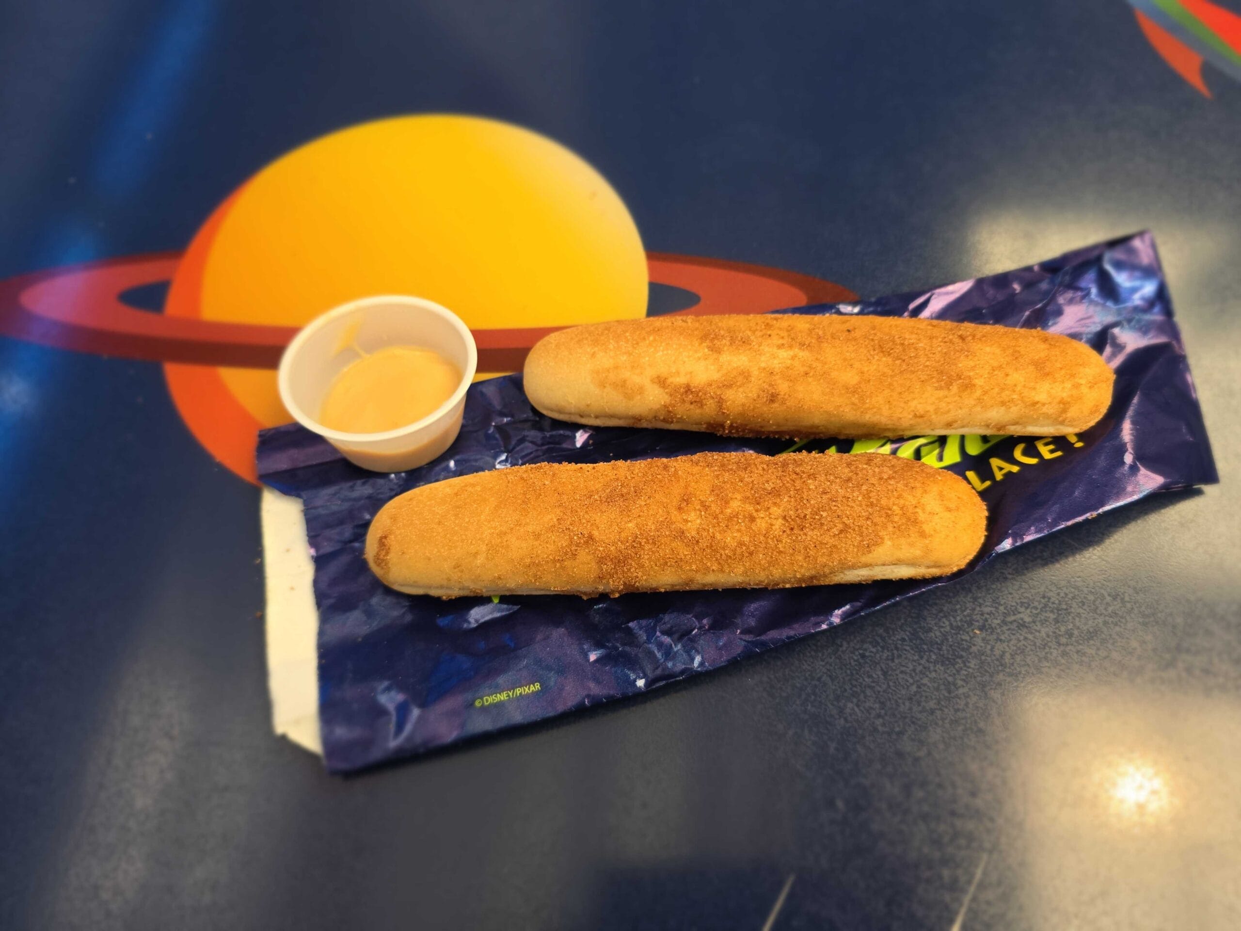This dish is two breadsticks and a cup of sauce in an Alien Pizza Planet bag. We were excited about this because it seems unique but it wasn’t very good. The breadsticks were dry white bread. The pumpkin spice sugar doesn’t completely cover them and falls off. If you do get a bite with the pumpkin spice plus the sauce, it’s good, but the experience will vary from bite to bite.