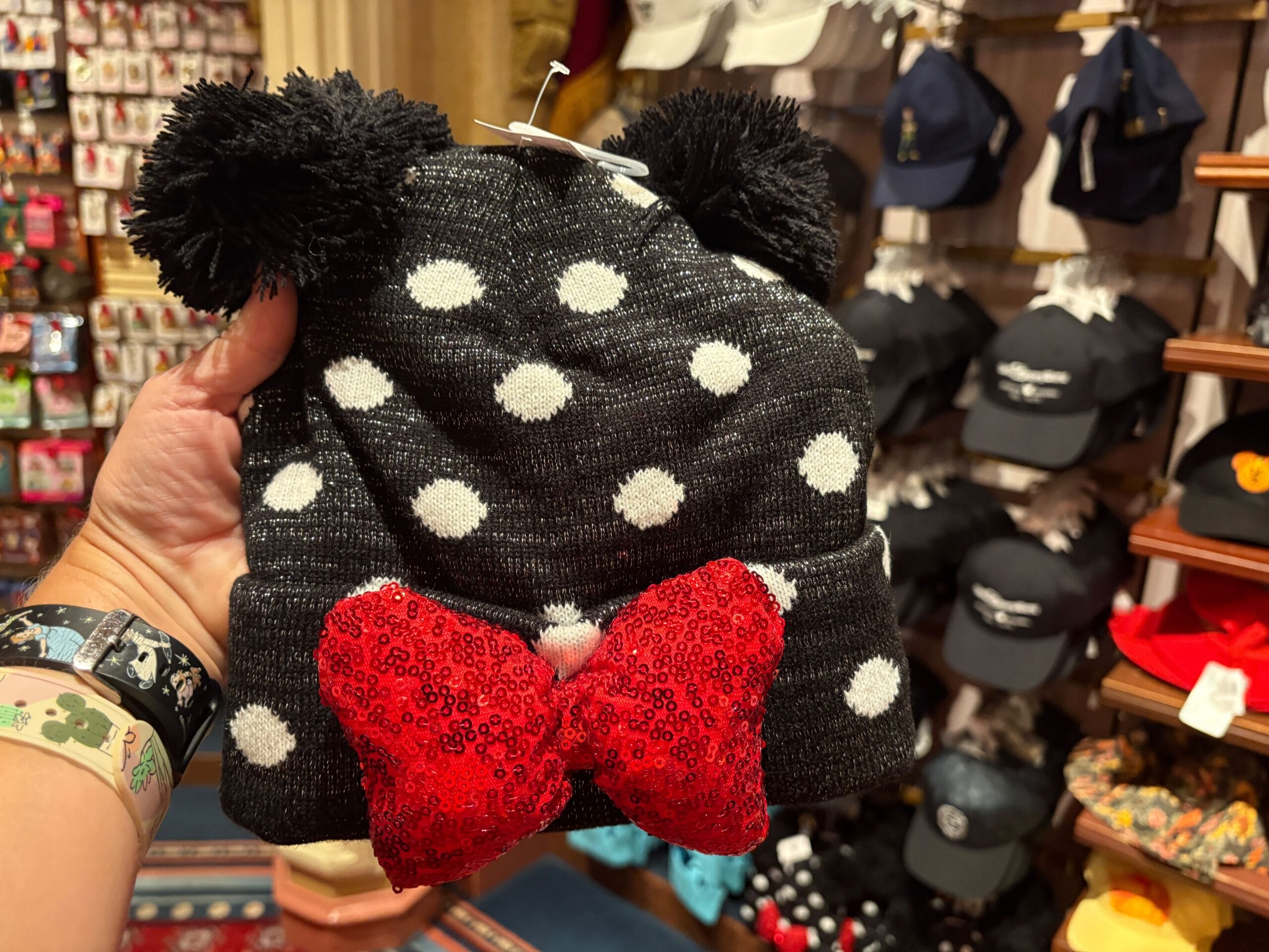 A hand holds a Minnie-inspired black Pom-Pom Ski Cap with white polka dots and a red sequined bow in a store.