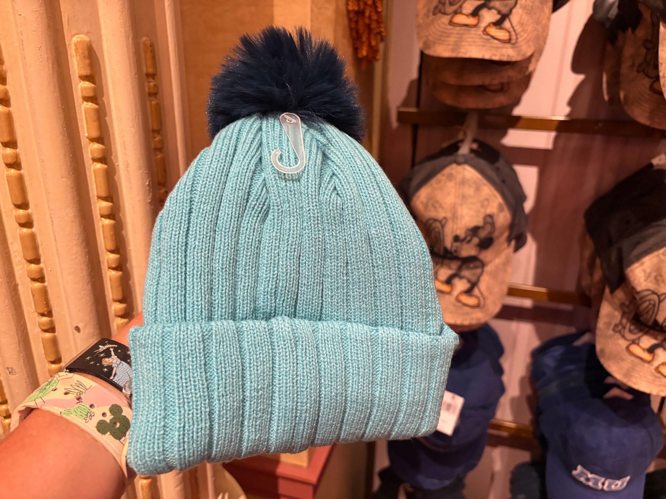 A hand holds a light blue Pom-Pom Ski Cap with a dark blue pom-pom in a store, hats and caps in the background.