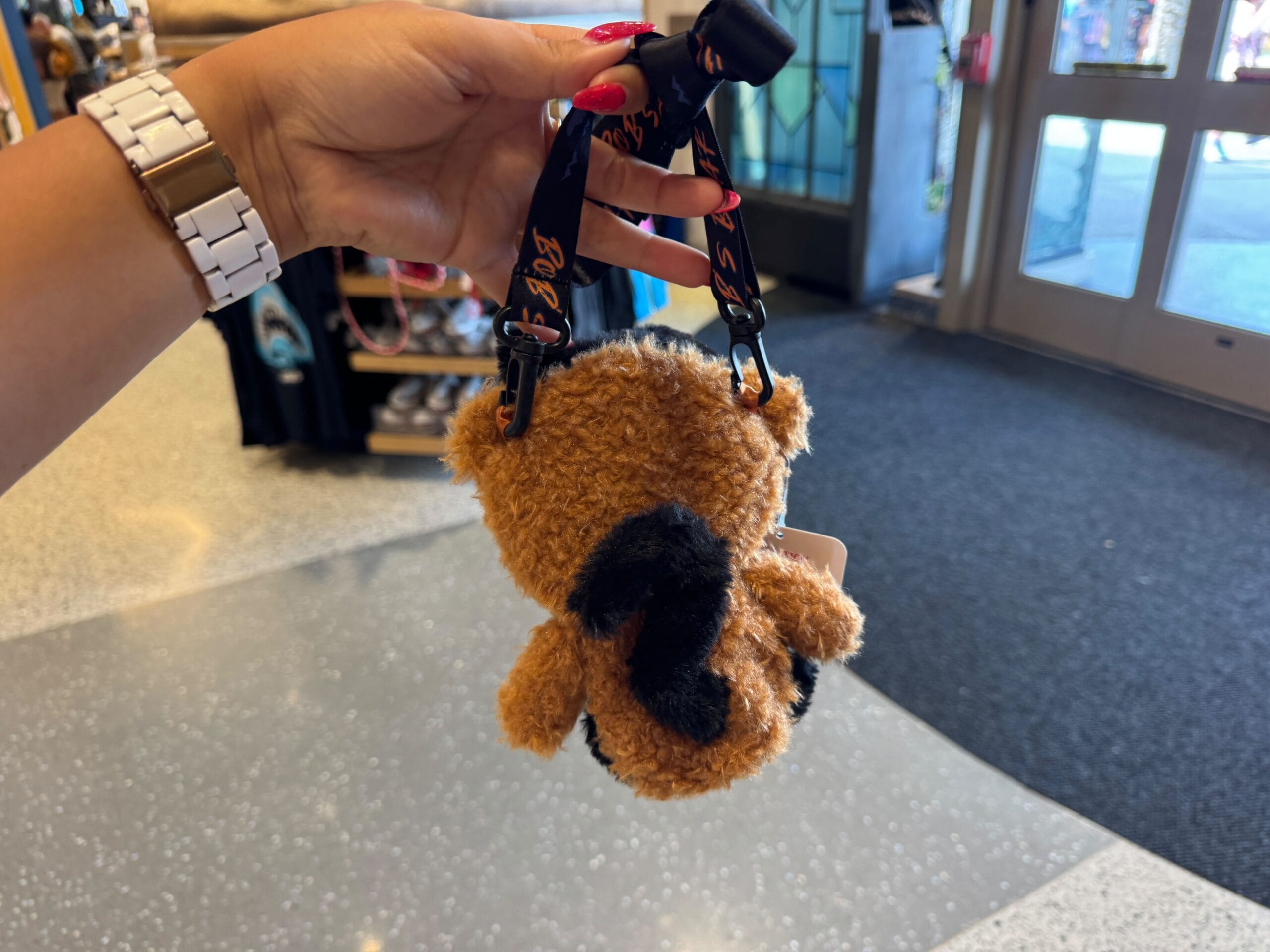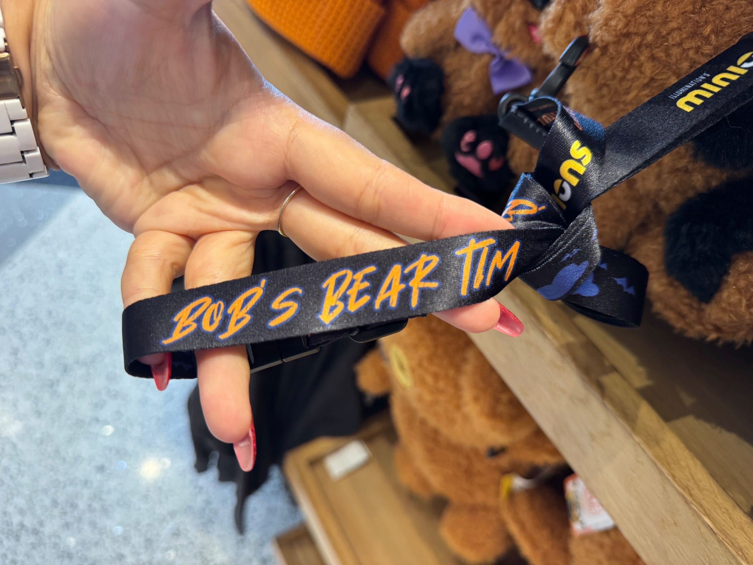 The plush toy is attached to a lanyard for easy wearing. It’s black and reads, “Bob’s Bear Tim” in orange font. The opposite side also has the classic yellow Minions wordmark.