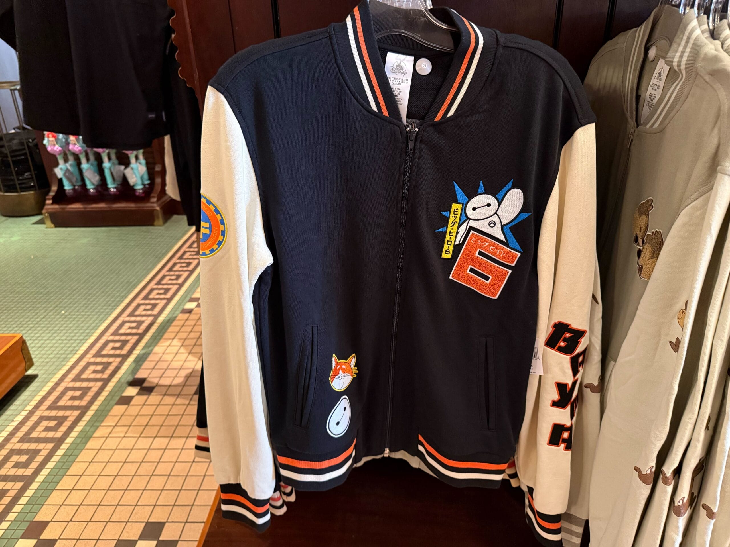 The Big Hero 6 varsity jacket is navy blue with off-white sleeves. It has red and white stripes on the collar, sleeve cuffs, and at the bottom. An image of Baymax and a red “6” is stitched on the left side of the chest, and an appliqué of Baymax and Mochi’s head are attached on the right pocket.