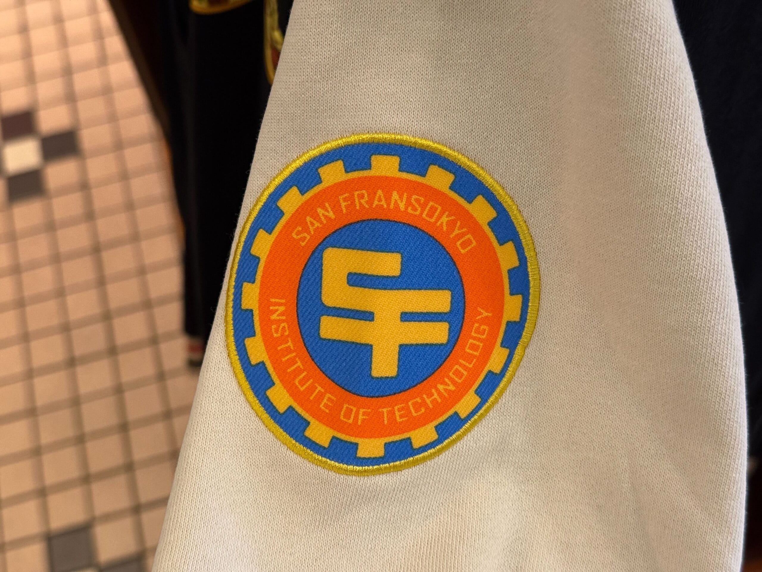 Black printed lettering saying “Baymax” runs down the length of the left sleeve. The right sleeve has an image of the round San Fransokyo Institute of Technology logo.