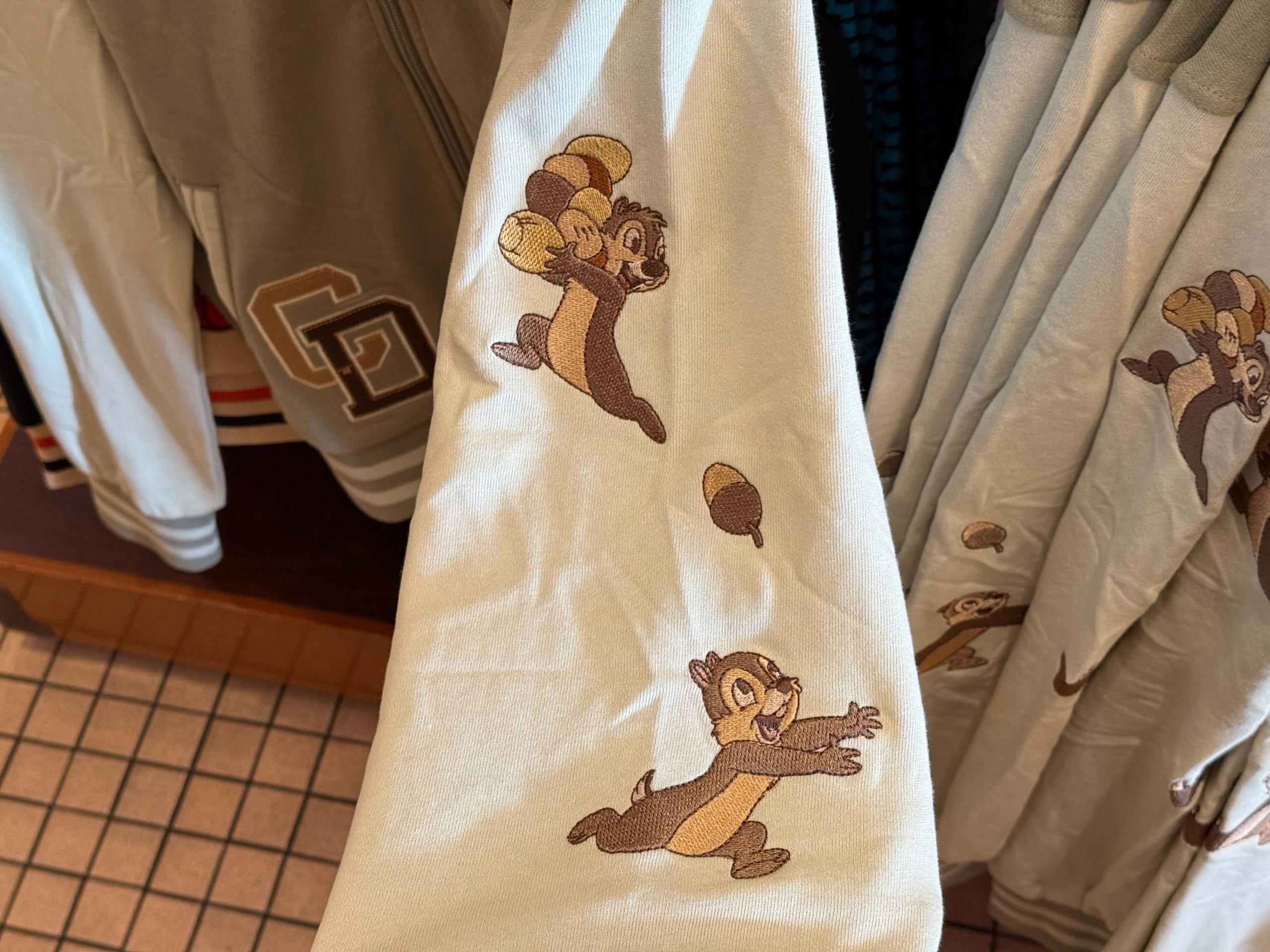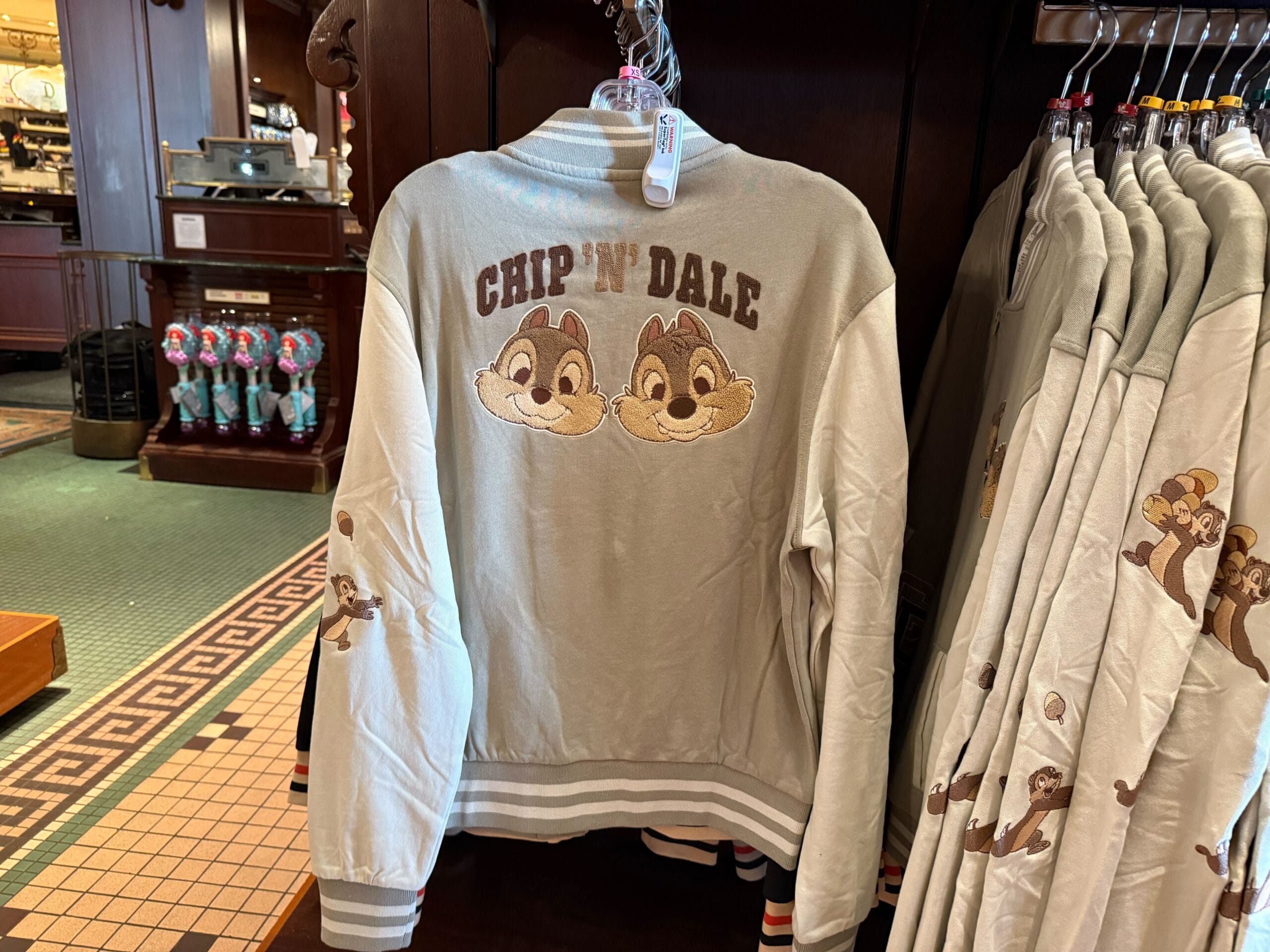 Lastly, the Chip ‘n’ Dale varsity jacket is gray with white sleeves. It has white stripes on the collar, sleeve cuffs, and at the bottom. Chip ‘n’ Dale sit on the left side of the chest, and an appliqué of their initials is stitched on the right pocket.