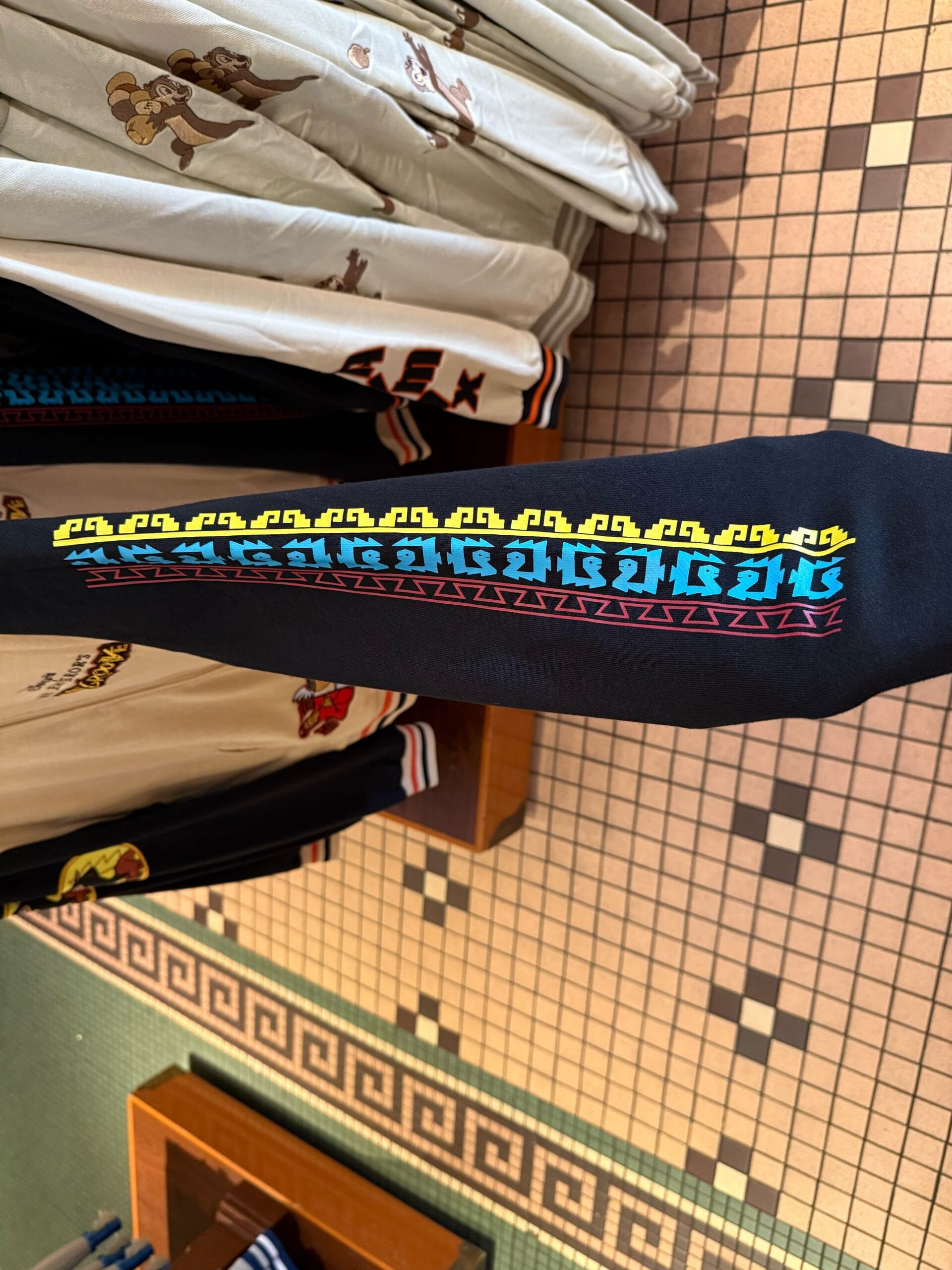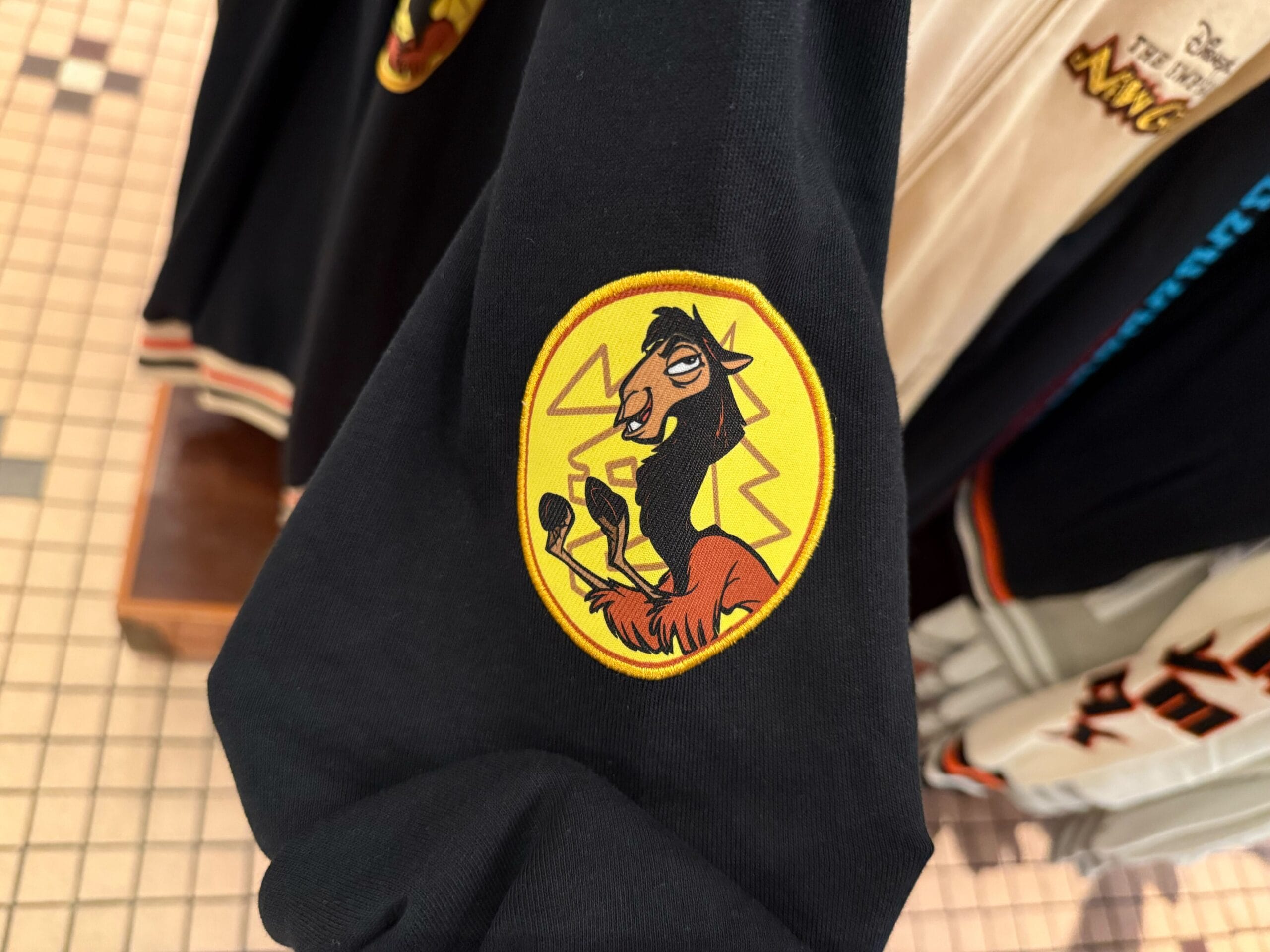 Yellow, blue, and red geometric patterns runs down the length of the left sleeve. The right sleeve has an appliqué of Kuzco in his llama form.