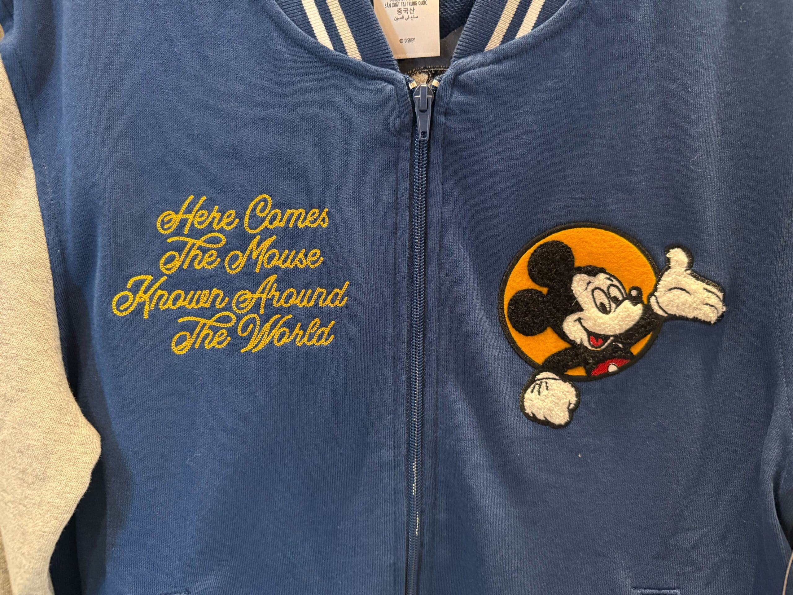 Red embroidered patches run down the length of the left sleeve saying “Mickey Mouse.” The right sleeve has a blue pennant with an image of Mickey Mouse and the words “Since 1928.”