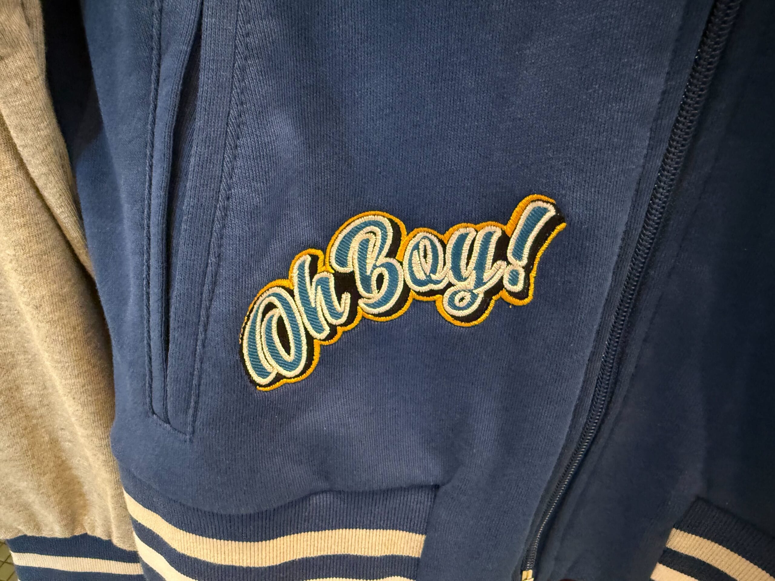 “Oh Boy!” in written using blue, white, and yellow stitching near the right hand pocket.