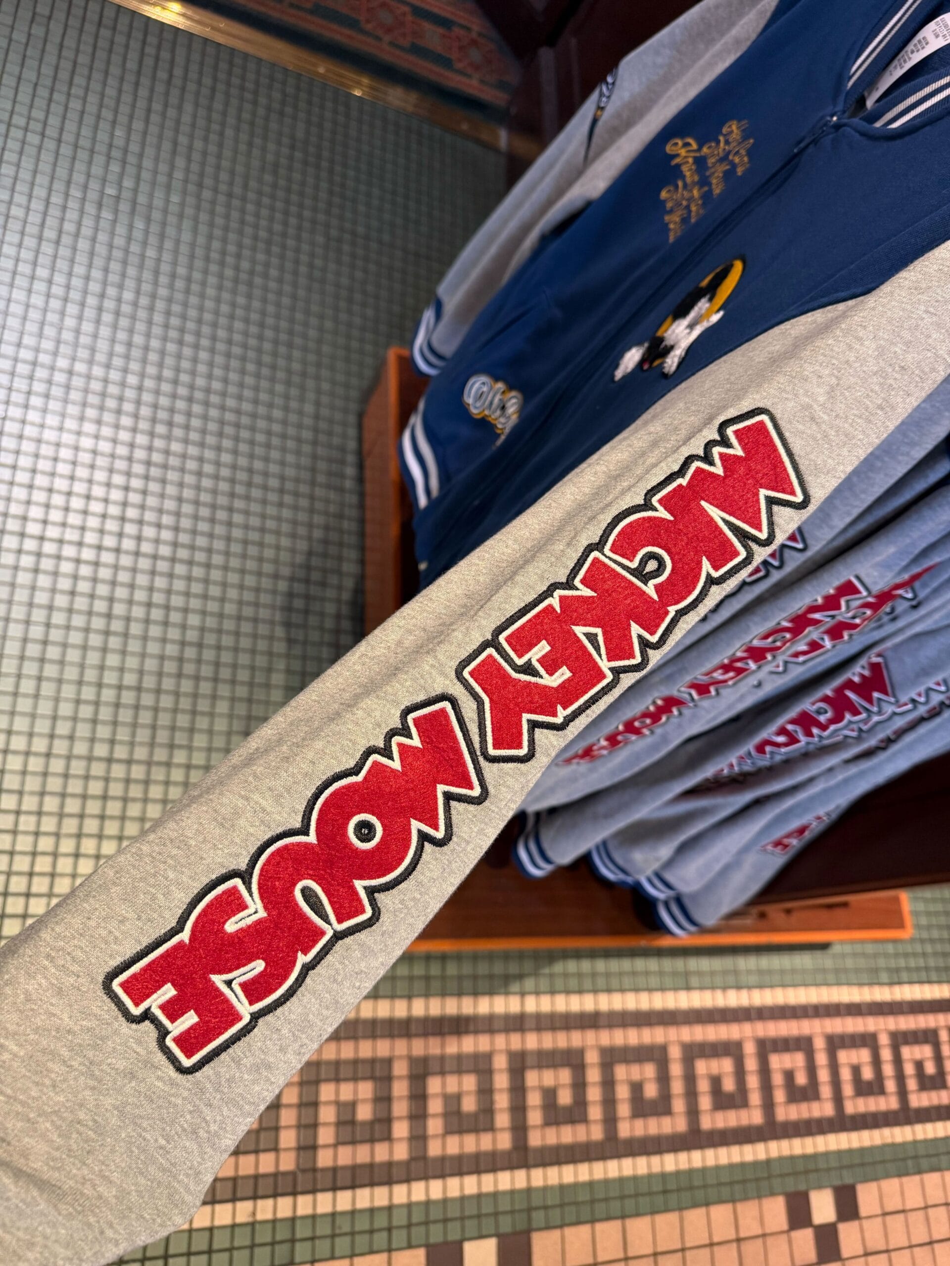 The Mickey Mouse varsity jacket is blue with gray sleeves. It has white stripes on the collar, sleeve cuffs, and at the bottom.