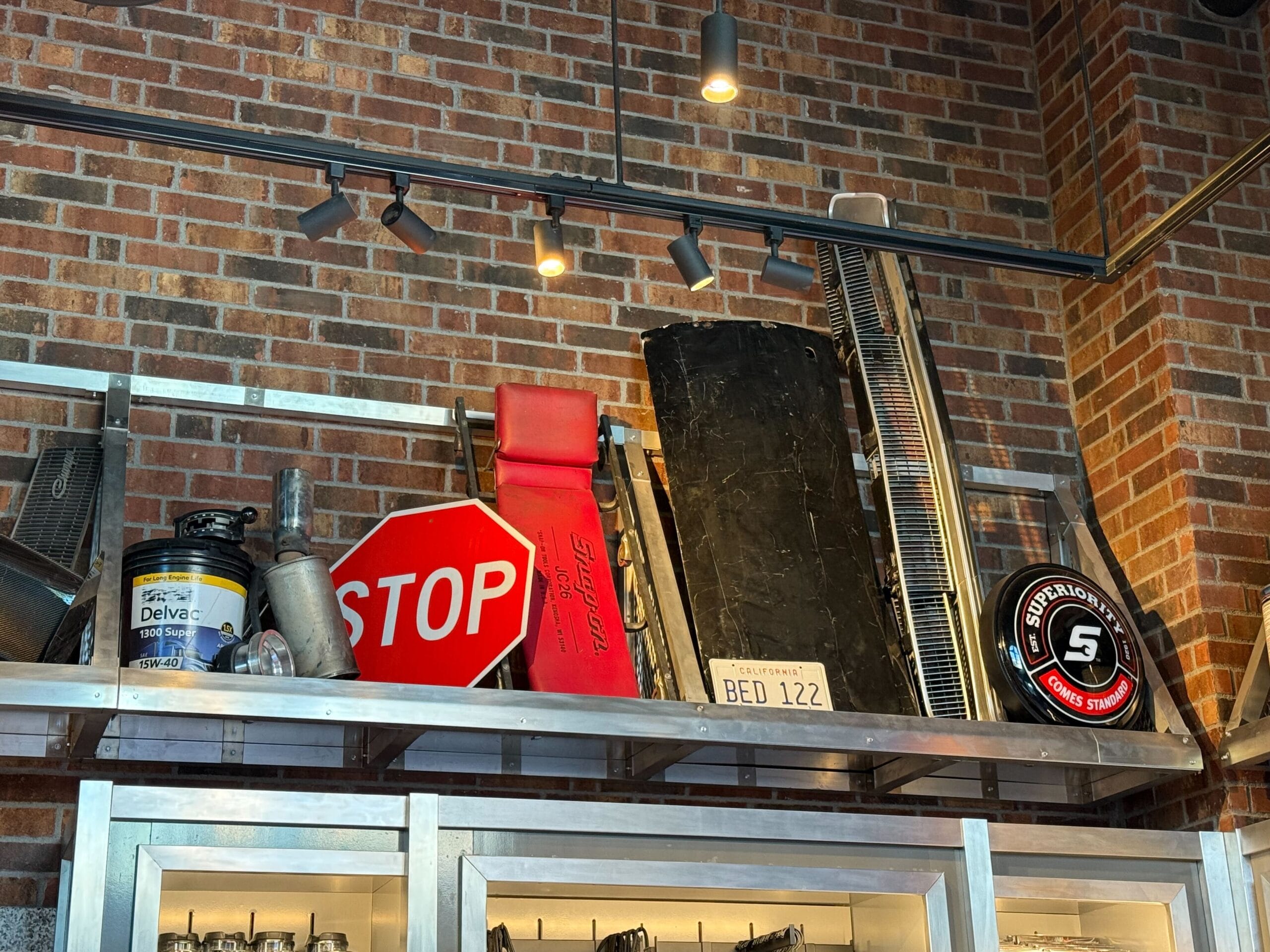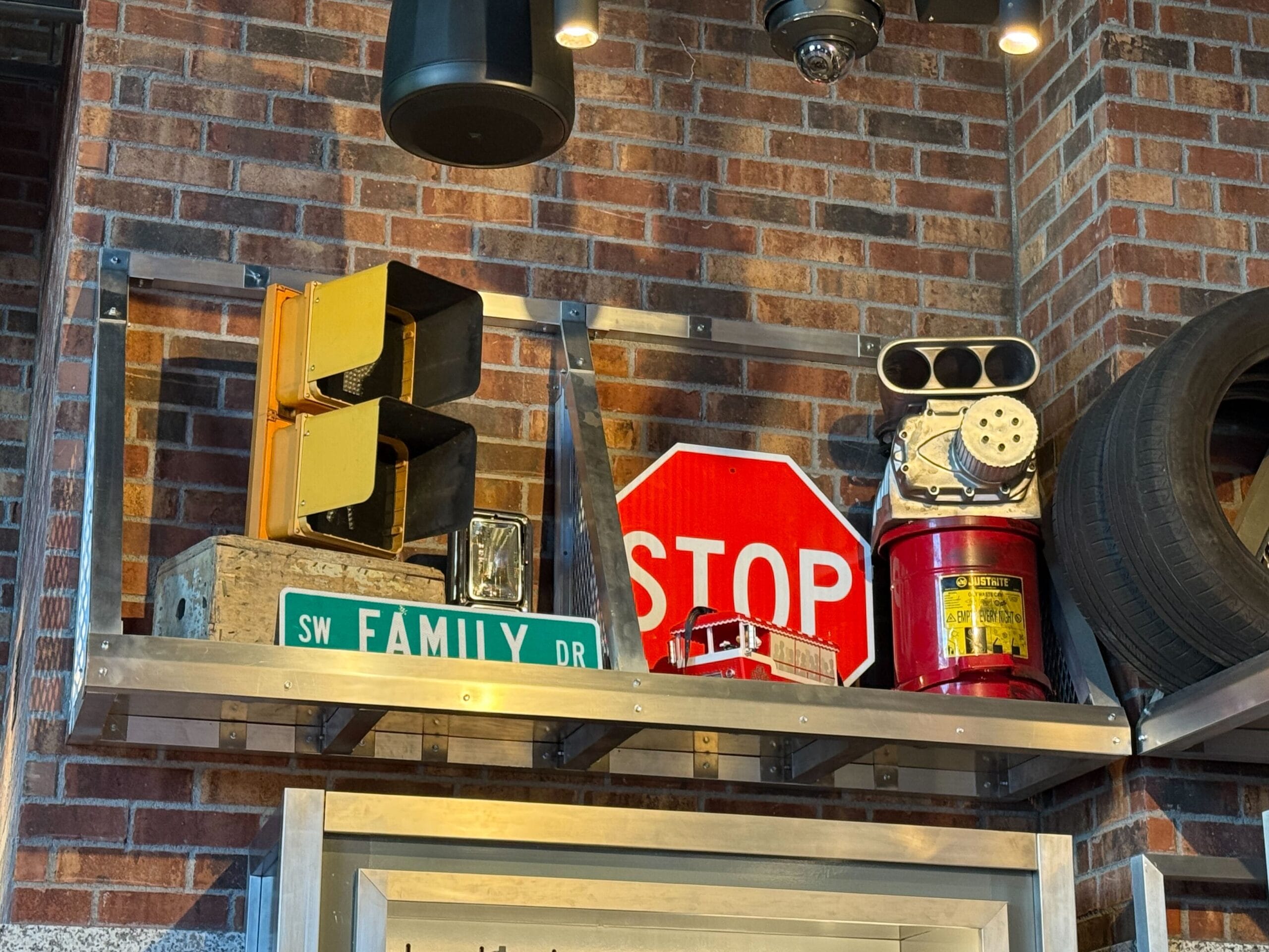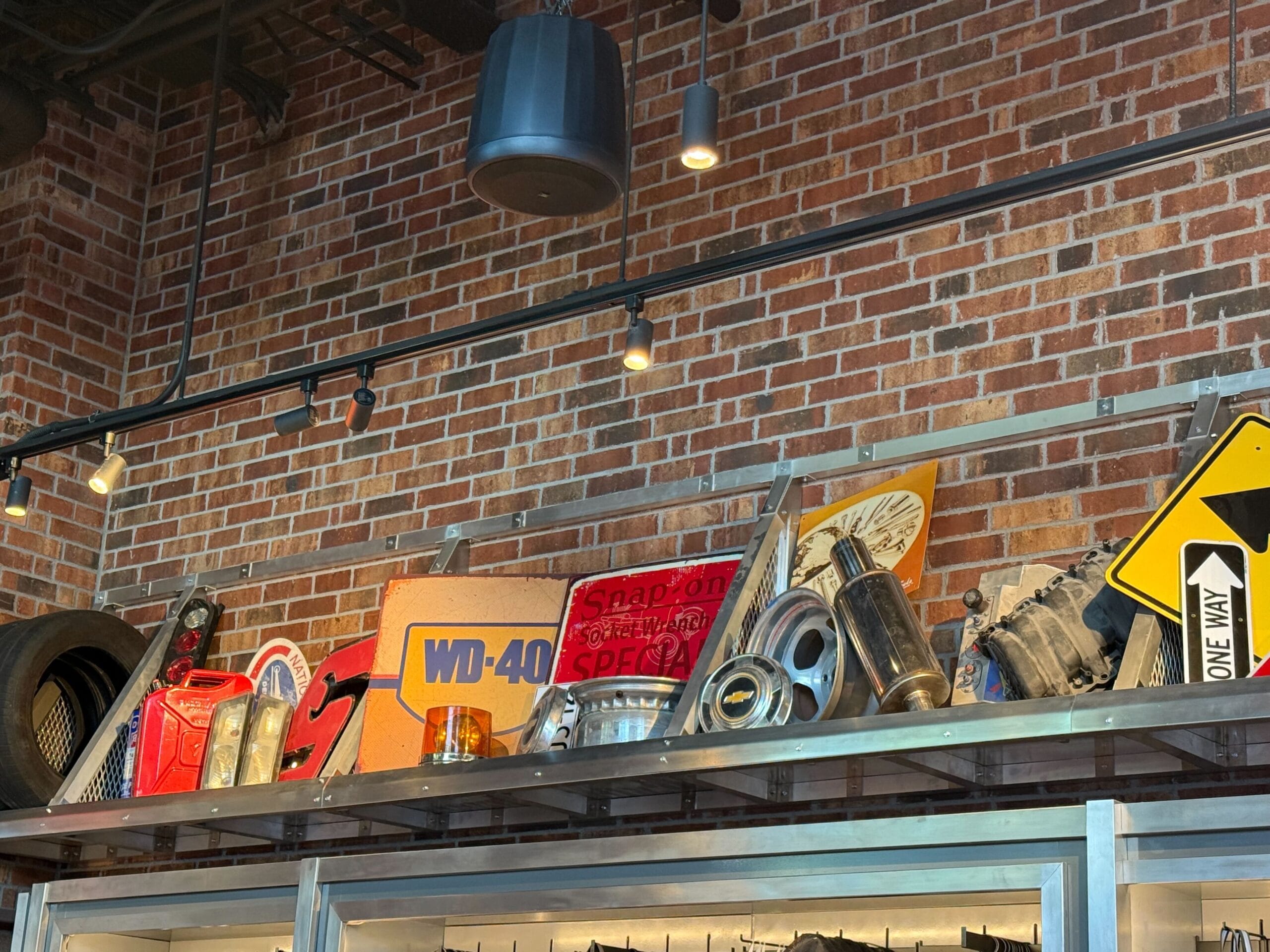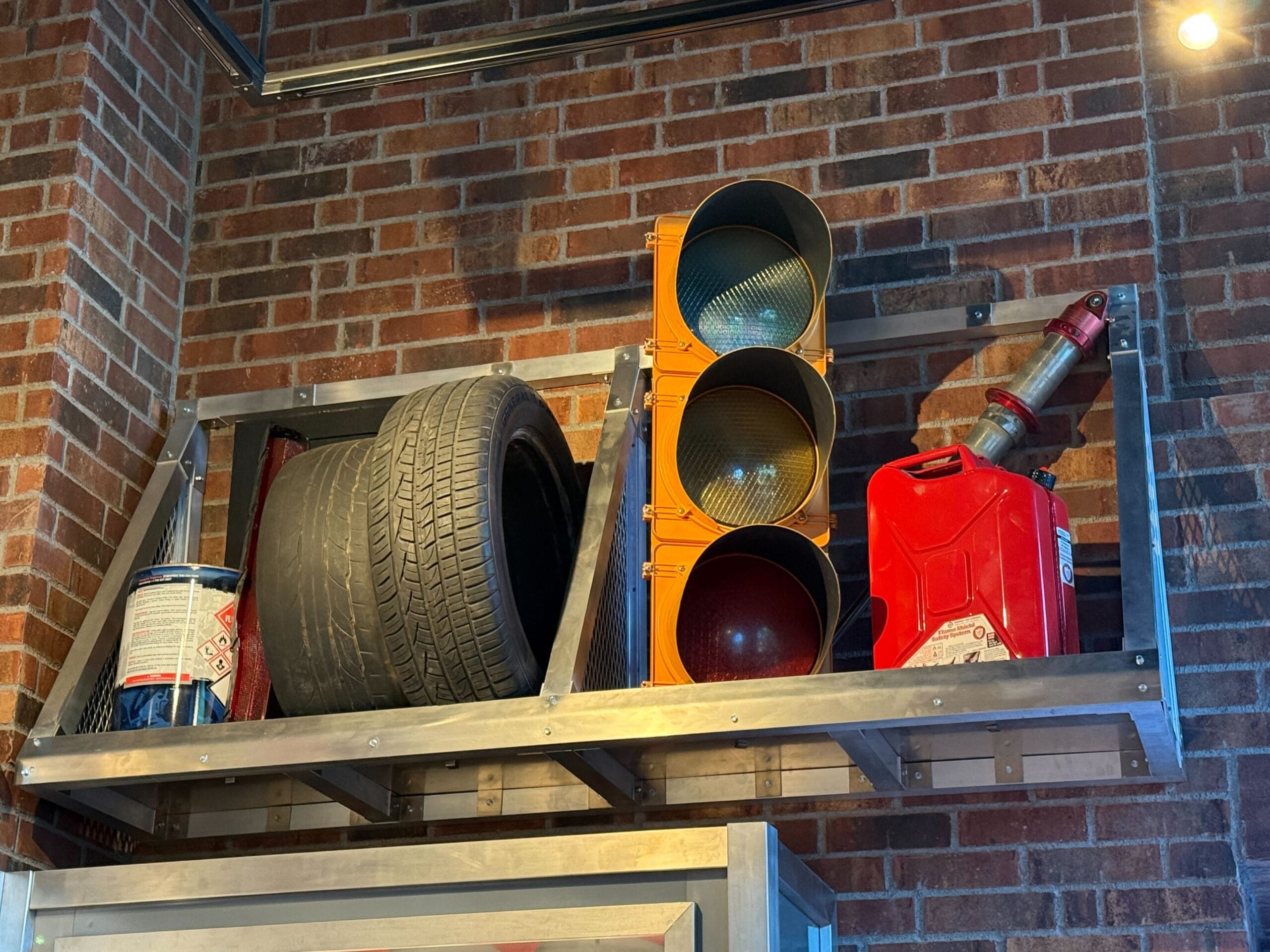 Street signs and car items line the walls of the store. You’ll see stop signs, car parts, stop lights, tires, gas cans, and more. There is even a street sign that reads “Family Dr” which is a prominent theme in the movie franchise.