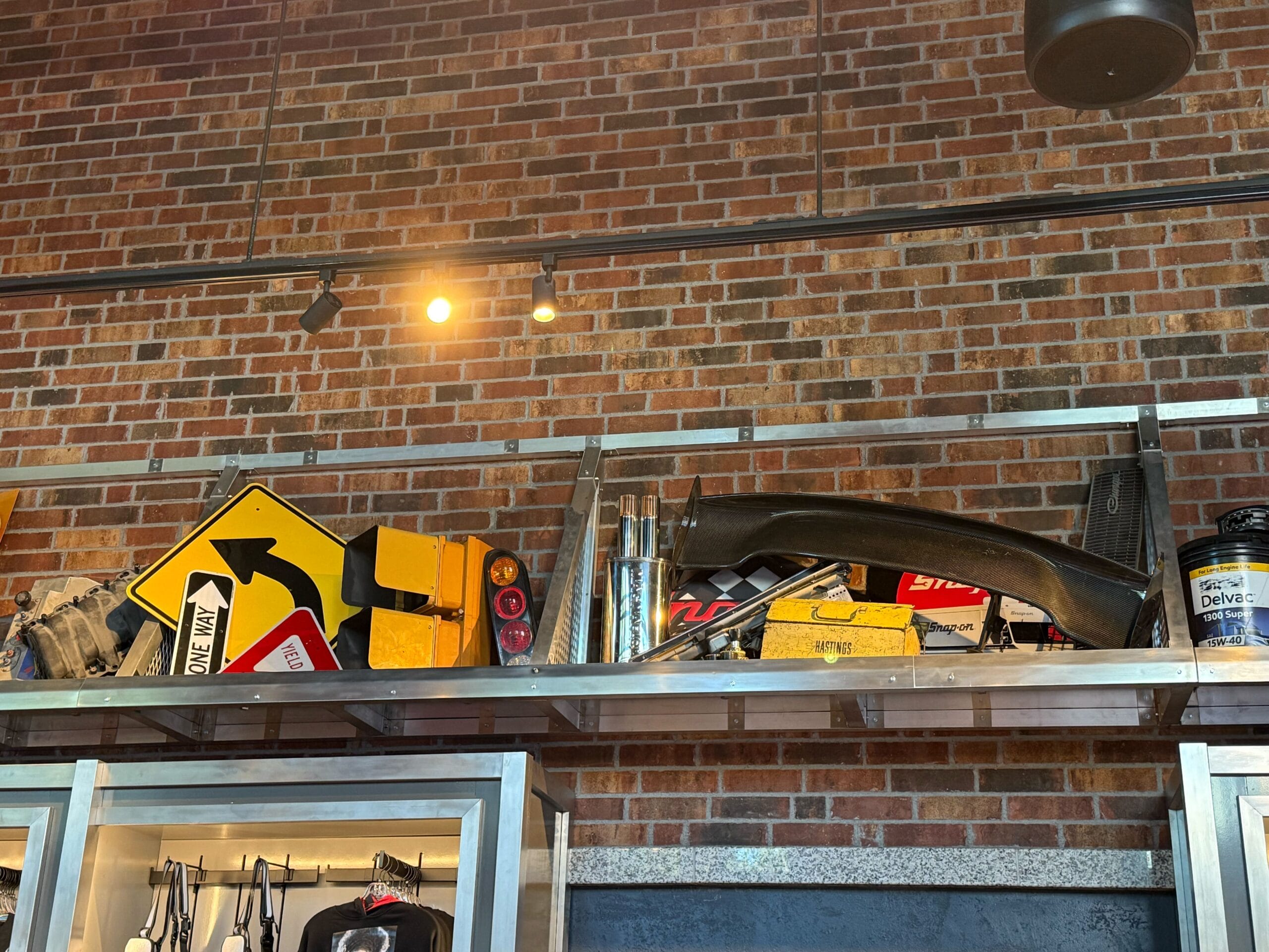 Inside, the top half of the walls are made of brick, and the bottom half is painted black. Steel display shelves and industrial-style overhead lighting make it feel like you’re walking to a mechanic’s garage. The floor is concrete.