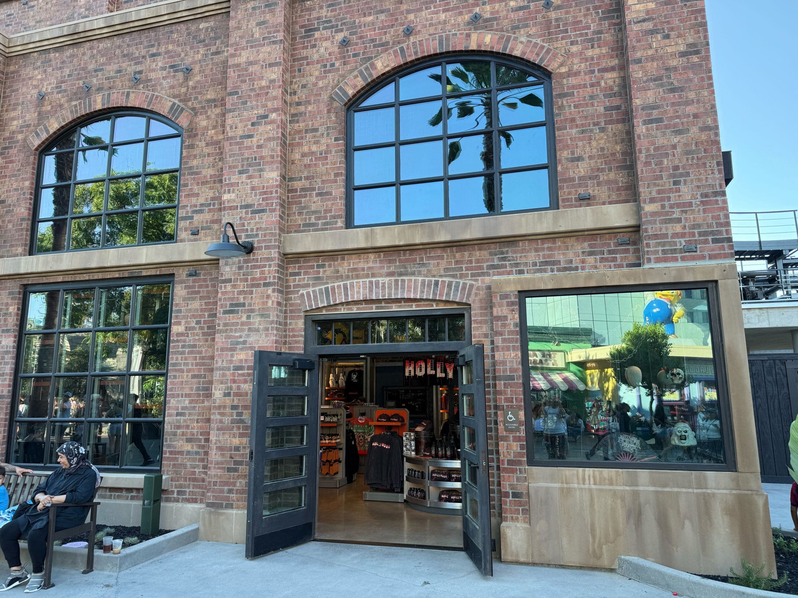 As mentioned above, the store has an industrial feel, with the exterior and interior both made of brick. The entrance doors are made of black steel, and the black exterior lighting plays into the atmosphere Universal is aiming for.
