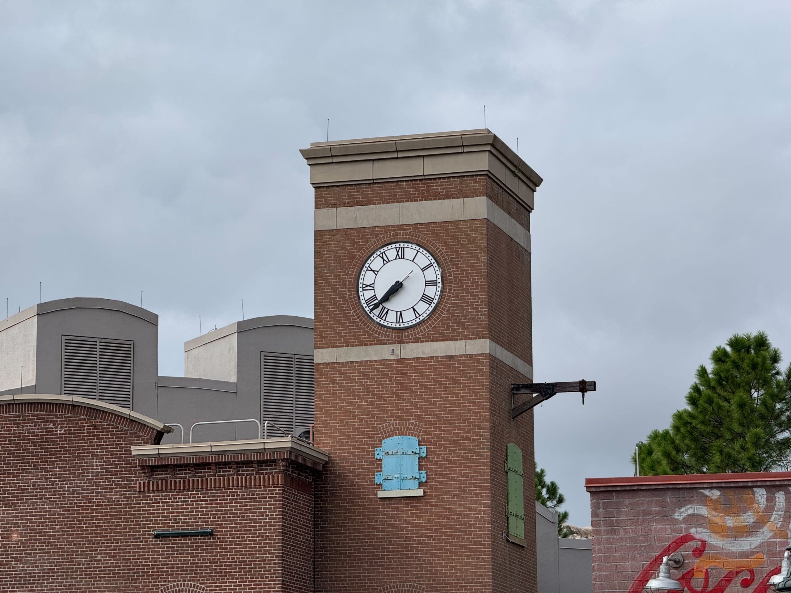 A black and white flat figure of Gonzo previously hung from the hands of the clock in reference to the 1923 silent film Safety Last! starring Harold Lloyd. As of Wednesday, September 10, Gonzo has been removed. The clock remains and the theater facade is expected to be redressed and reused for the area’s new Monsters, Inc. land.