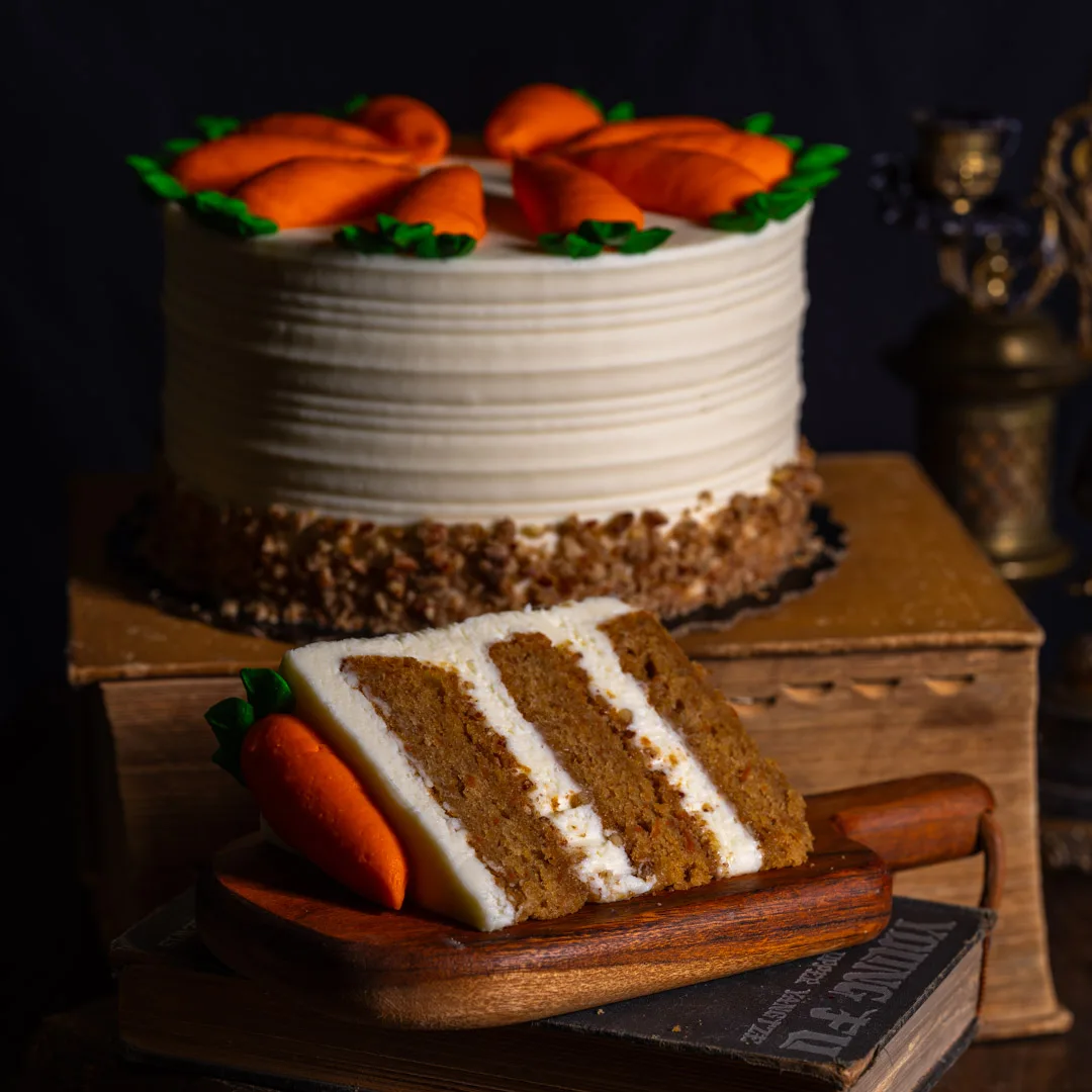 Enjoy three layers of soft Ginger Spiced Carrot Cake surrounded by our signature healthy portion of our Cheesecake Frosting and accented with super yummy Candied Pecans and, of course, Buttercream Carrots!