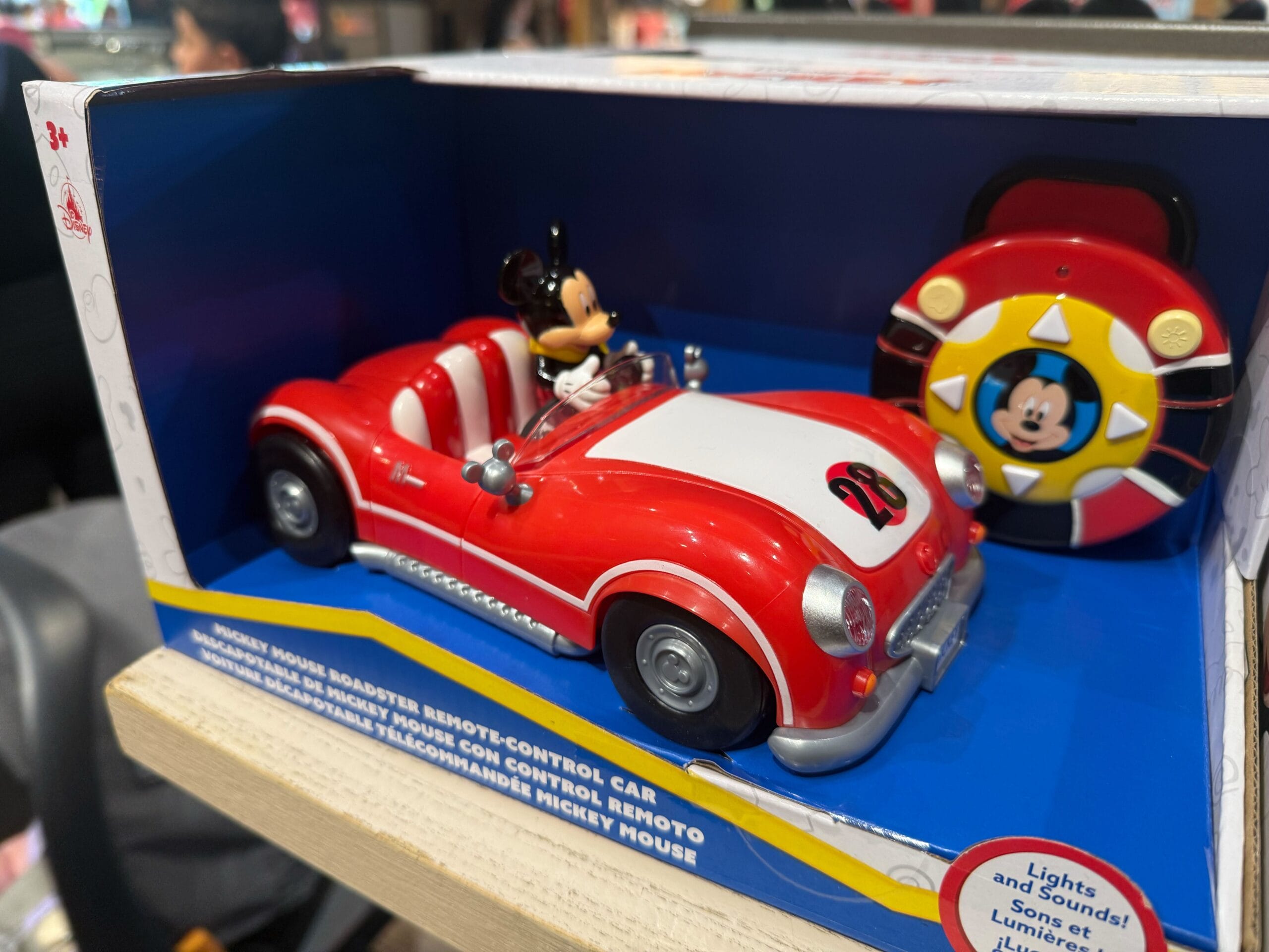 We also found two remote-controlled cars during our visit to Downtown Disney. The Mickey Mouse Roadster remote-control car is a red car with a wide white stripe down the middle. The number 28 is painted on the hood, and his license plate says MICKEY.