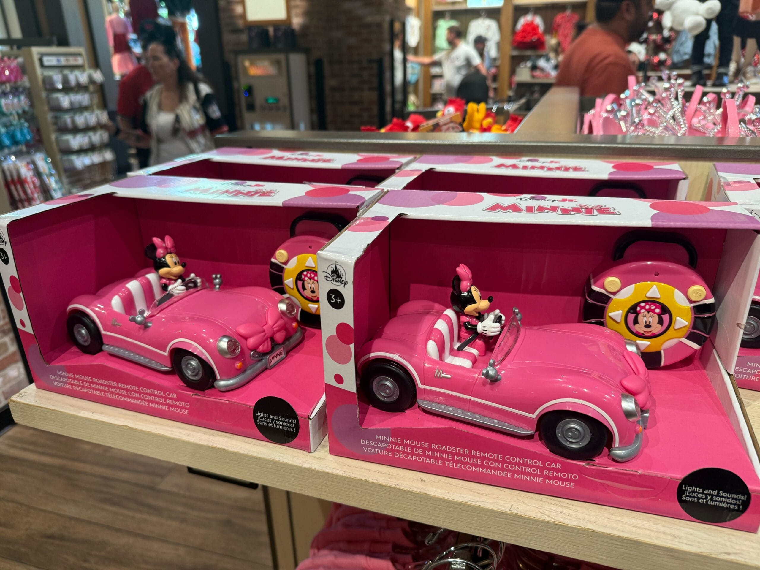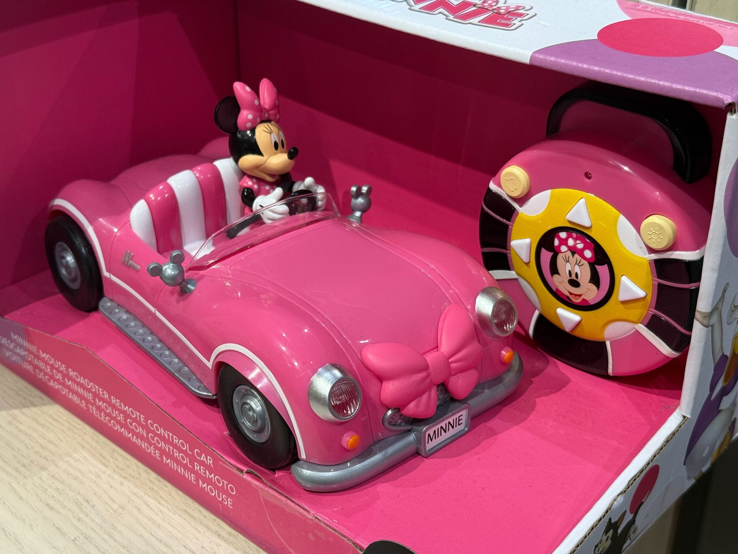 The Minnie Mouse Roadster remote-control car is a pink car with a pink bow on the front of the hood and a MINNIE license plate.
