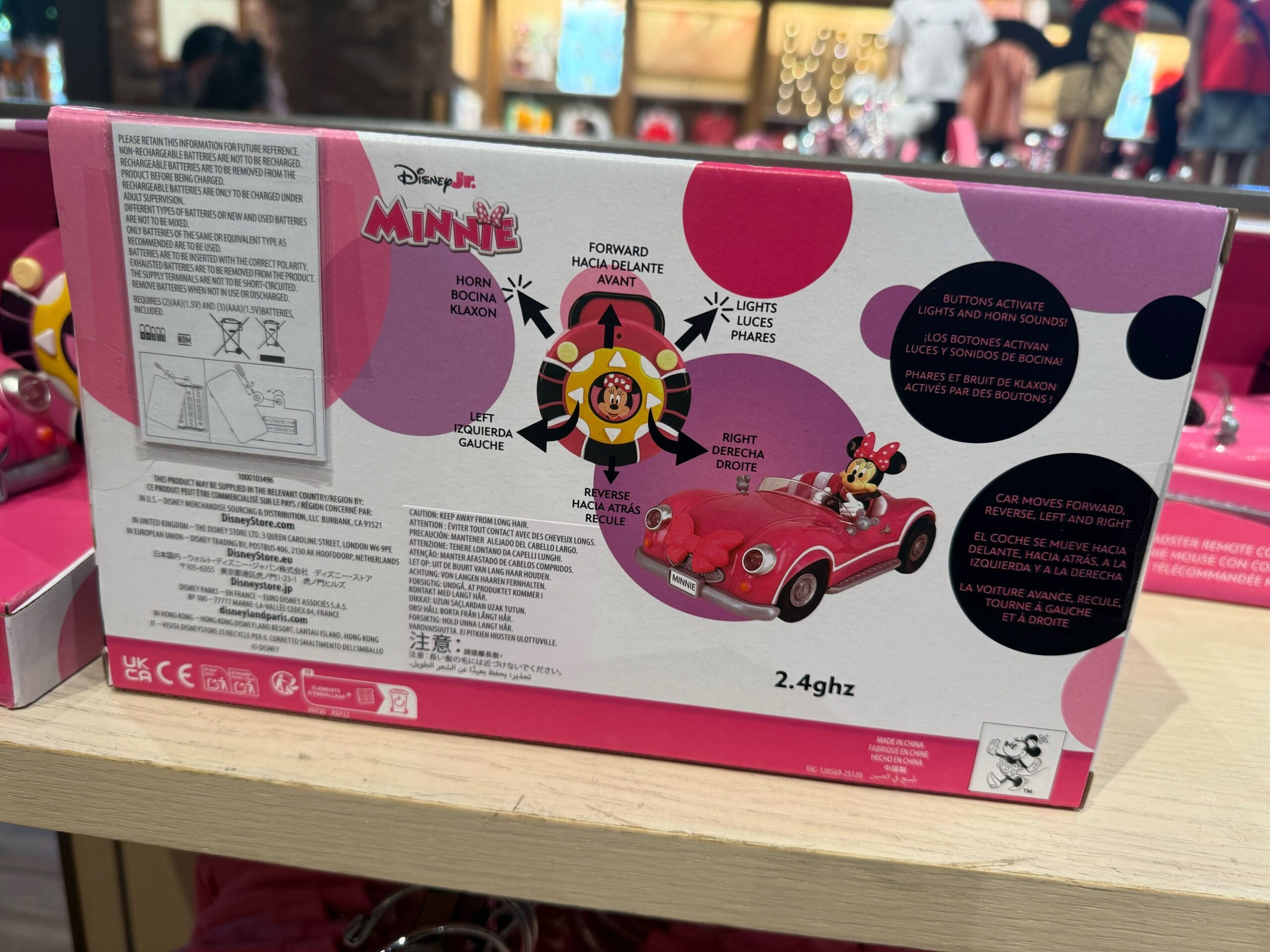 Like the Mickey car, Minnie sits in the driver’s seat with her hands on the wheel. The back of the box shows that the buttons activate lights and horn sounds. The car also moves forward, reverse, left, and right. The remote control is circular with an image of Minnie’s face in the middle.
