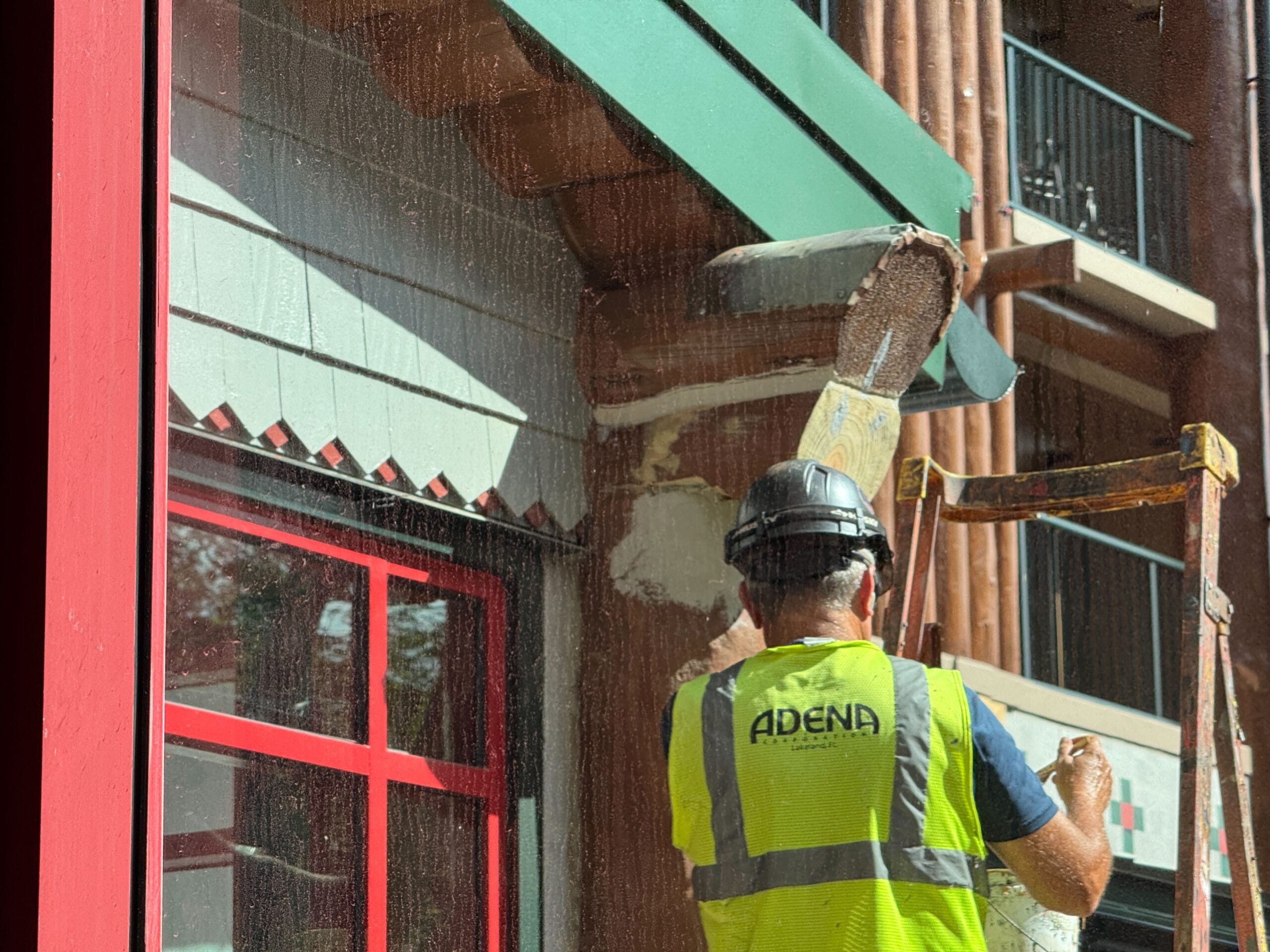 It looks like part of the fake logs on the exterior of the Wilderness Lodge had been broken away and reconstructed. This crew member appeared to be painting over the white plaster with fresh brown paint.