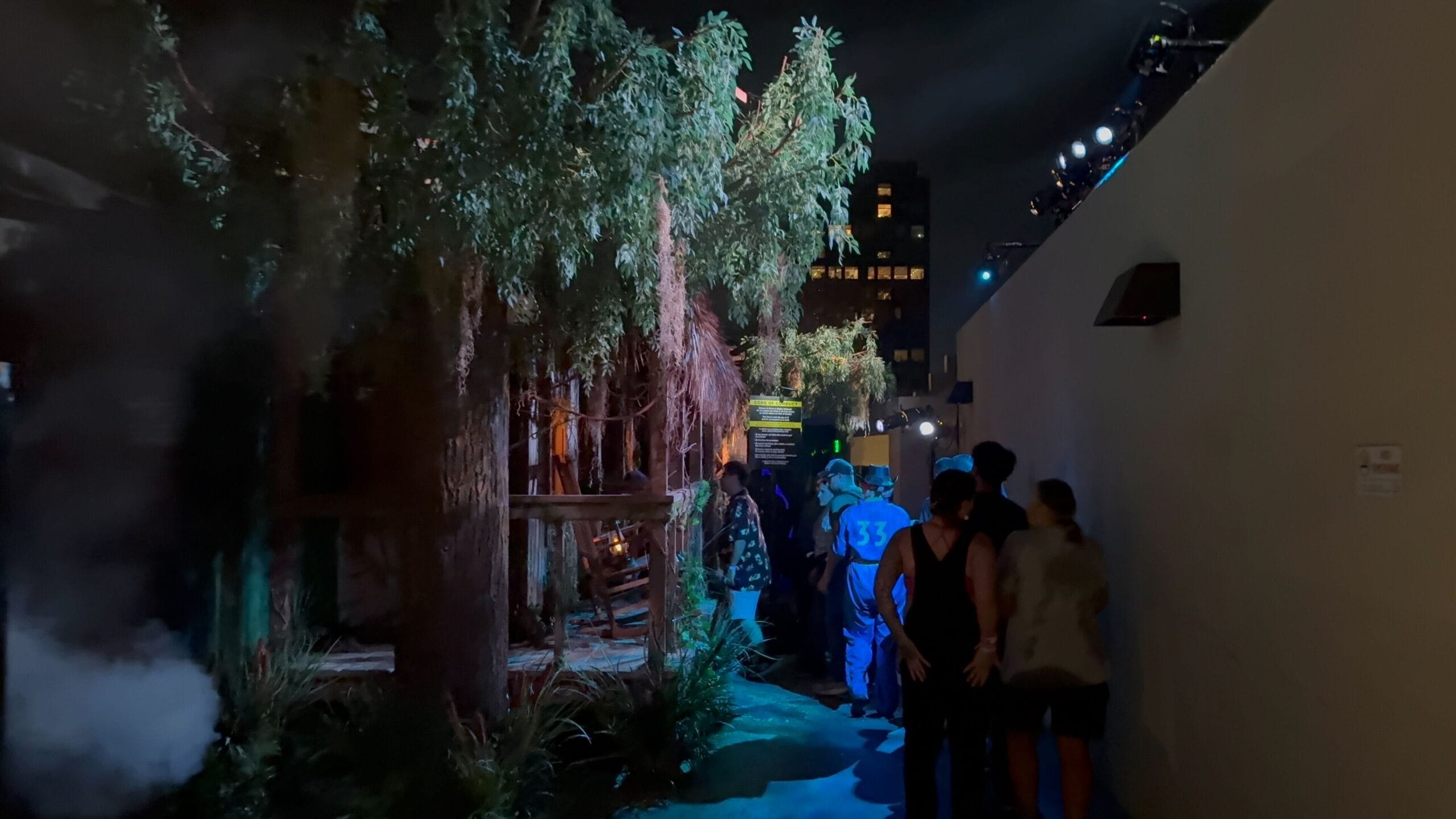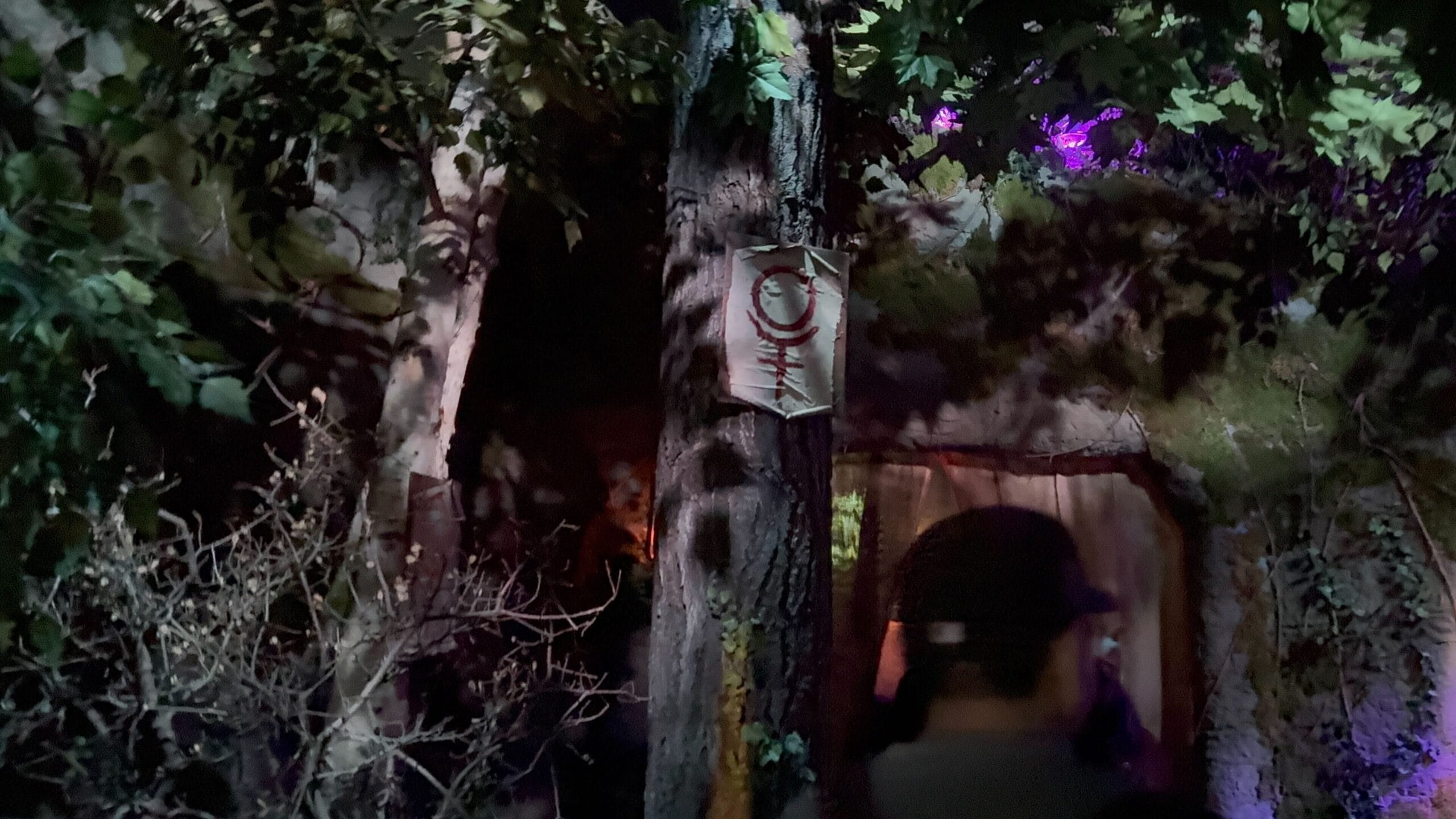 Demons with glowing eyes pace through a dark room before guests exit into the wilderness. The Wyatt Sicks logo is nailed to trees.