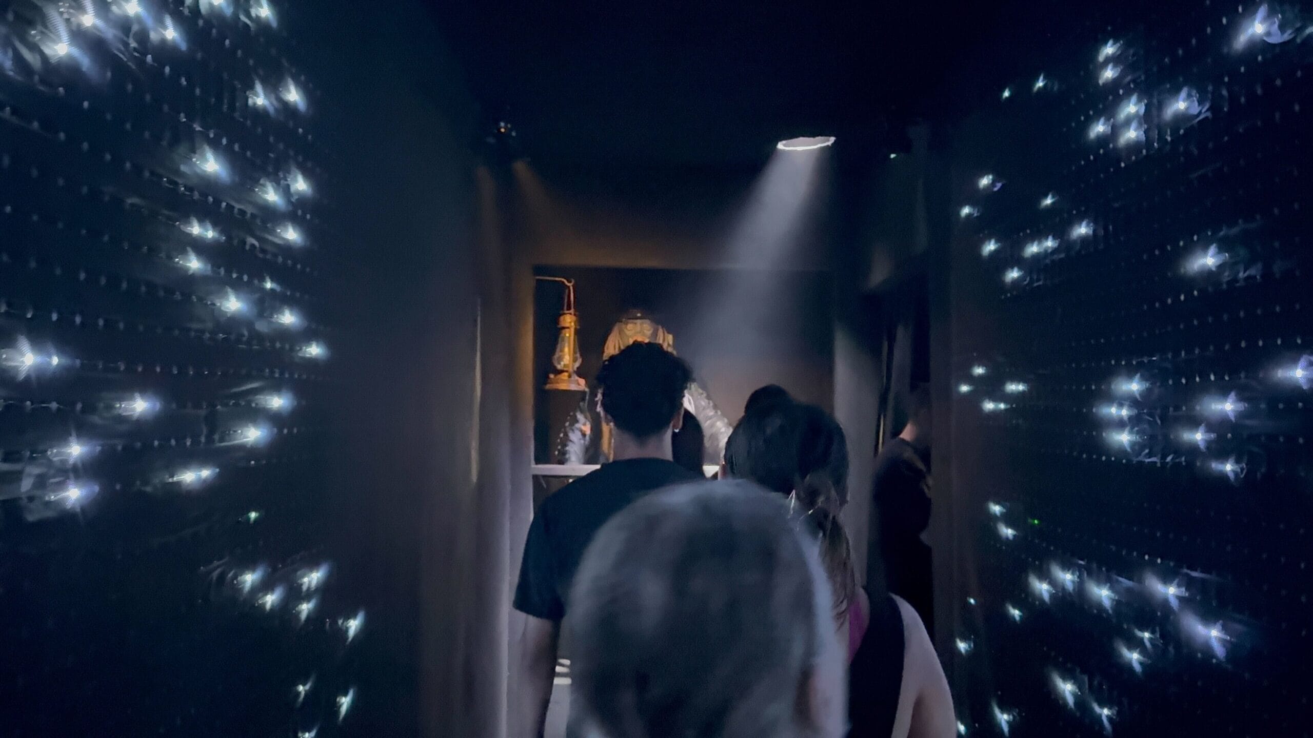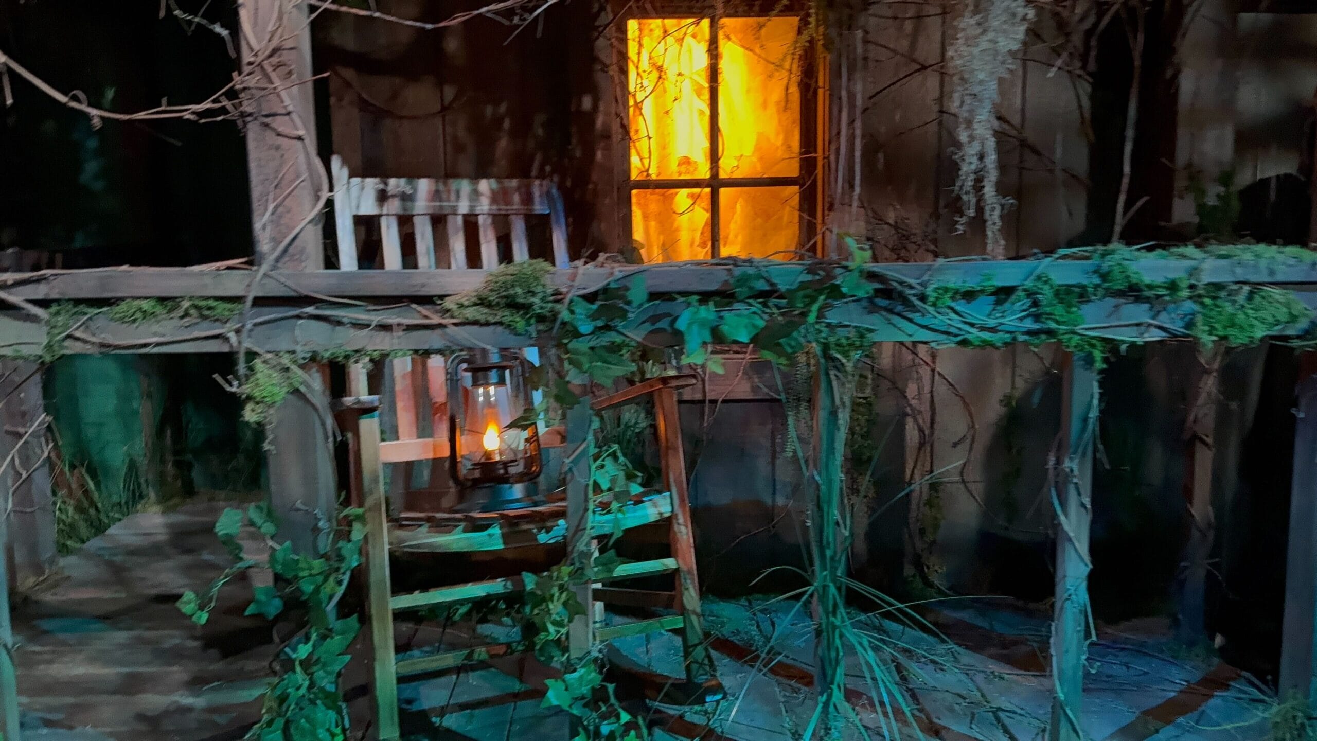 The house is packed full of lore, but is still enjoyable for guests who don’t know anything about the Wyatt Sicks. Guests enter through a farmhouse-style facade, passing a tree full of twinkling firefly lights. On the patio is a rocking chair holding a lantern.