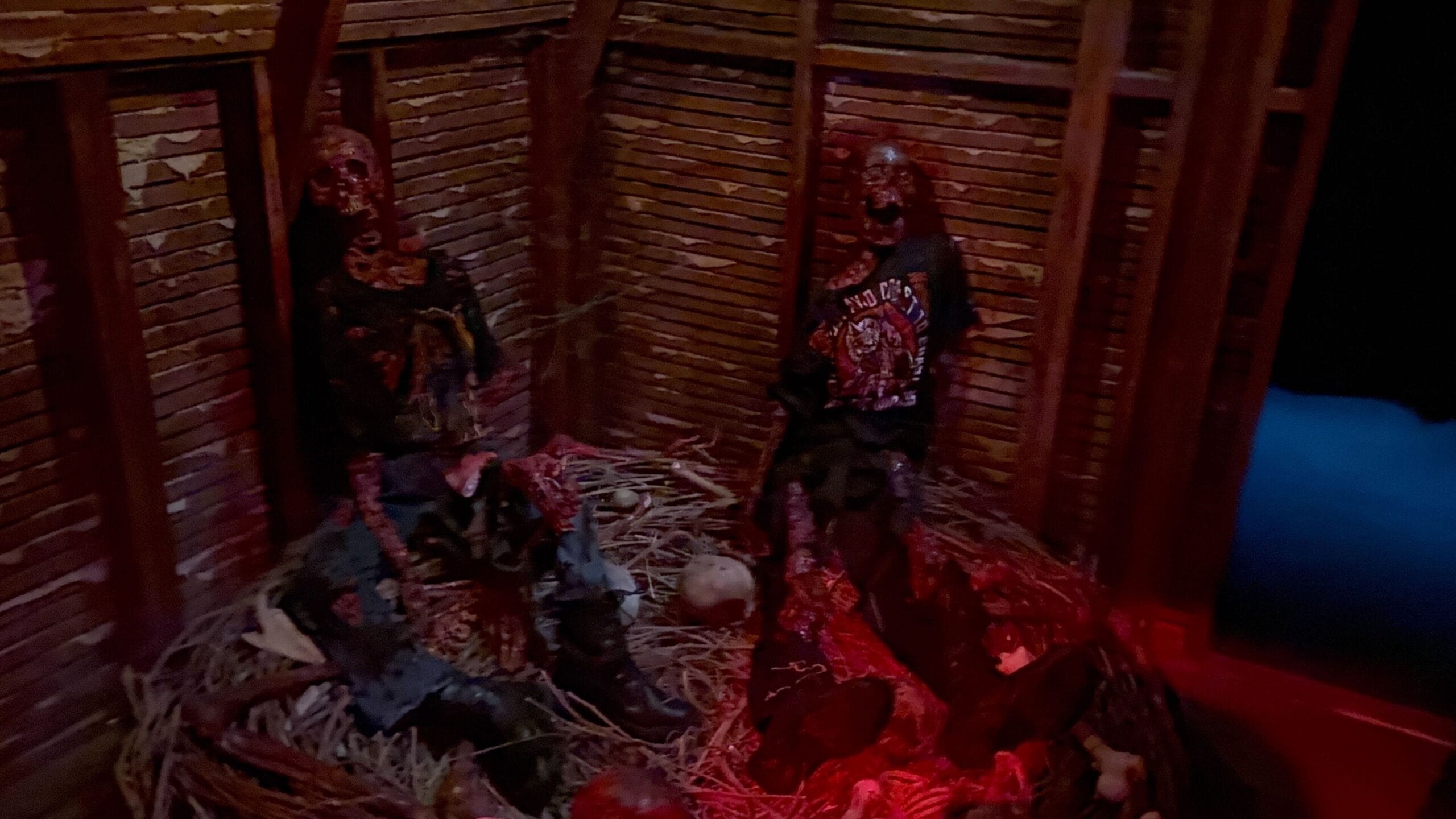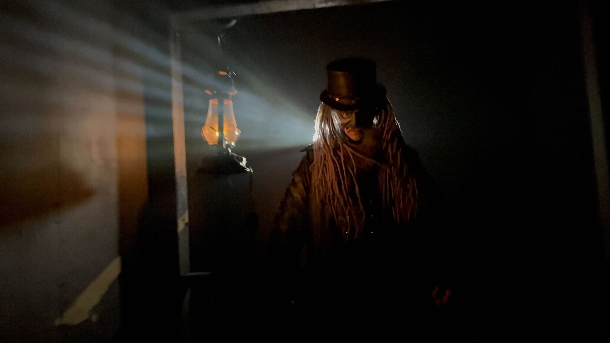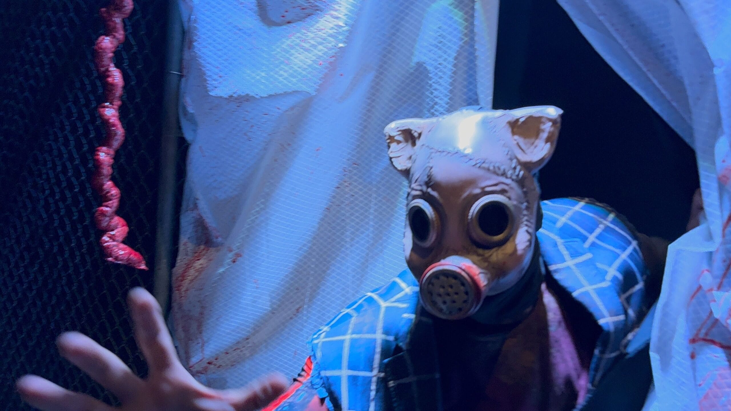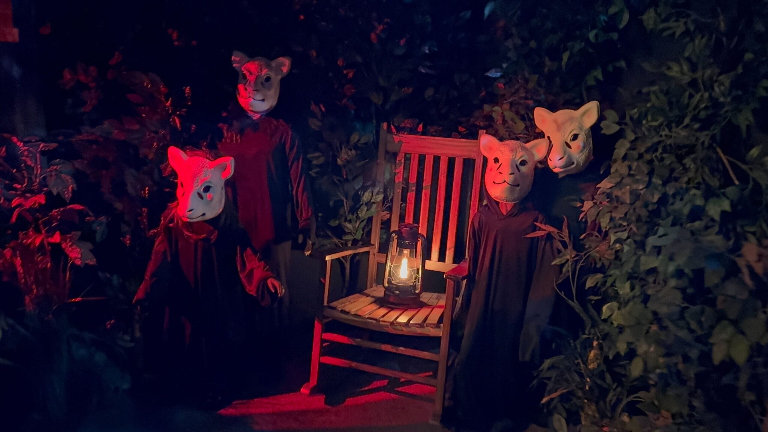 As guests walk “outside” again, all of the Wyatt Sicks members reappear. The figures of children in pig masks are gathered around another walking chair with a lantern. Guests enter a farmhouse on fire.