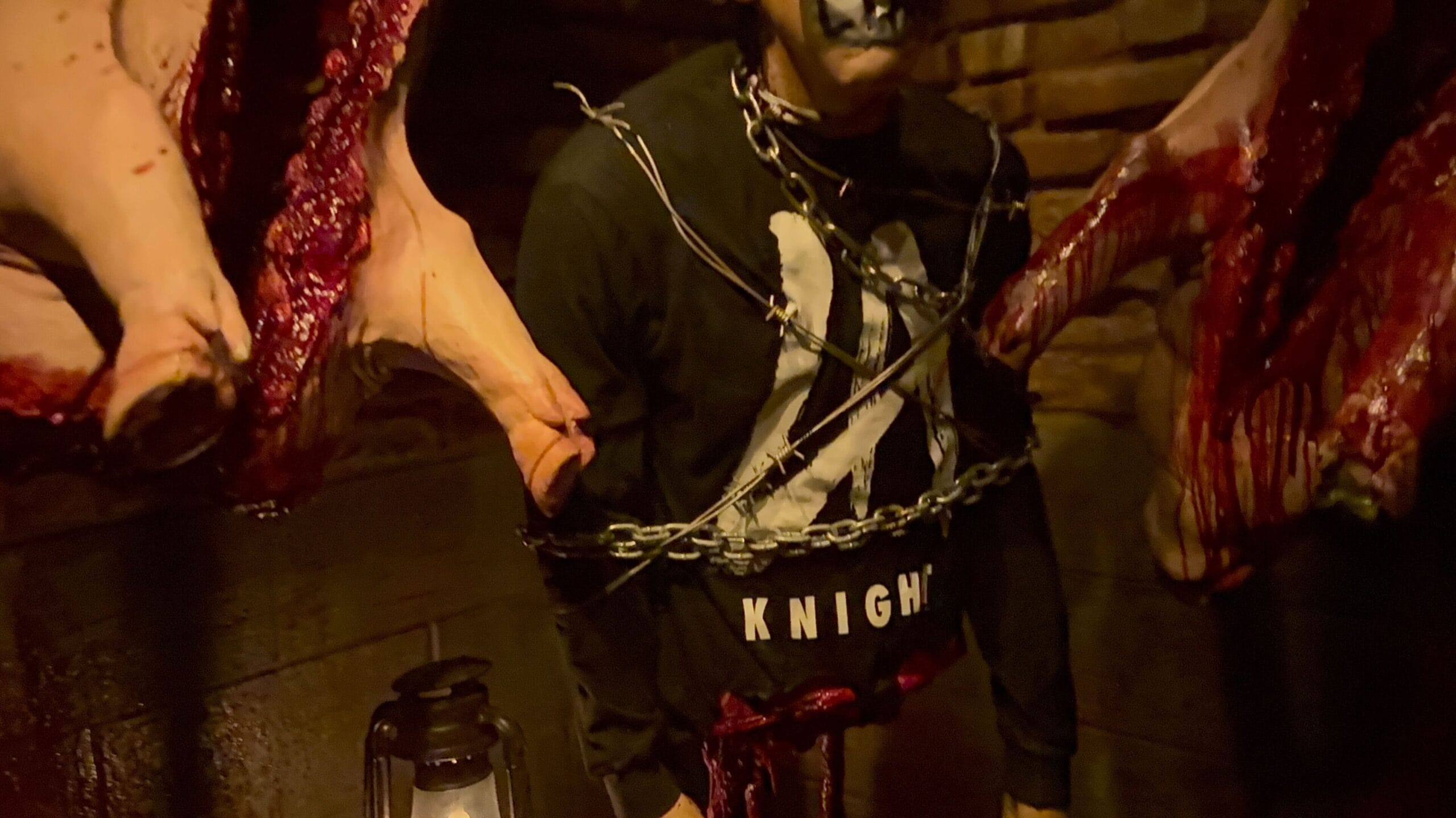 Then guests make their way into Huskus the Pig Boy’s Realm. This is pretty obvious, based on all the hanging pig carcasses. We also noticed that all the human victims are wearing shirts for other wrestlers. Sorry, LA Knight.