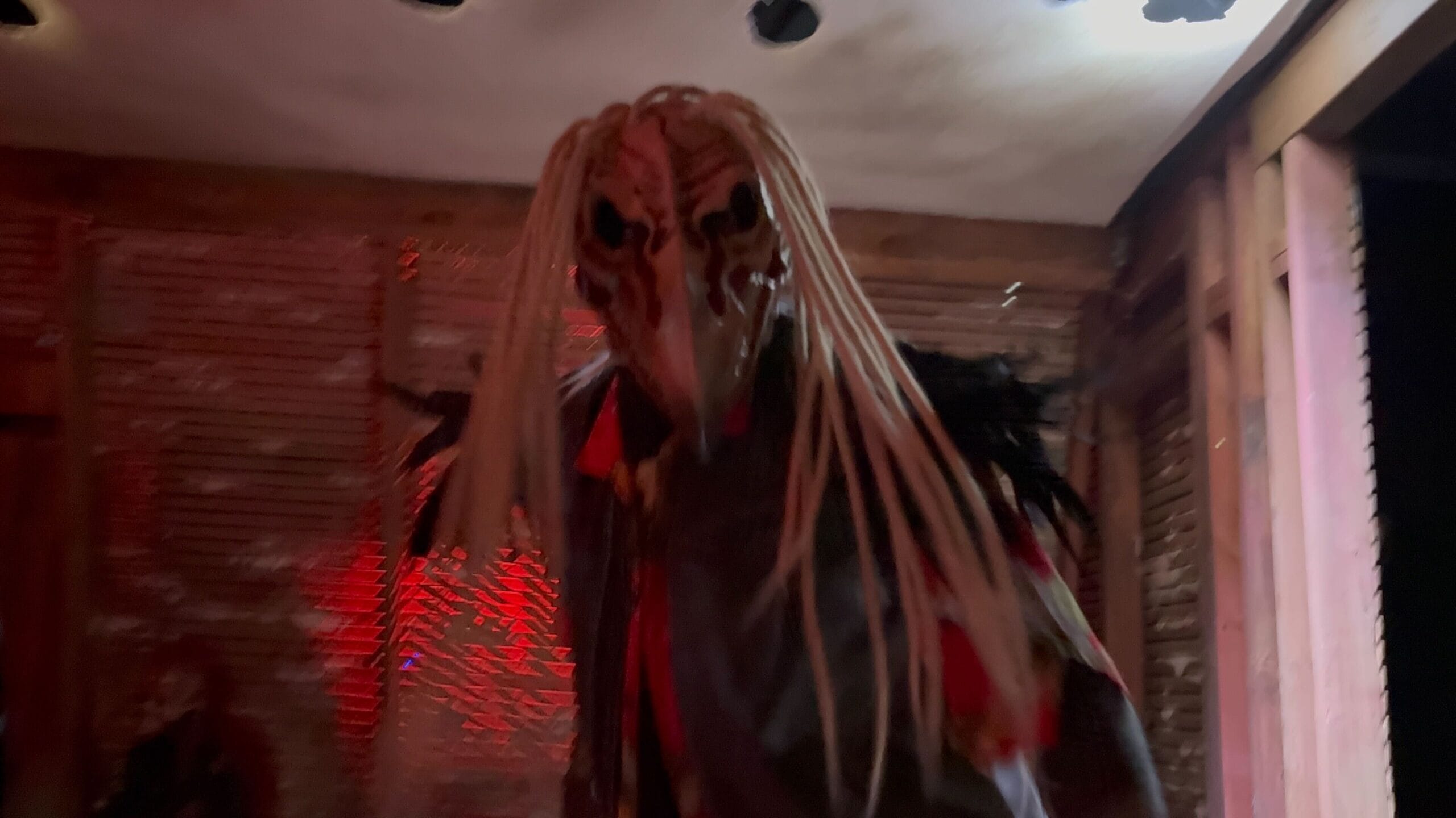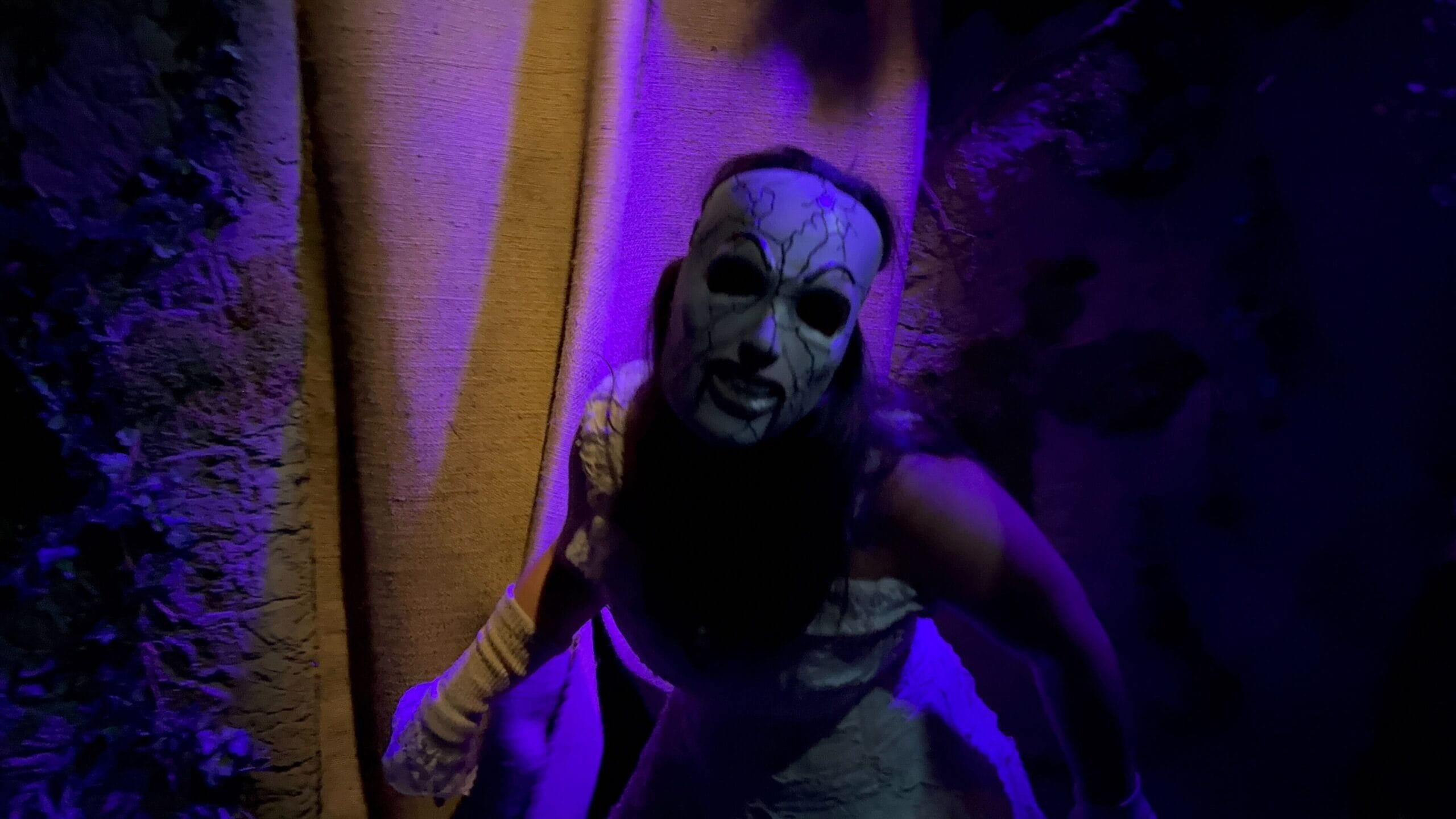 An Abby scareactor, all in white, pops out before guests enter Abby’s Witch Hut. Inside, a body bobs inside a cauldron. Outside the hut is another encounter with Uncle Howdy.