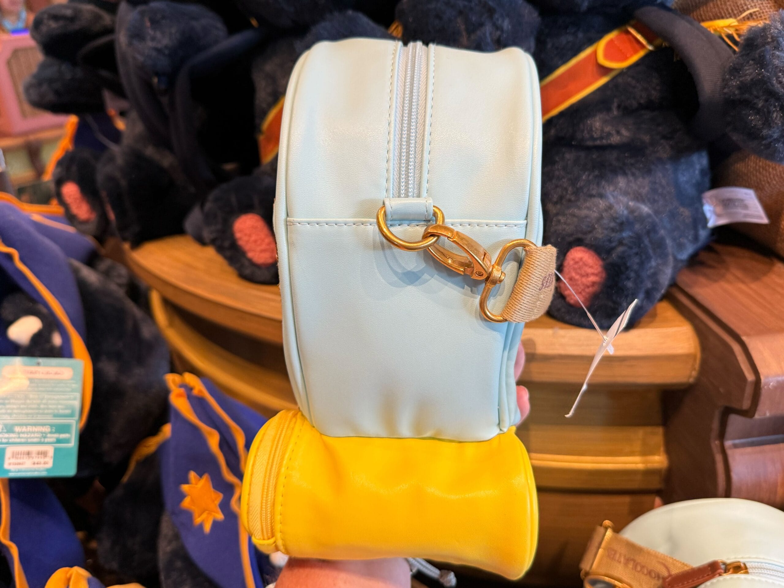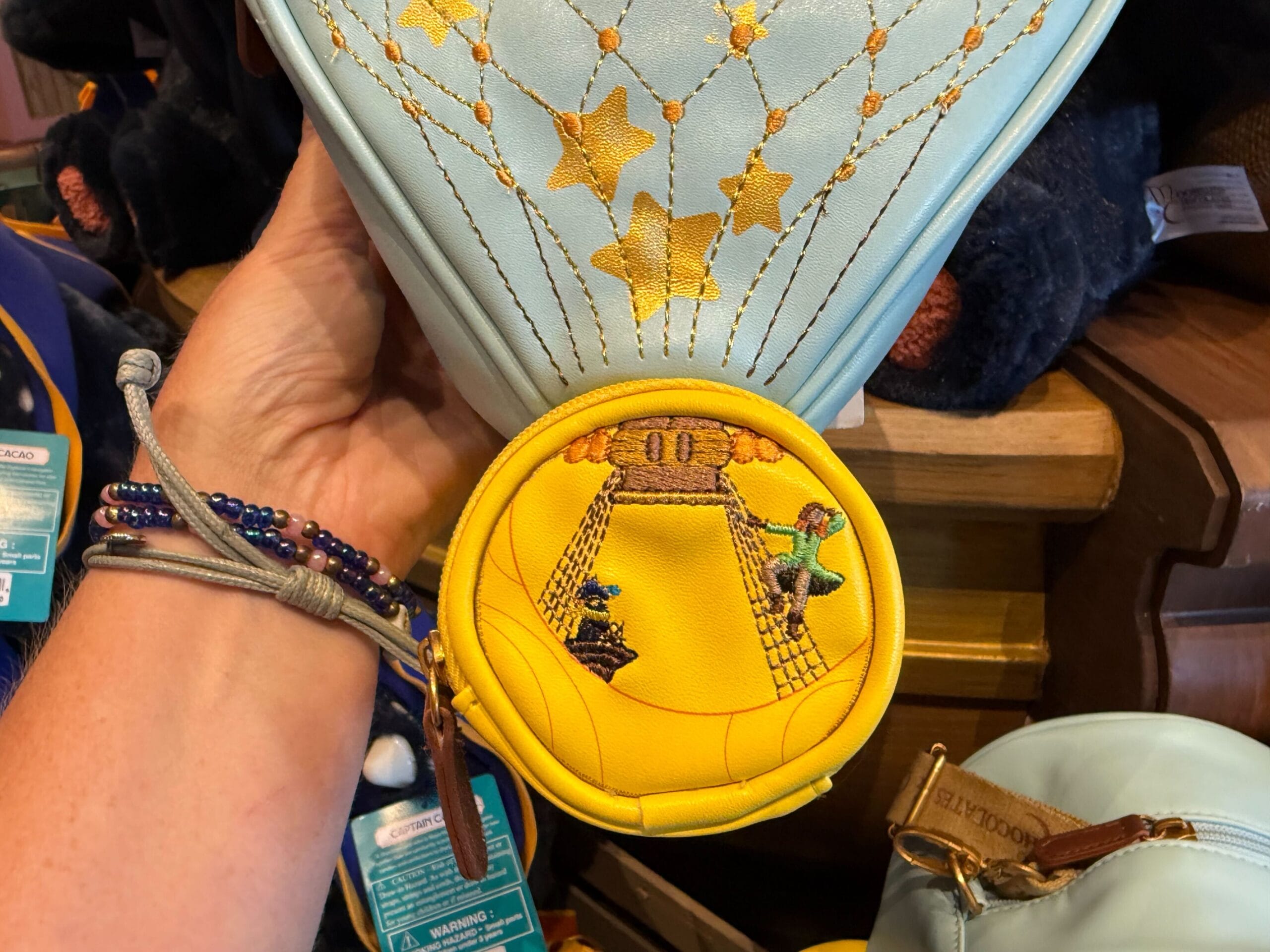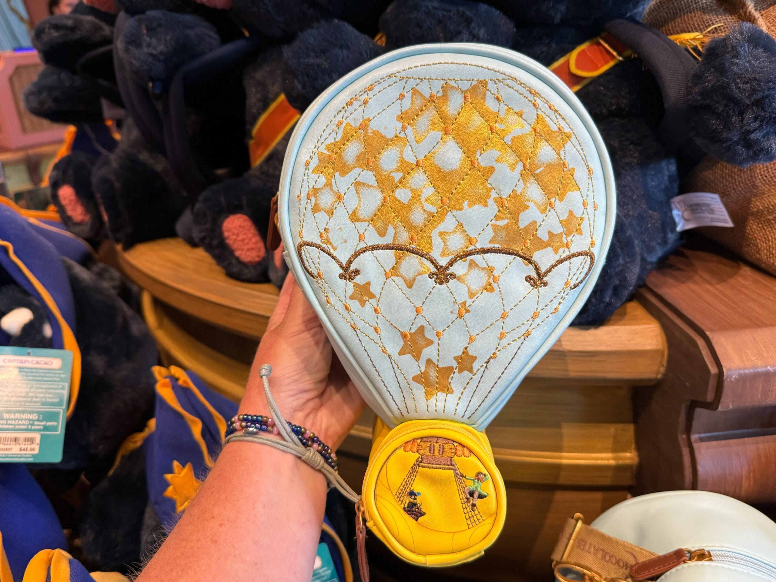 It has gold stars on the front, and the yellow basket at the bottom zips open for extra storage. On the basket, you’ll see Captain Cacao and Maya of the Skies.