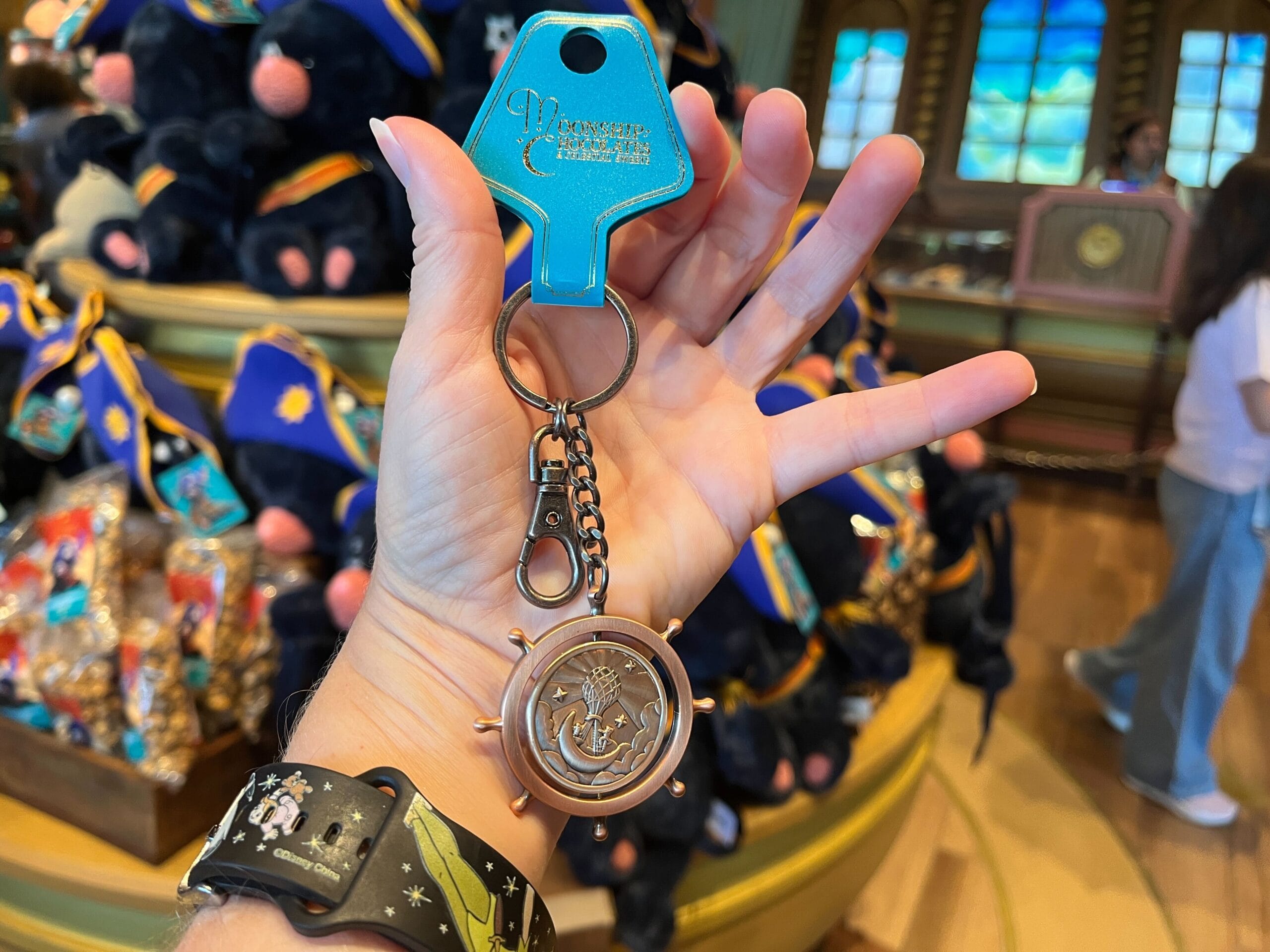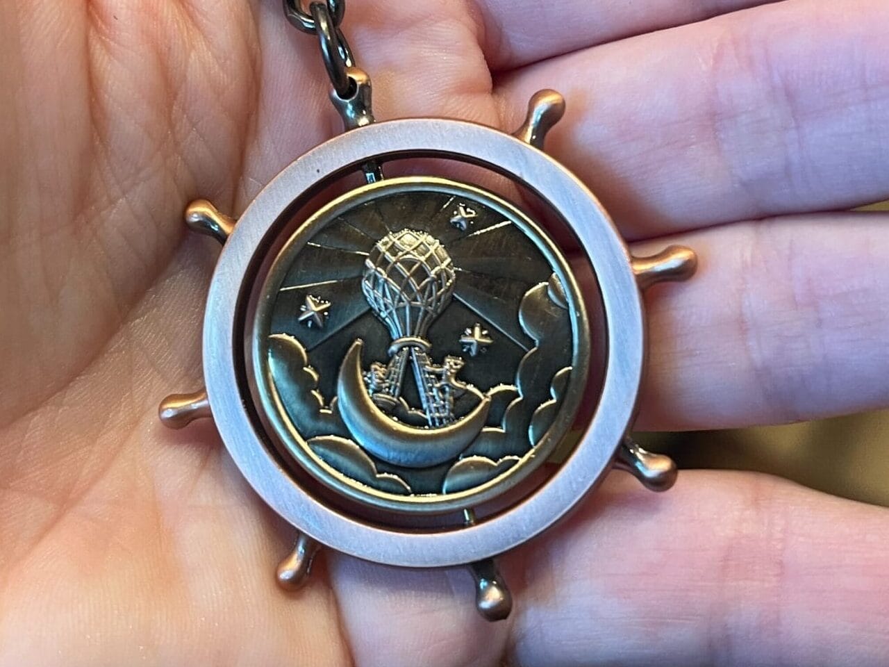 The keychain is a metallic helm for a boat or (moon)ship. Inside, the Moonship Chocolates logo rests in the middle.