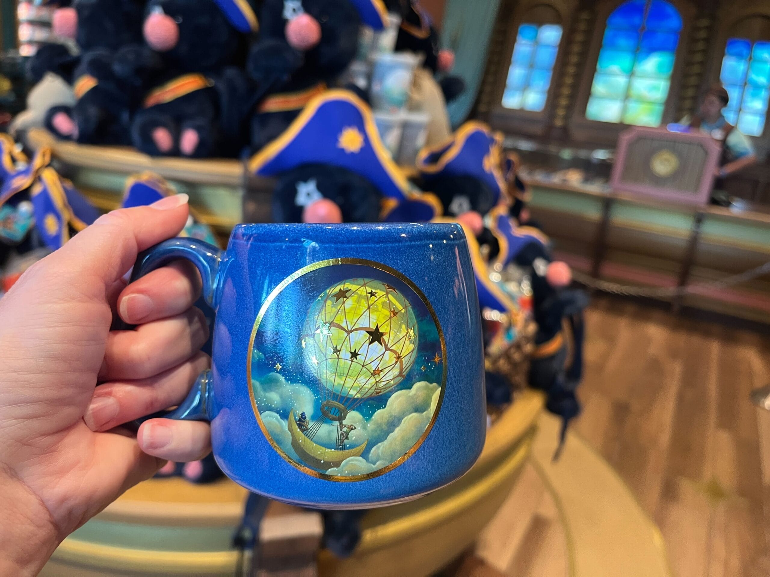 The blue mug has an image of the Moonship flying through the clouds at night. A gold border matches the Moonship Chocolates wordmark on the other side.