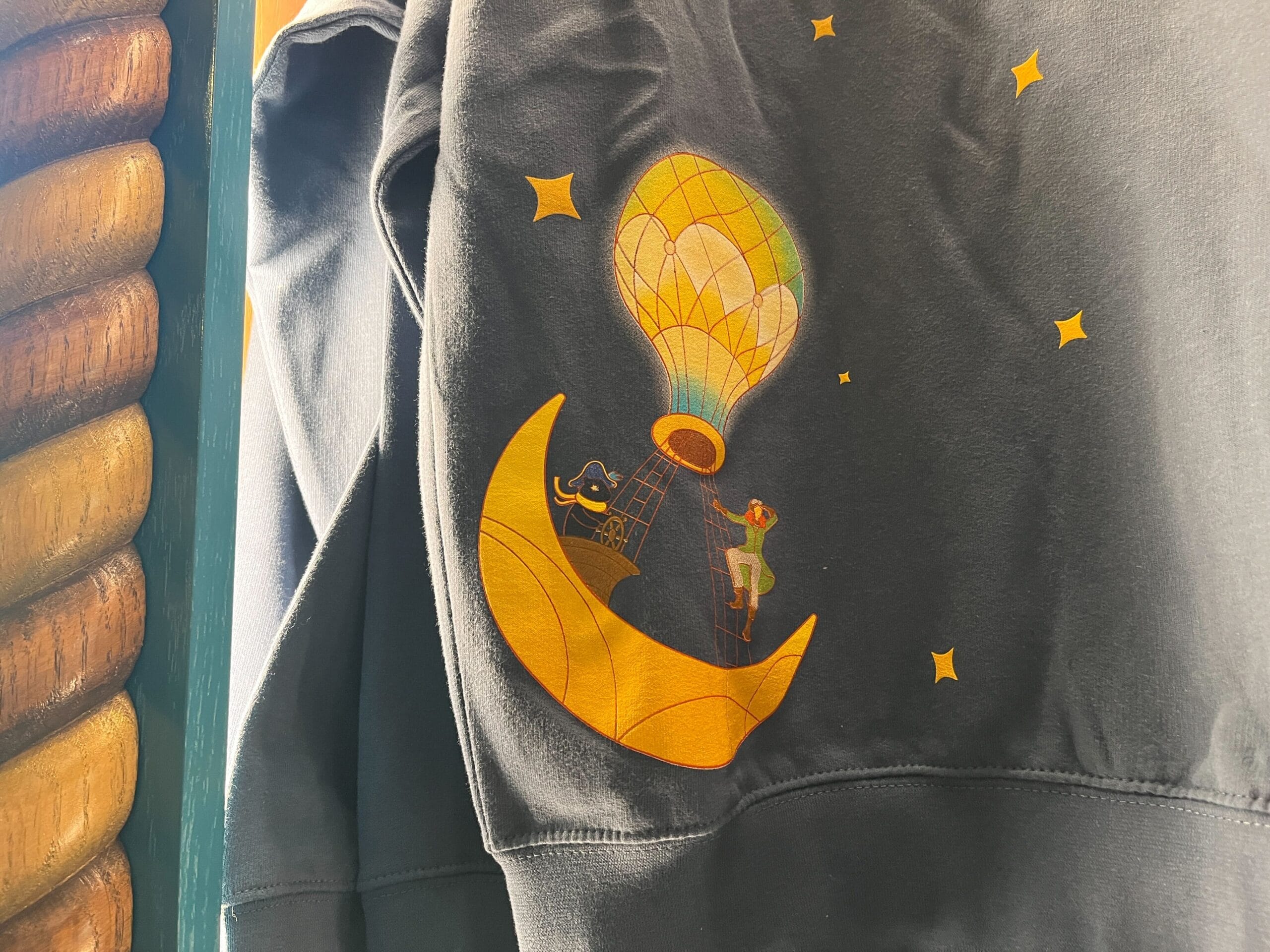 The Moonship Chocolates logo sits in the middle of the dark blue sweatshirt in gold lettering. The bottom corner has an image of the Moonship with Captain Cacao and Maya of the Skies.
