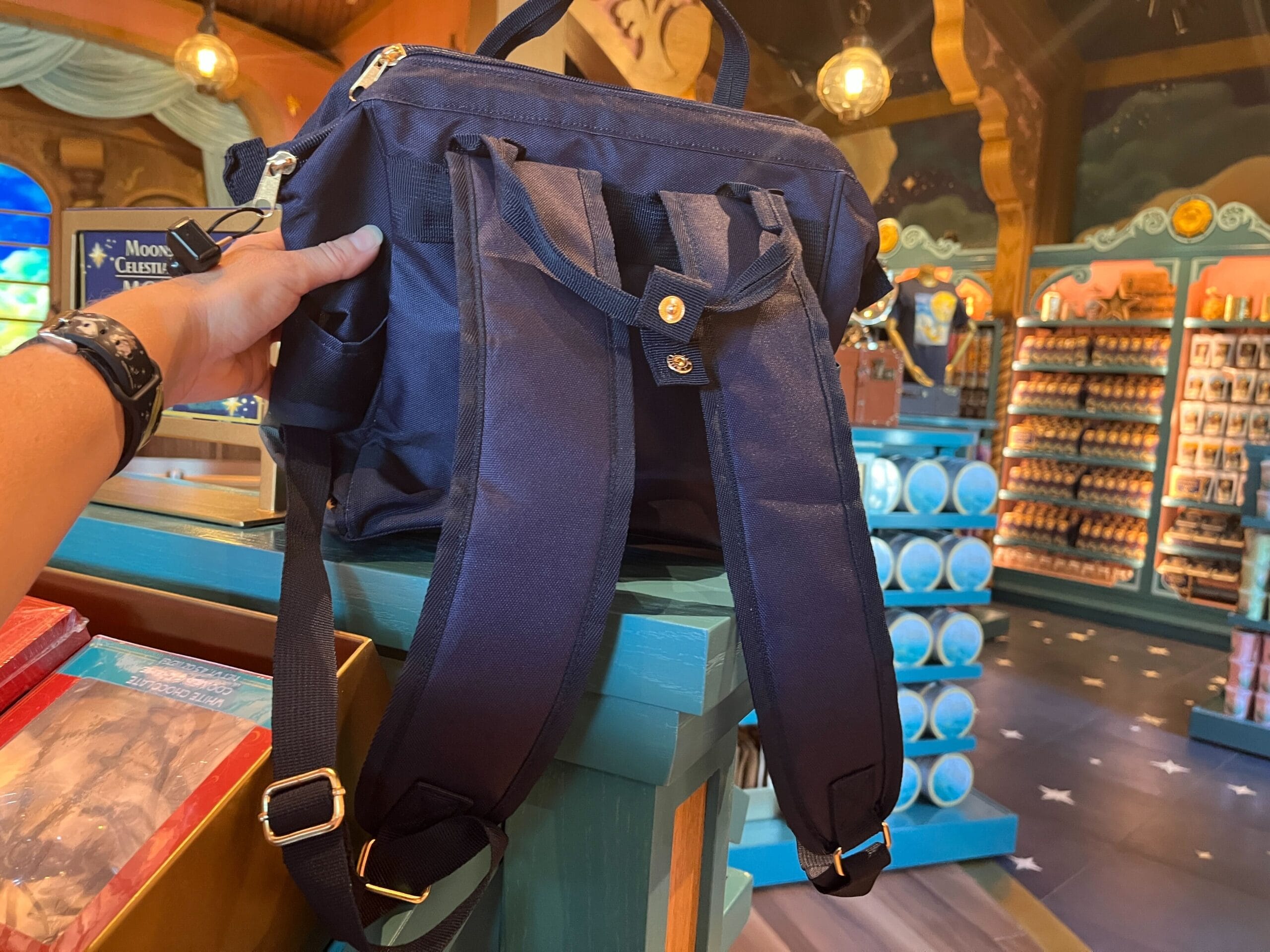 The back has the Moonship Chocolates wordmark and a moon — both in gold. The adjustable tan strap has the store name written on it.
