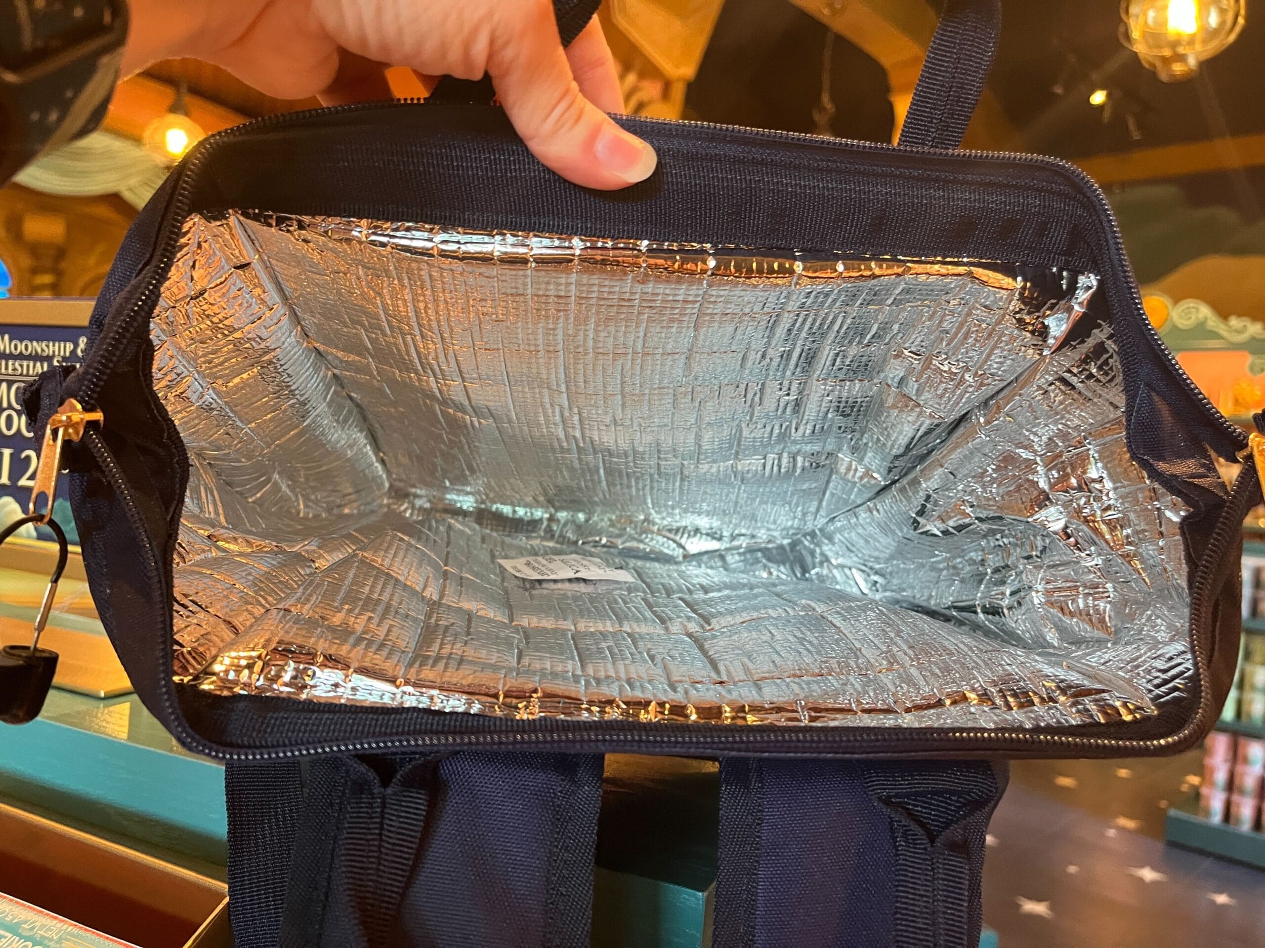 Like other items in the store, this insulated bag is dark blue with the Moonship image and store wordmark.