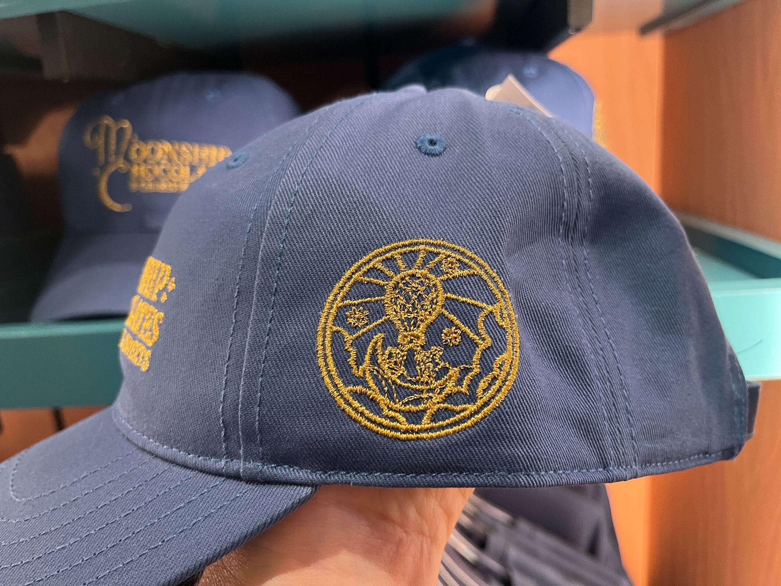 The blue ball cap has the Moonship Chocolates wordmark embroidered on the front and the picture logo embroidered on the side. The back has an adjustable strap.