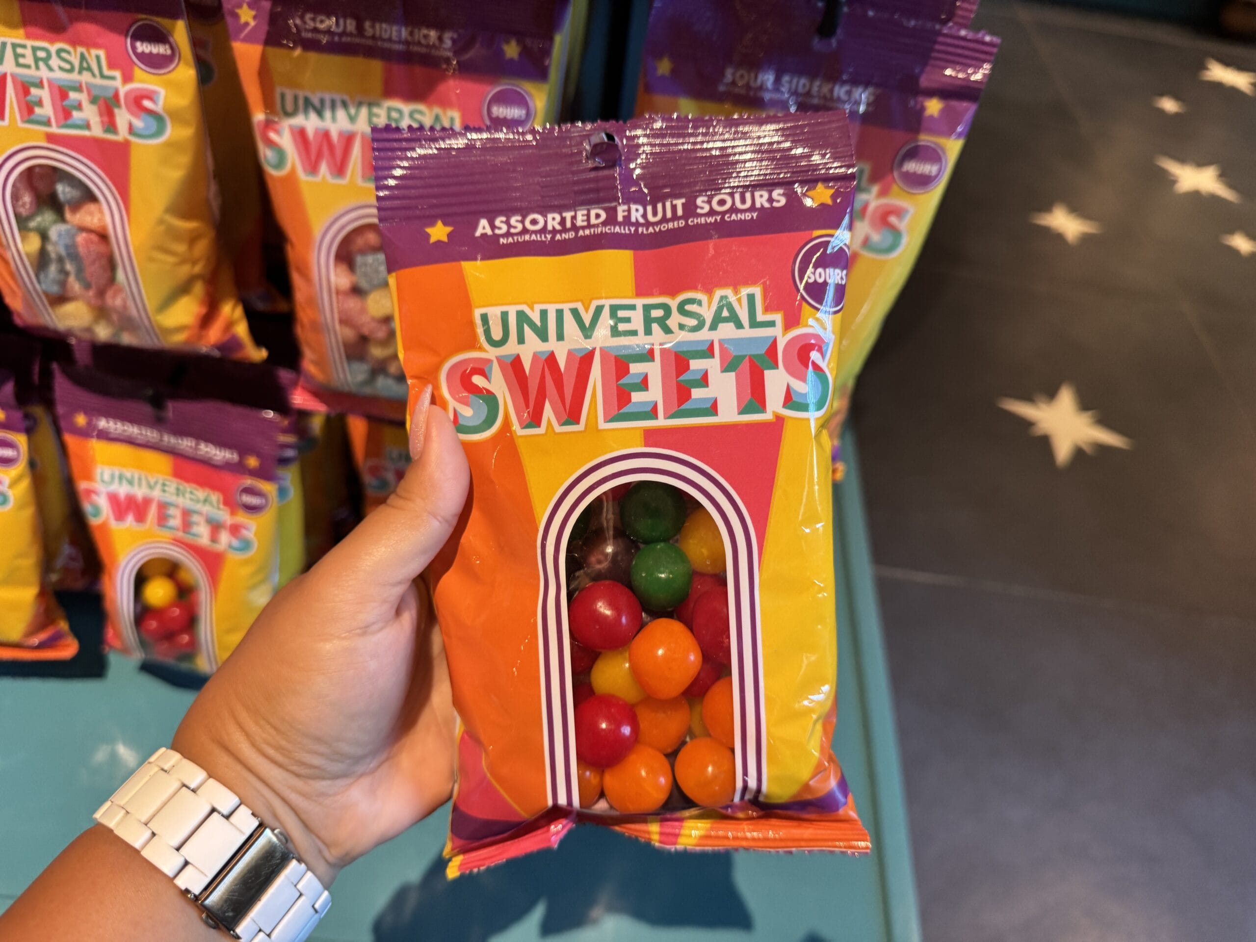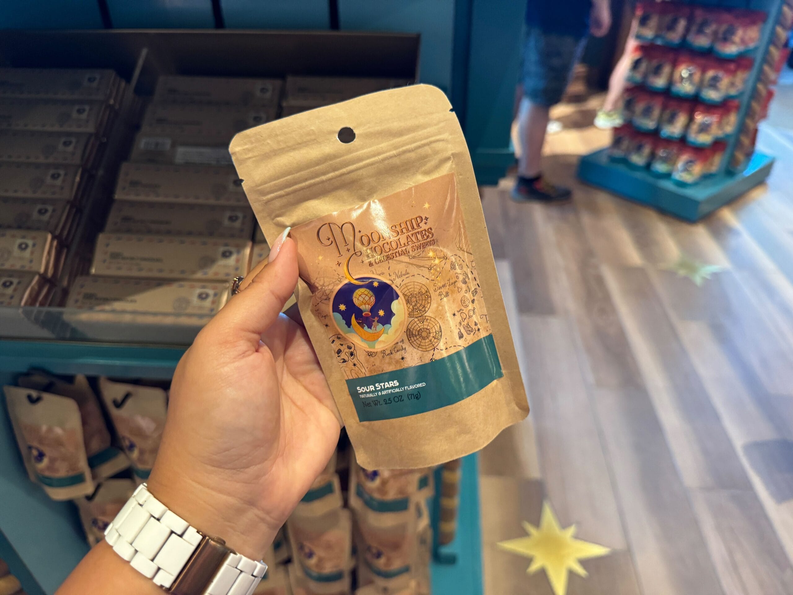 Sour stars candy comes in store-specific tan resealable packaging. The store wordmark is at the top, and the image of the moonship is placed in front of a map.