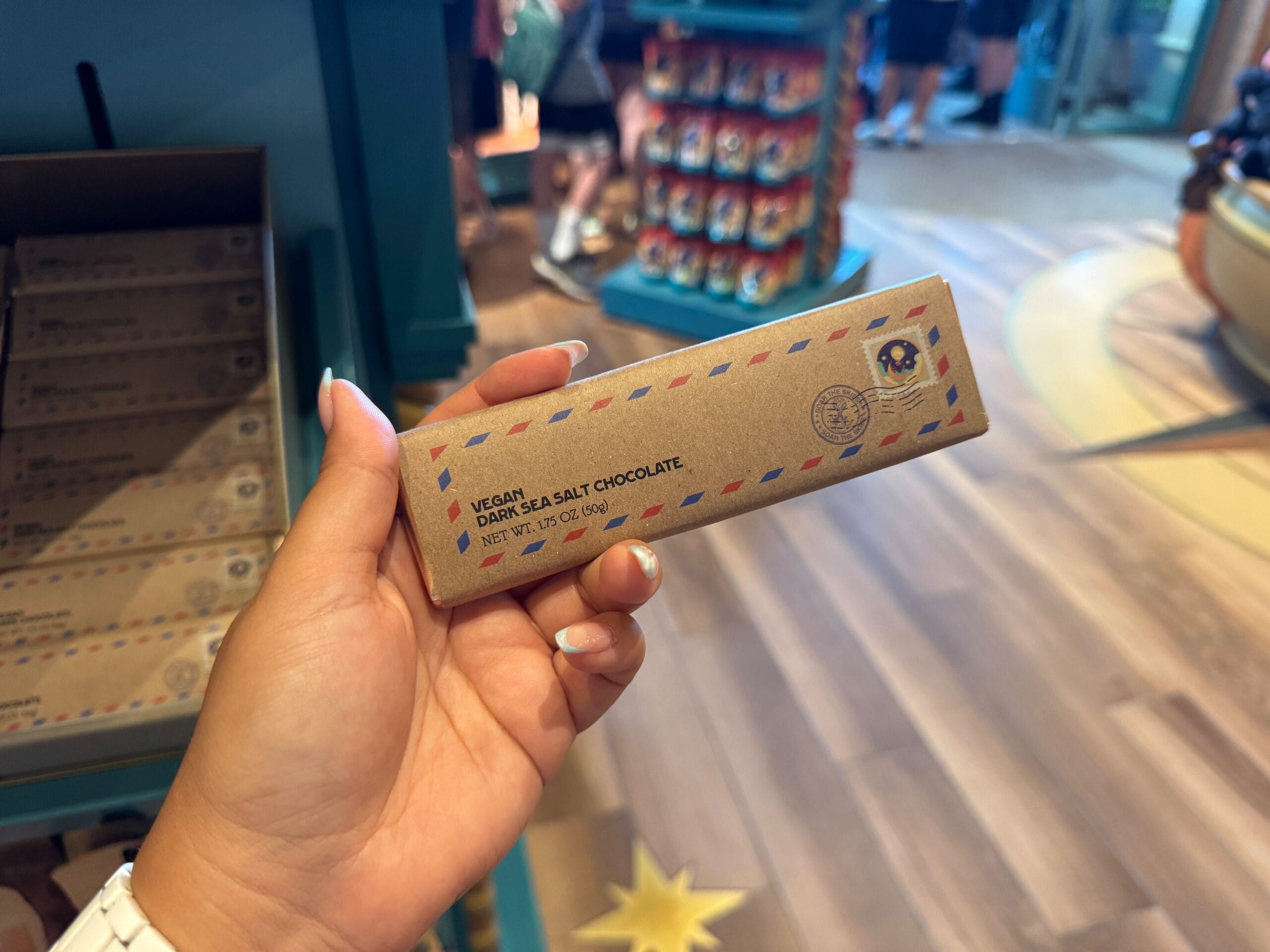 The vegan dark sea salt chocolate bar comes in packaging that looks like a letter. It has a red and blue striped banner on the border along with a stamp and postmark.