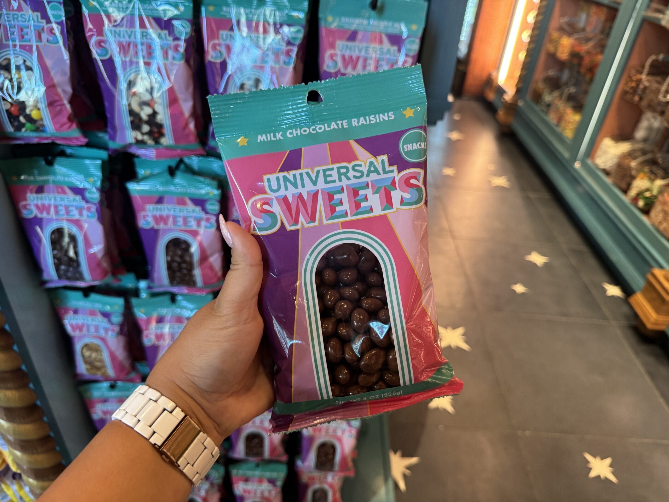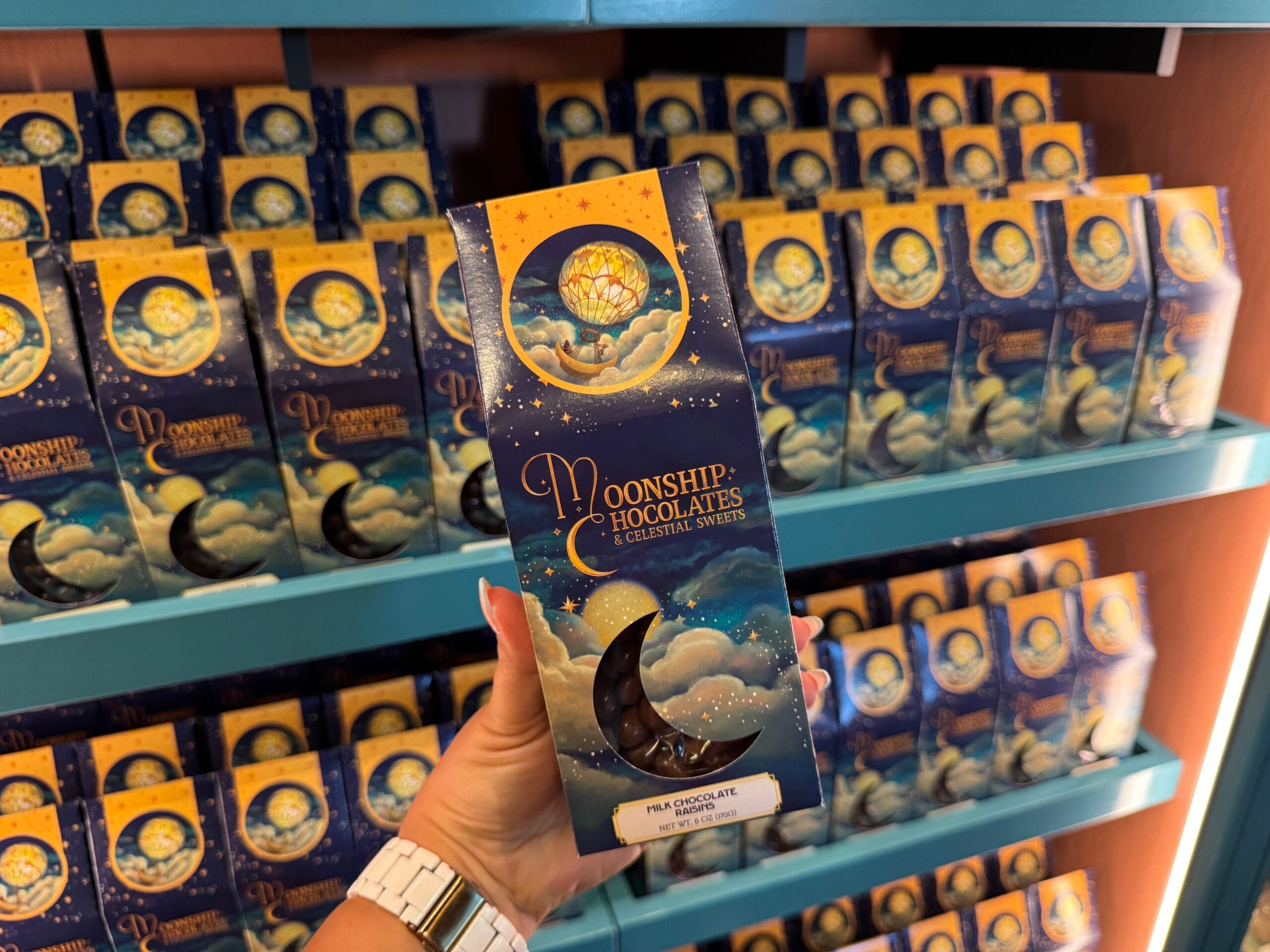 Milk chocolate raisins come in dark blue gable packaging. It’s dark blue with the same designs as other store-specific merchandise. A moon shape cutout lets you see inside the package.