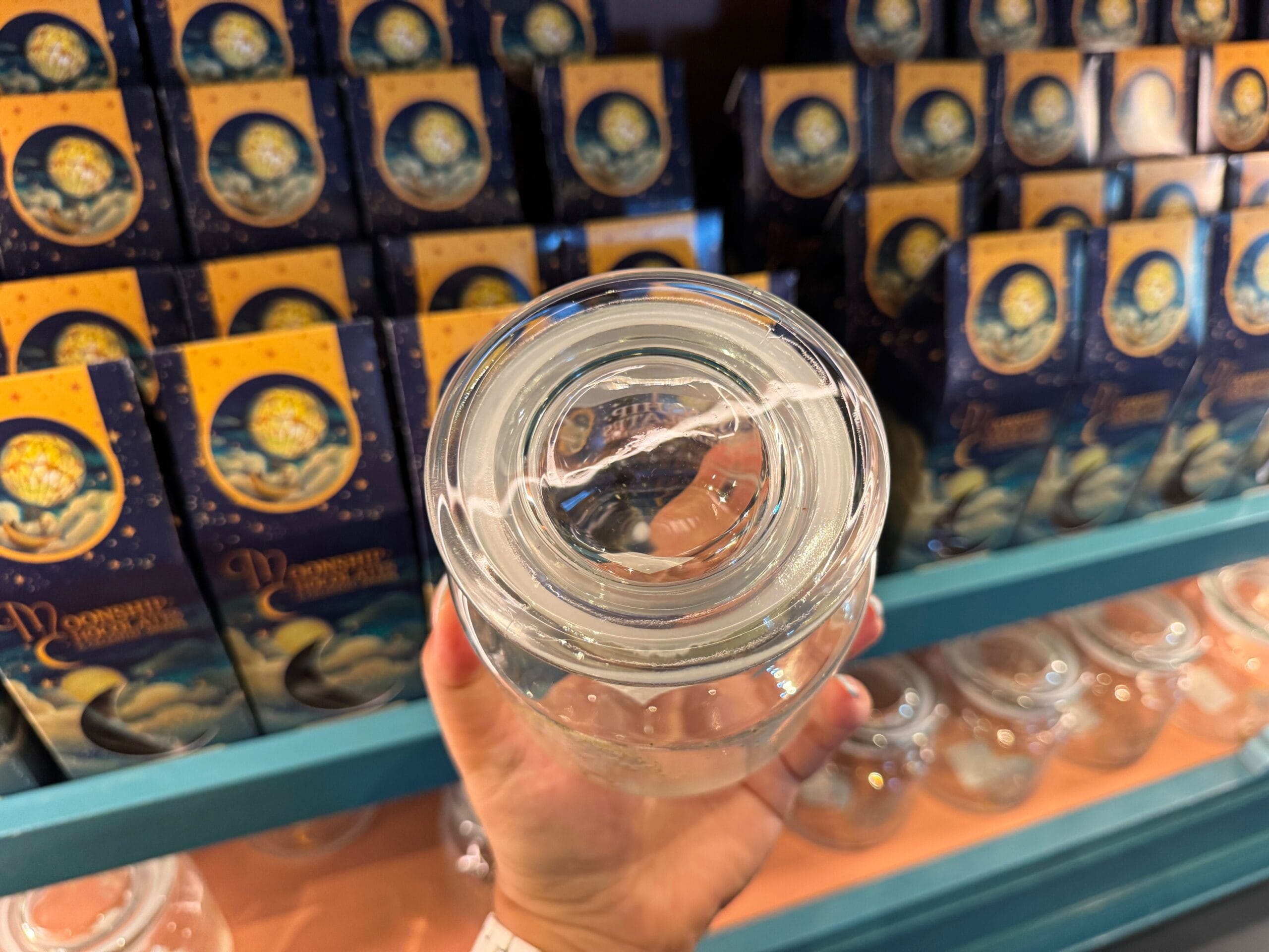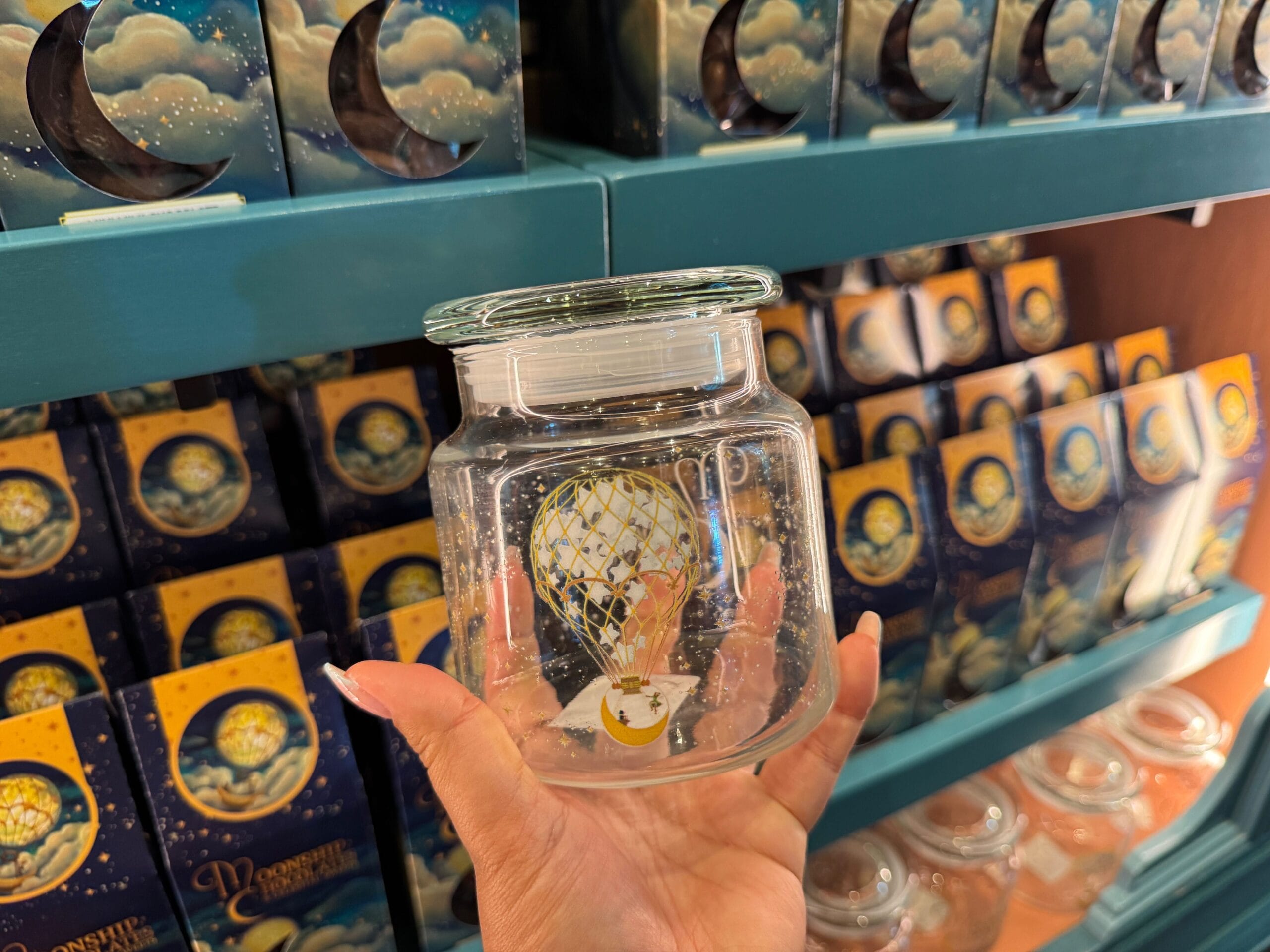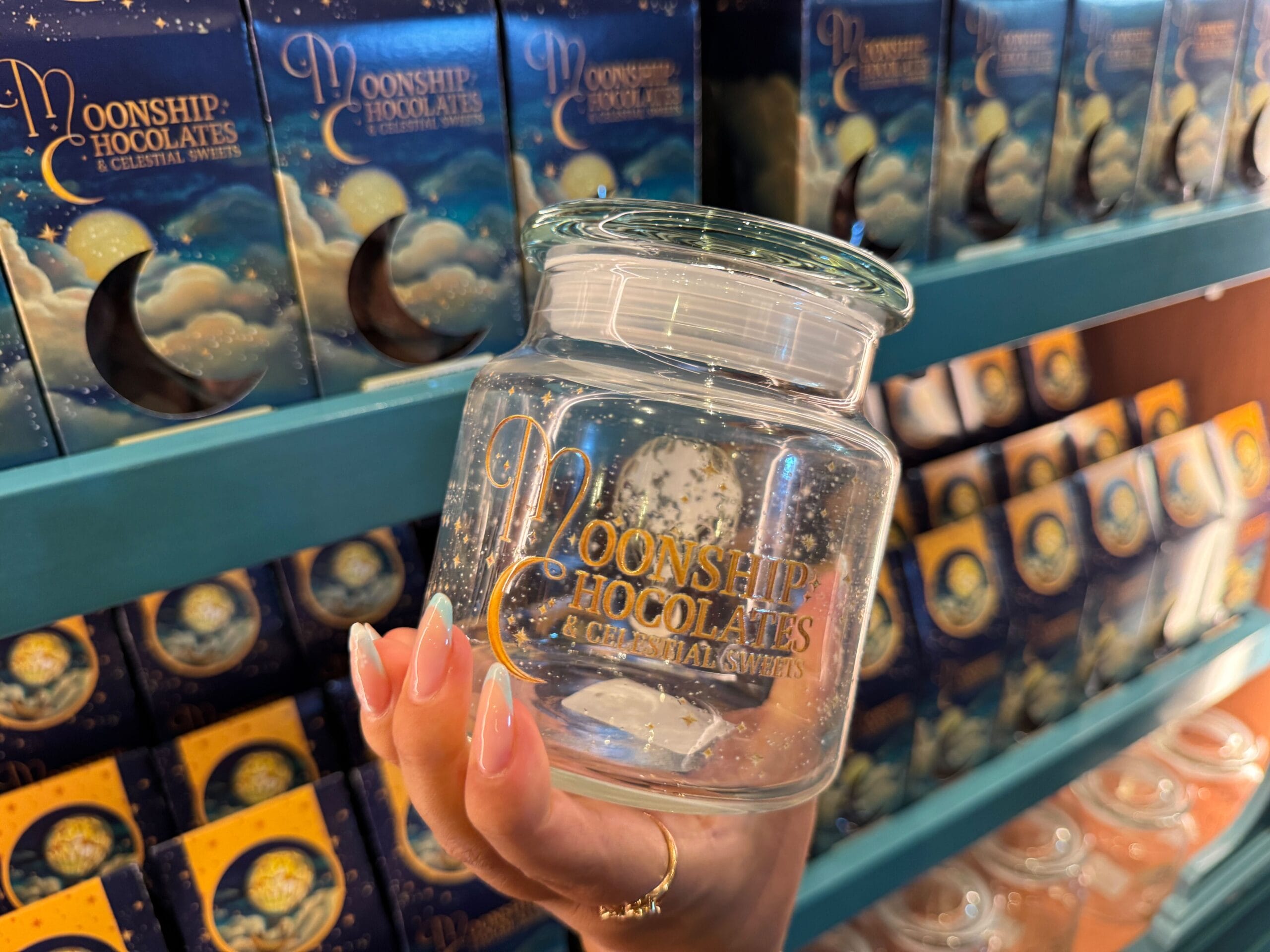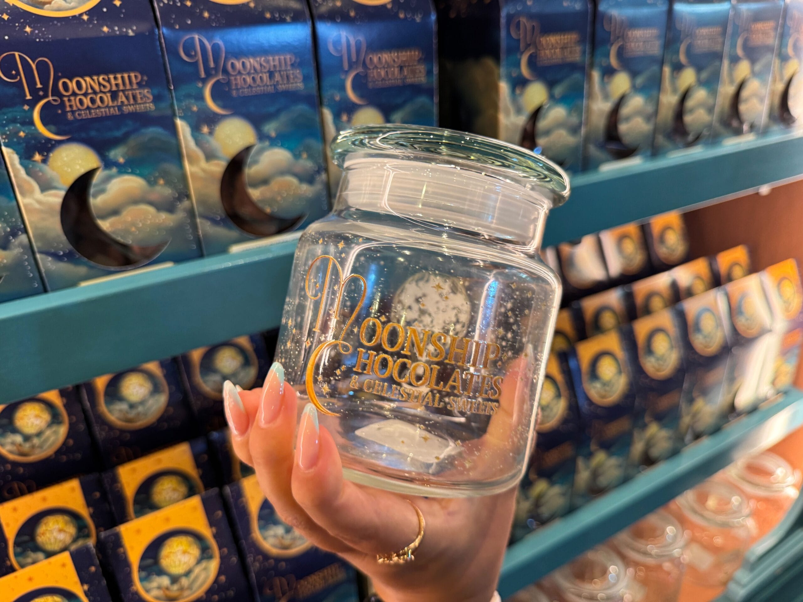 Moonship Chocolates has a make-your-own mix candy station. You can purchase a clear jar to store your candy. The glass jar has the gold wordmark on one side and a gold moonship on the other. The flat lid is a green-blue color.