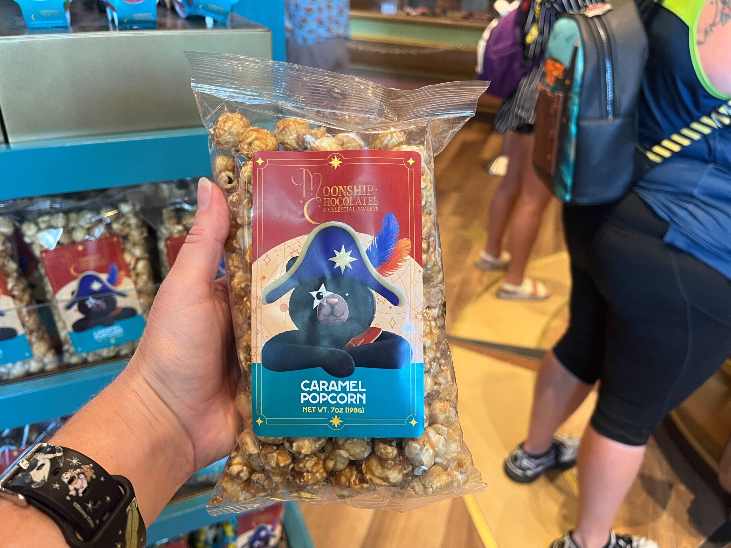 Grab some caramel popcorn at Moonship Chocolates. It comes in clear plastic packaging and has the image of Captain Cacao on the front.