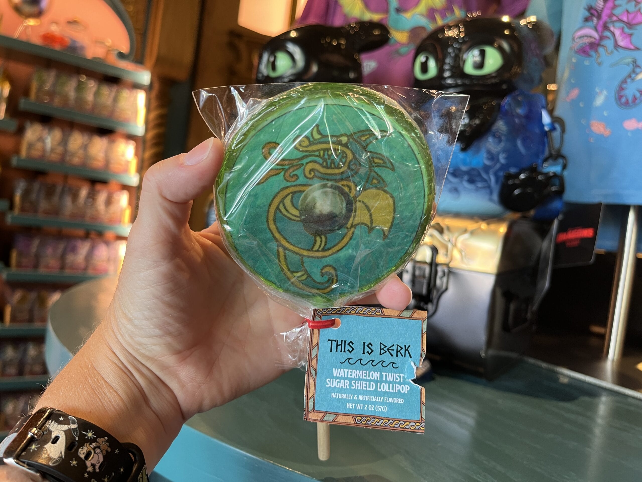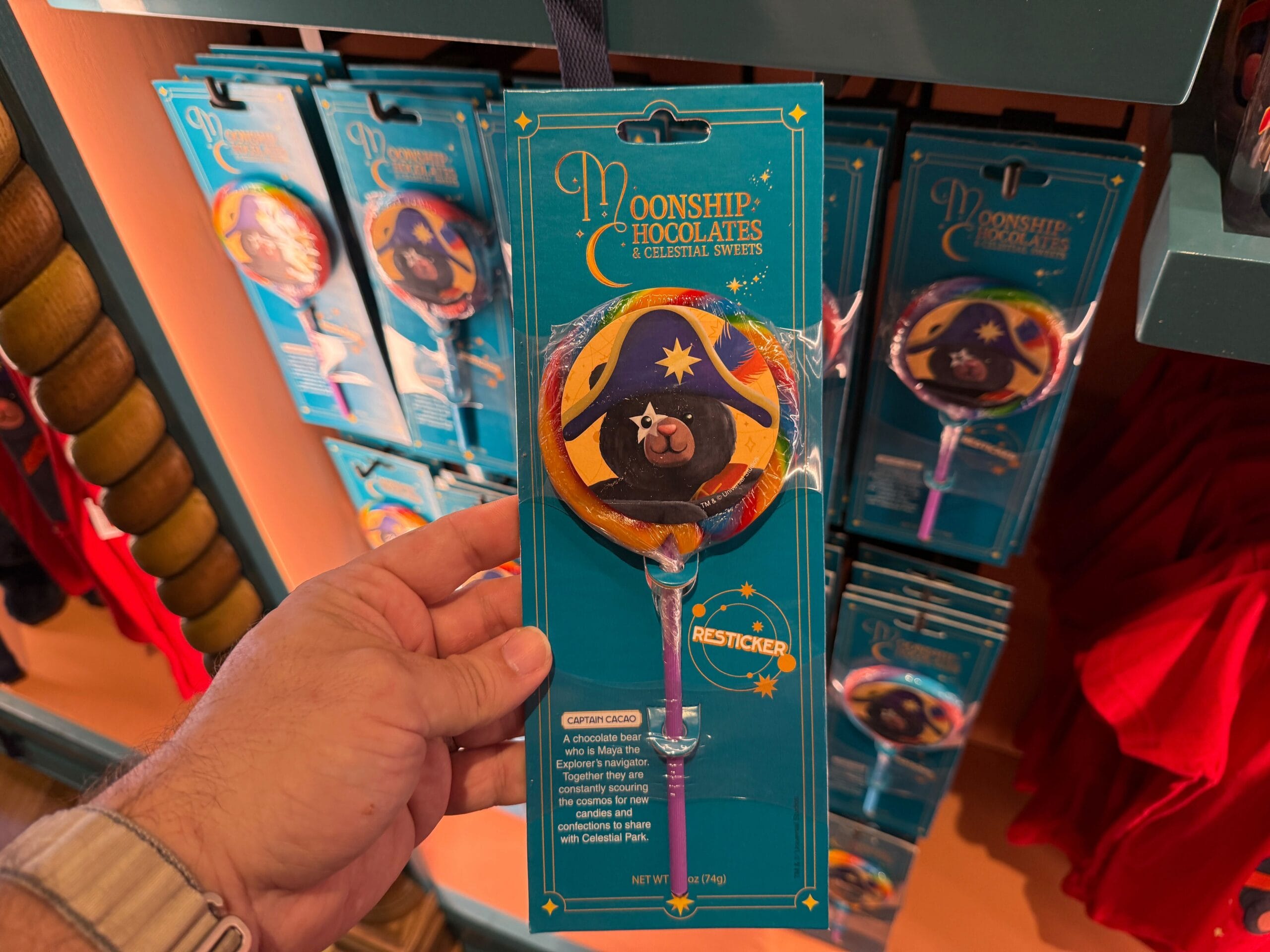 The candy lollipop is rainbow-colored and has an image of Captain Cacao’s face in the middle.